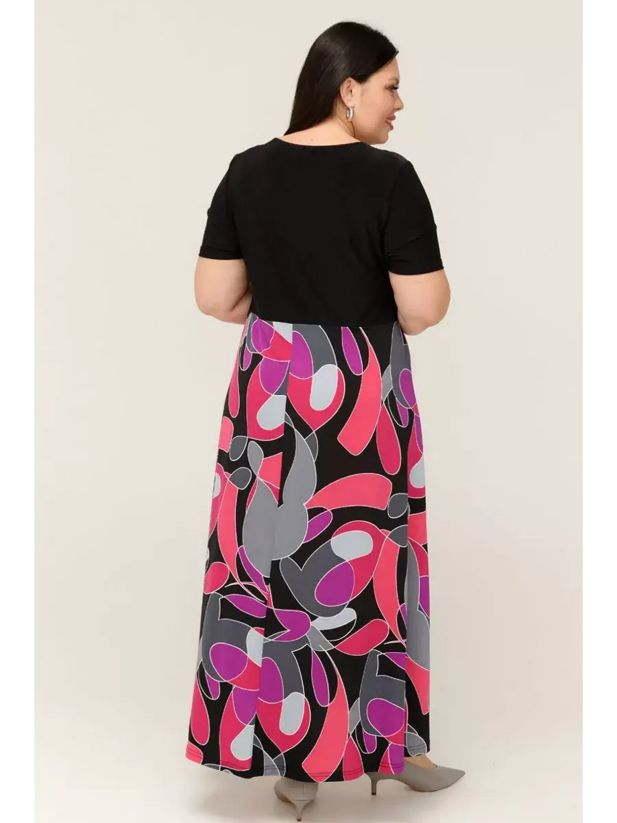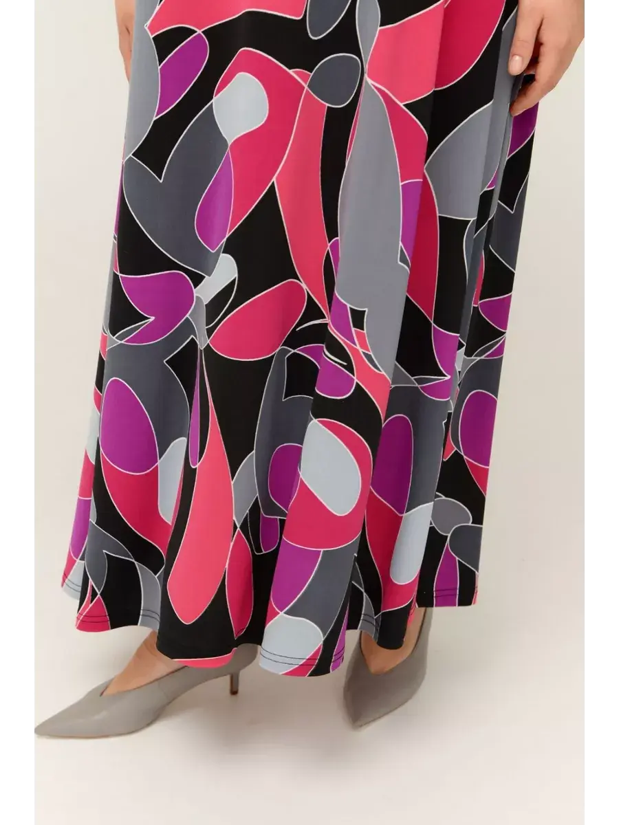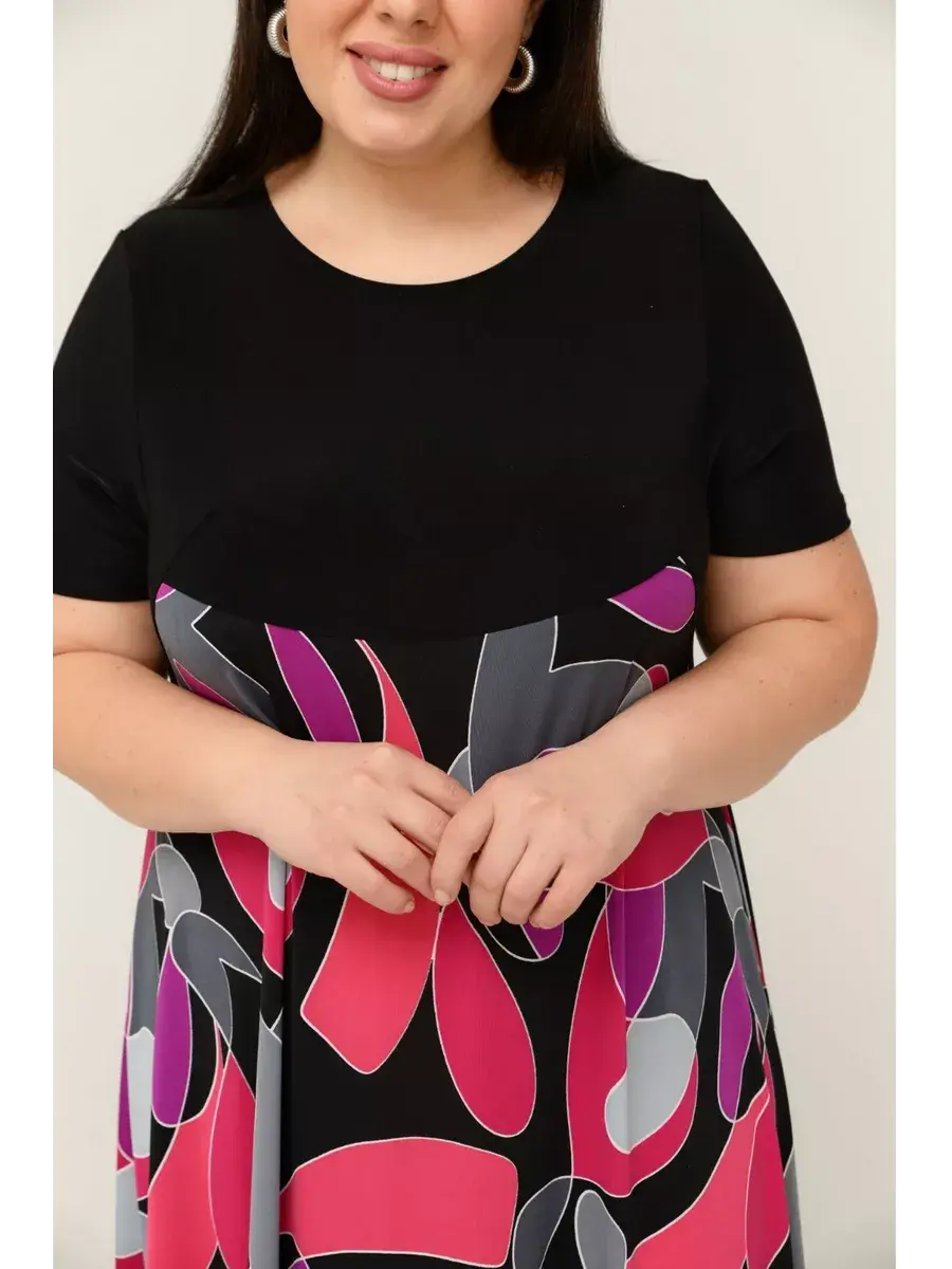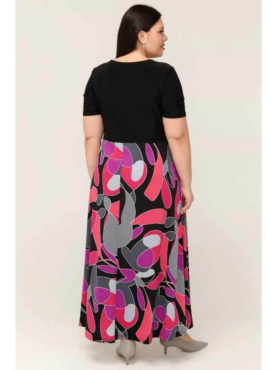 Женское платье больших размеров от бренда OLSI выполнено из трикотажного полотна масло - ткань струится, не мнется, холодит кожу в жаркую погоду. Яркое длинное женское платье на теплую и жаркую погоду позволит выделиться из толпы. Платье летнее длиной макси. Платье скрывает недостатки и подчеркивает преимущества силуэта. Такой эстетичный наряд красиво смотрится на любой фигуре, подойдет для модниц любого возраста. Летнее платье свободного кроя идеально подходит для самых разных случаев. Также его удобно брать с собой в отпуск, поскольку занимает мало места в багаже. Платье женское больших размеров имеет полуприлегающий фасон с расклешенной юбкой, талия слегка завышена. Рукава, полочки спереди и сзади выполнены их однотонного трикотажа, представляя собой контрастный компаньон. Рукава втачные.