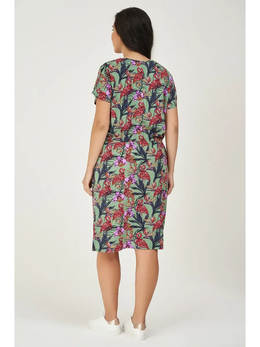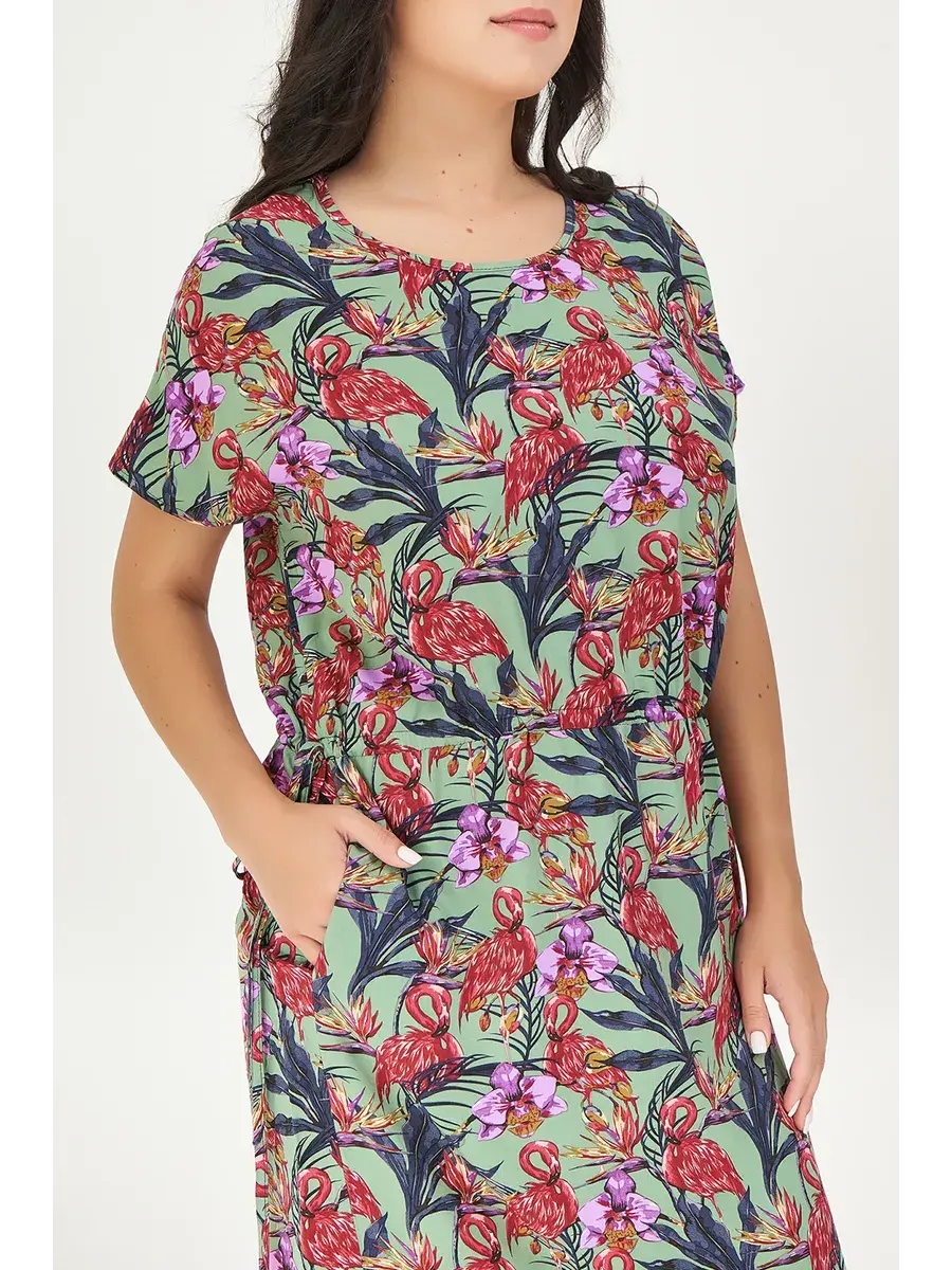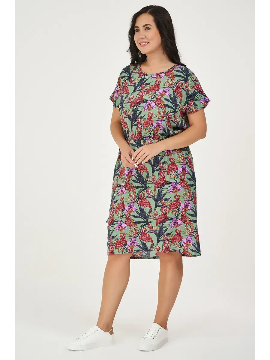 Летнее платье больших размеров прямого силуэта из штапеля, отрезное по линии талии. В платье имеются функциональные карманы в боковых швах. По линии талии втачной пояс на завязках.