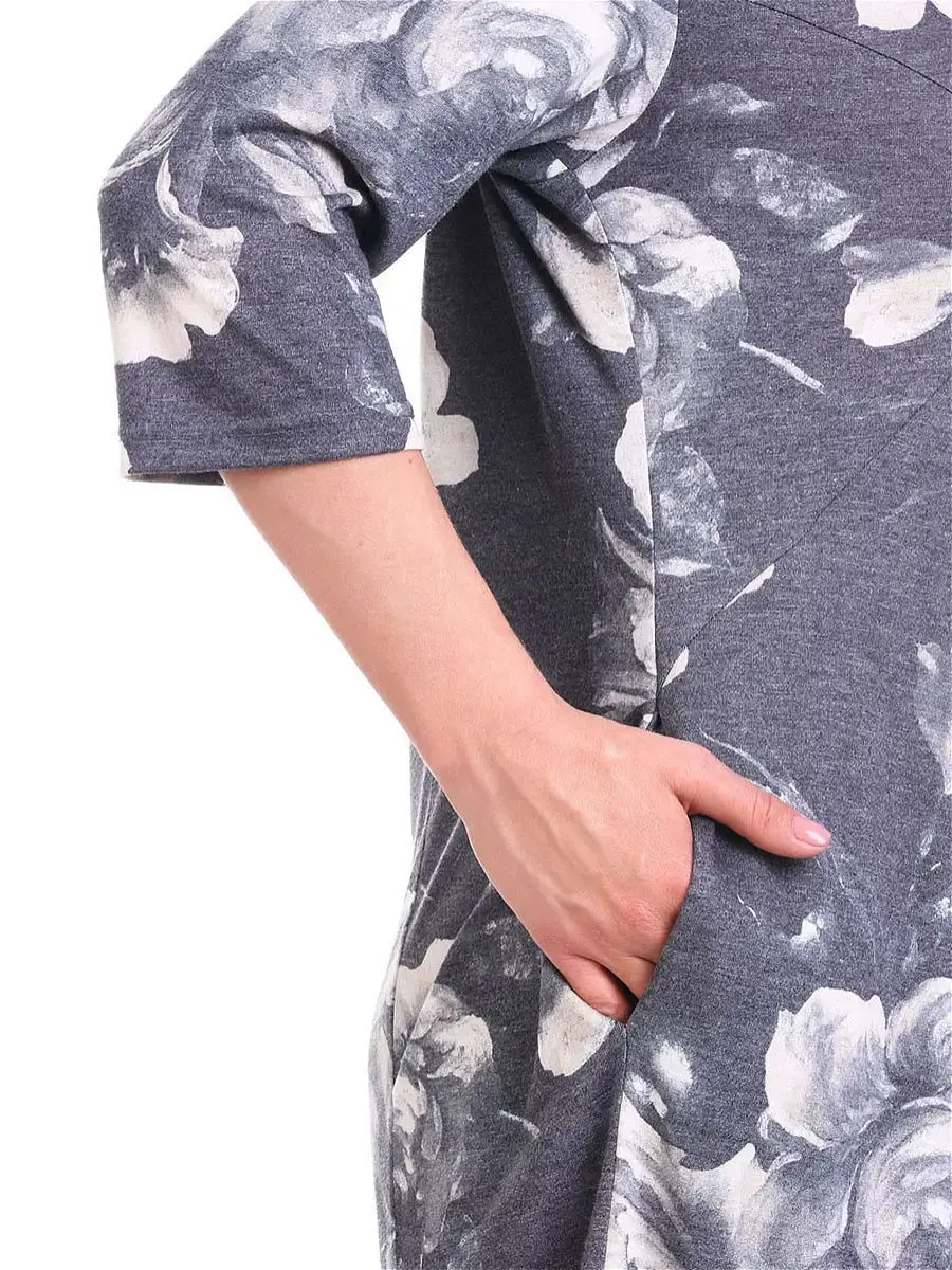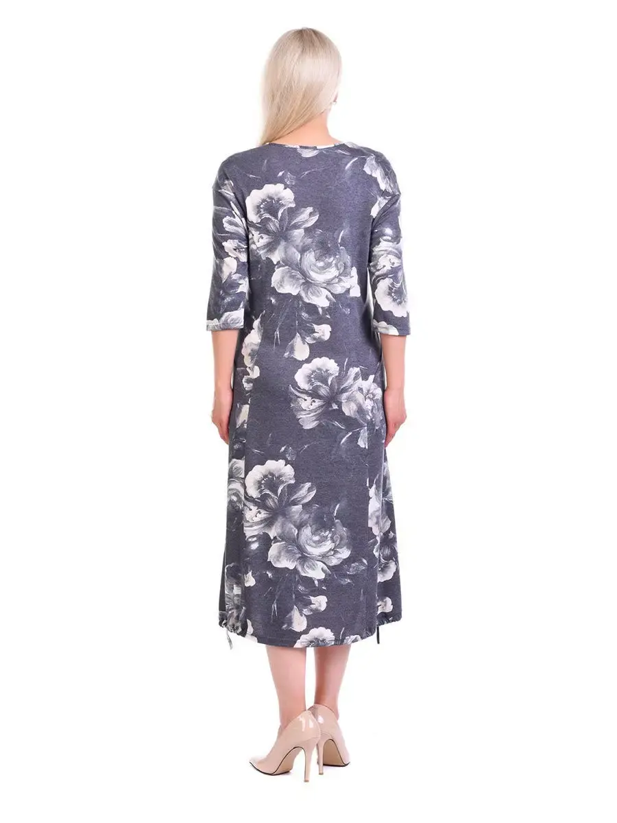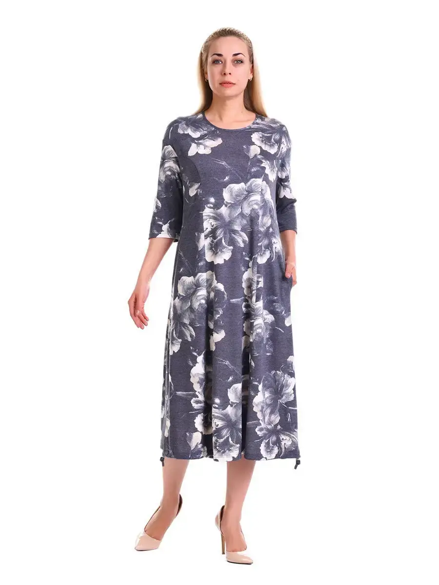 Эффектное платье-бохо длиной миди, из тонкого мягкого трикотажа с крупным цветочным принтом; с округлым вырезом горловины; с отрезными втачными рукавами 3/4 со спущенной проймой; с врезными карманами по бокам.