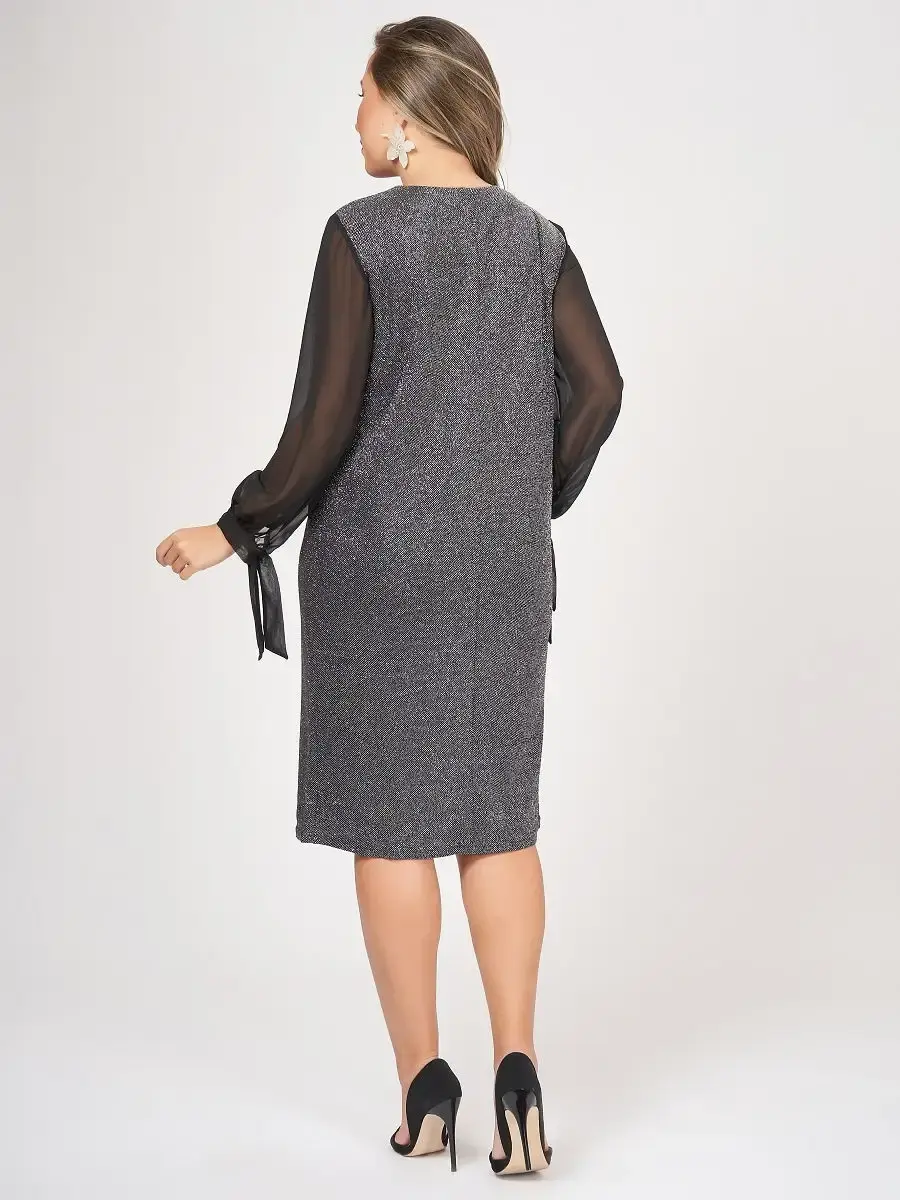 Эффектное нарядное платье, длиной до колен, выполненное в комбинации блестящего трикотажа с люрексом и полупрозрачного шифона. Модель с V-образным вырезом, отрезным лифом с защипами, подчеркивающими линию груди, и шифоновыми втачными рукавами-епископ с манжетами, завязывающимися на банты.