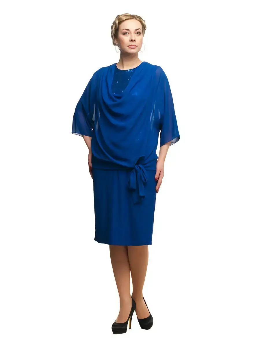 Эффектное праздничное платье-костюм, длиной до середины голени, имитирующее многослойный наряд: однотонную классическую юбку-карандаш, зауженную книзу; блестящий топ-чехол с пайетками; без рукавов; с круглым вырезом горловины и верхнюю блузу из прозрачного шифона. Воздушный верх с легким напуском, манжетом, завязывающимся на бедрах; с широкими цельнокроеными рукавами 3/4, отделанными опиковкой; воротником хомут; защипами по линии плеча, мягко драпирующими ткань и придающими модели невесомость.