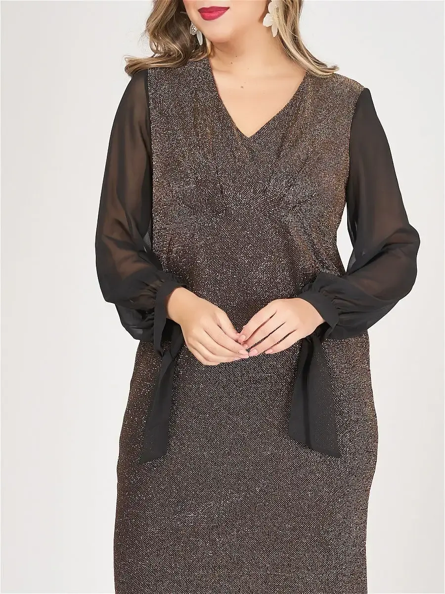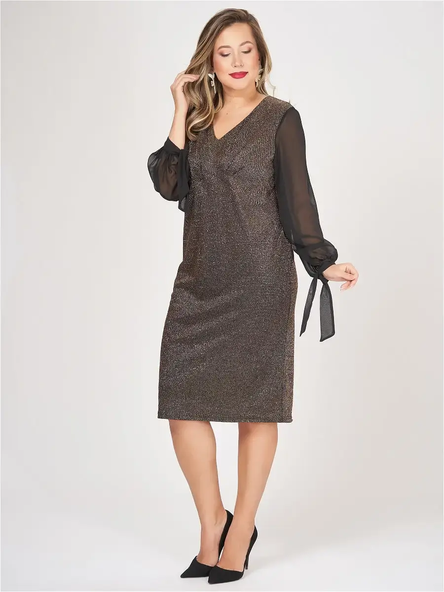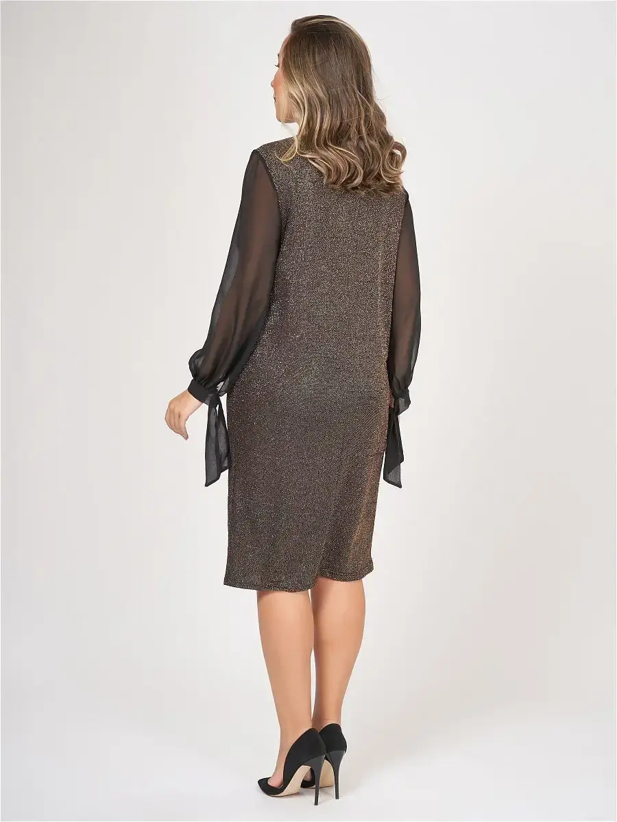 Эффектное нарядное платье, длиной до колен, выполненное в комбинации блестящего трикотажа с люрексом и полупрозрачного шифона. Модель с V-образным вырезом, отрезным лифом с защипами, подчеркивающими линию груди, и шифоновыми втачными рукавами-епископ с манжетами, завязывающимися на банты.