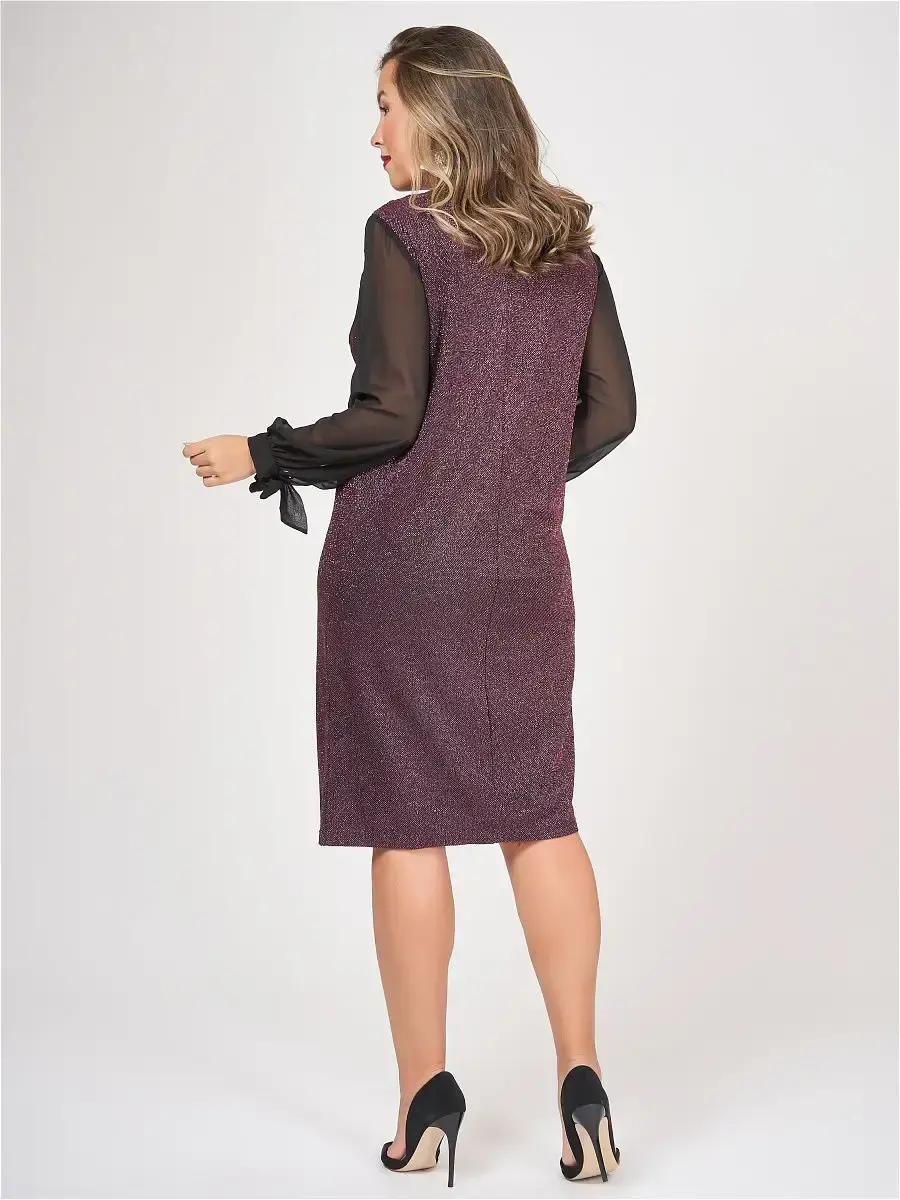 Эффектное нарядное платье, длиной до колен, выполненное в комбинации блестящего трикотажа с люрексом и полупрозрачного шифона. Модель с V-образным вырезом, отрезным лифом с защипами, подчеркивающими линию груди, и шифоновыми втачными рукавами-епископ с манжетами, завязывающимися на банты.