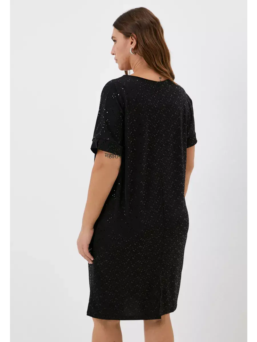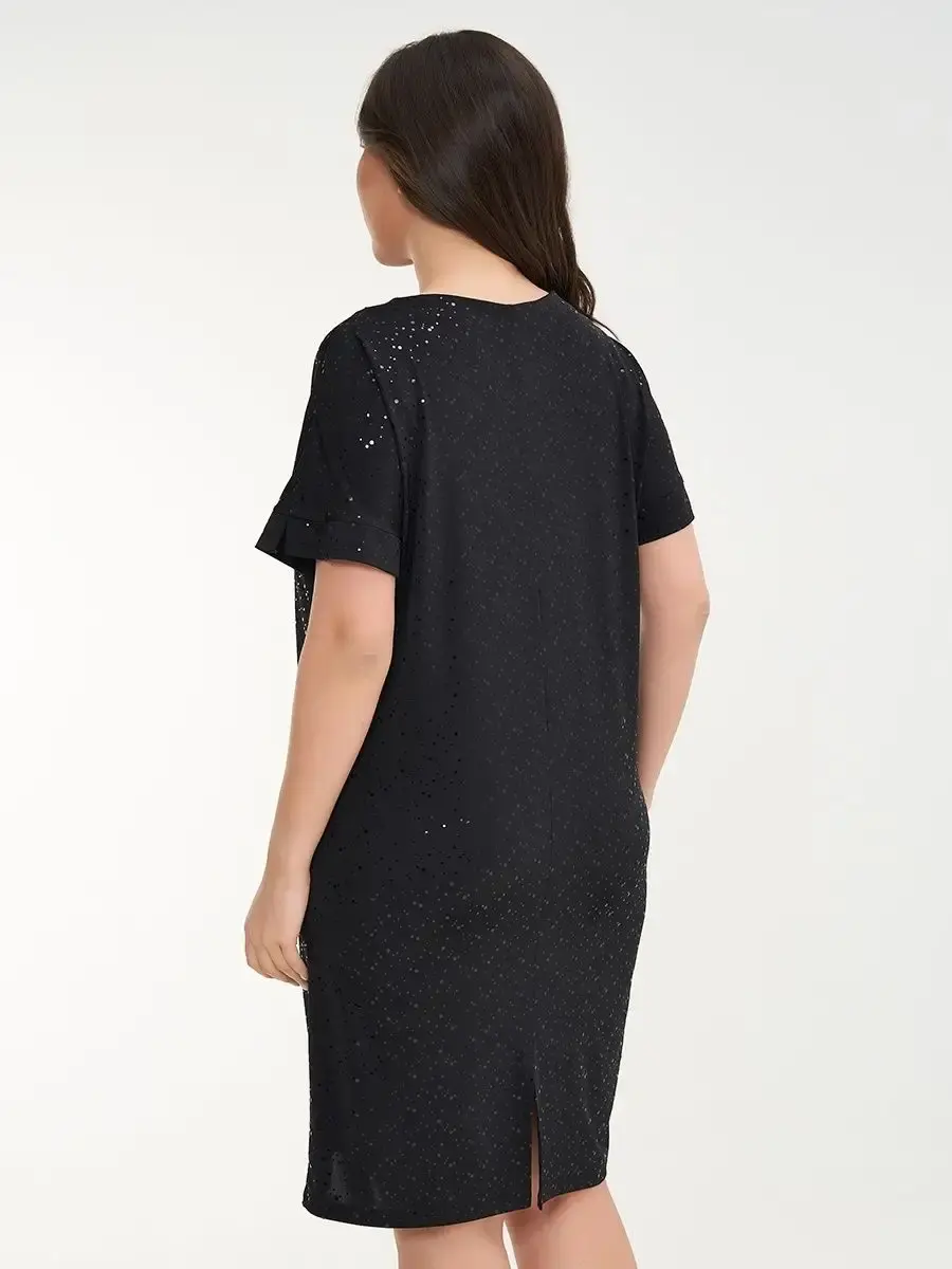Платье прямого кроя выполнено из ткани масло с пайетками, что обеспечивает приятное прикосновение и эластичность материала. Качественная ткань не мнётся и не растягивается, сохраняя форму и цвет.