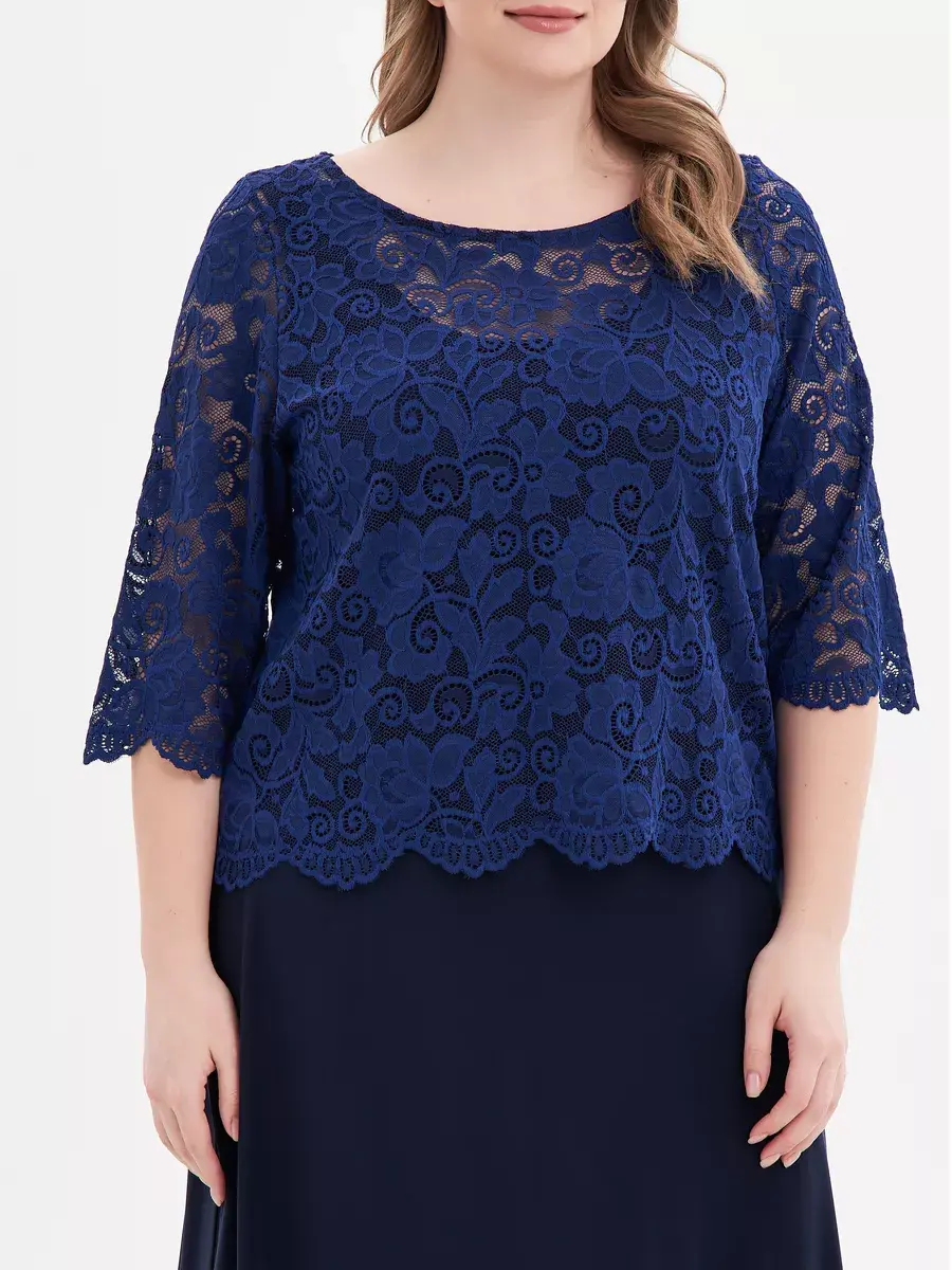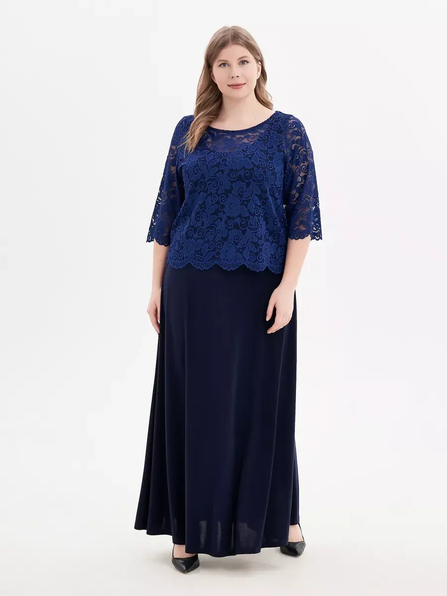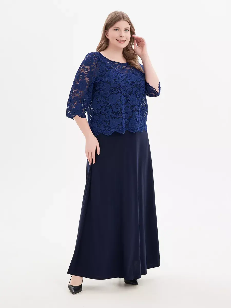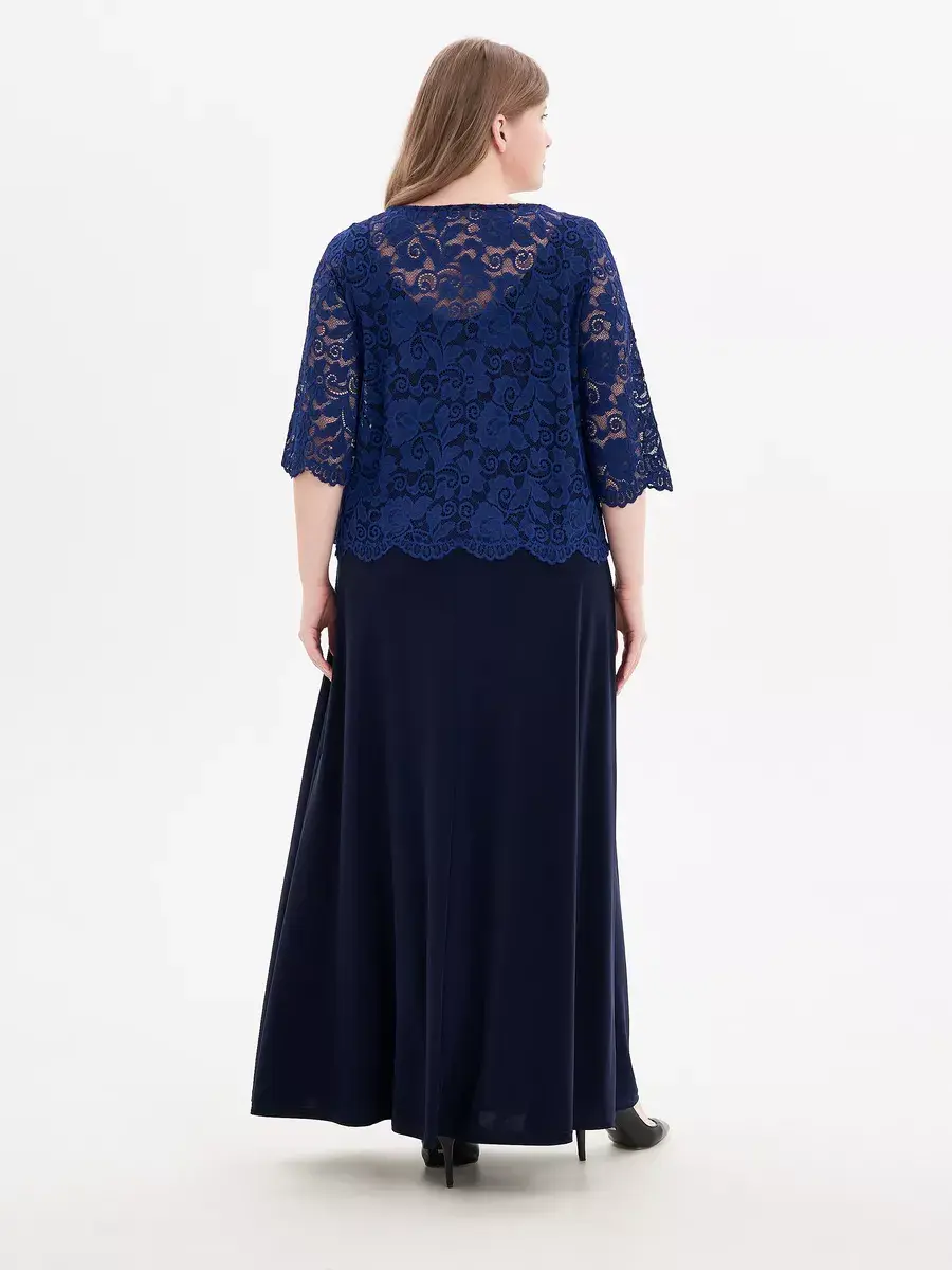 Эффектное многослойное платье макси, выполненное в комбинации струящегося трикотажа-масло и гипюра. Верх изделия в виде кружевного болеро с ажурным низом и обшлагами рукавов 3/4; с круглым вырезом горловины, надетого на полуприлегающий сарафан с глубоким вырезом «подкова» спереди и сзади. Модель придает образу женственность и мягкость, зрительно удлиняет ноги, делает силуэт грациозным. Драпировка нижней части изделия скрадывает формы.