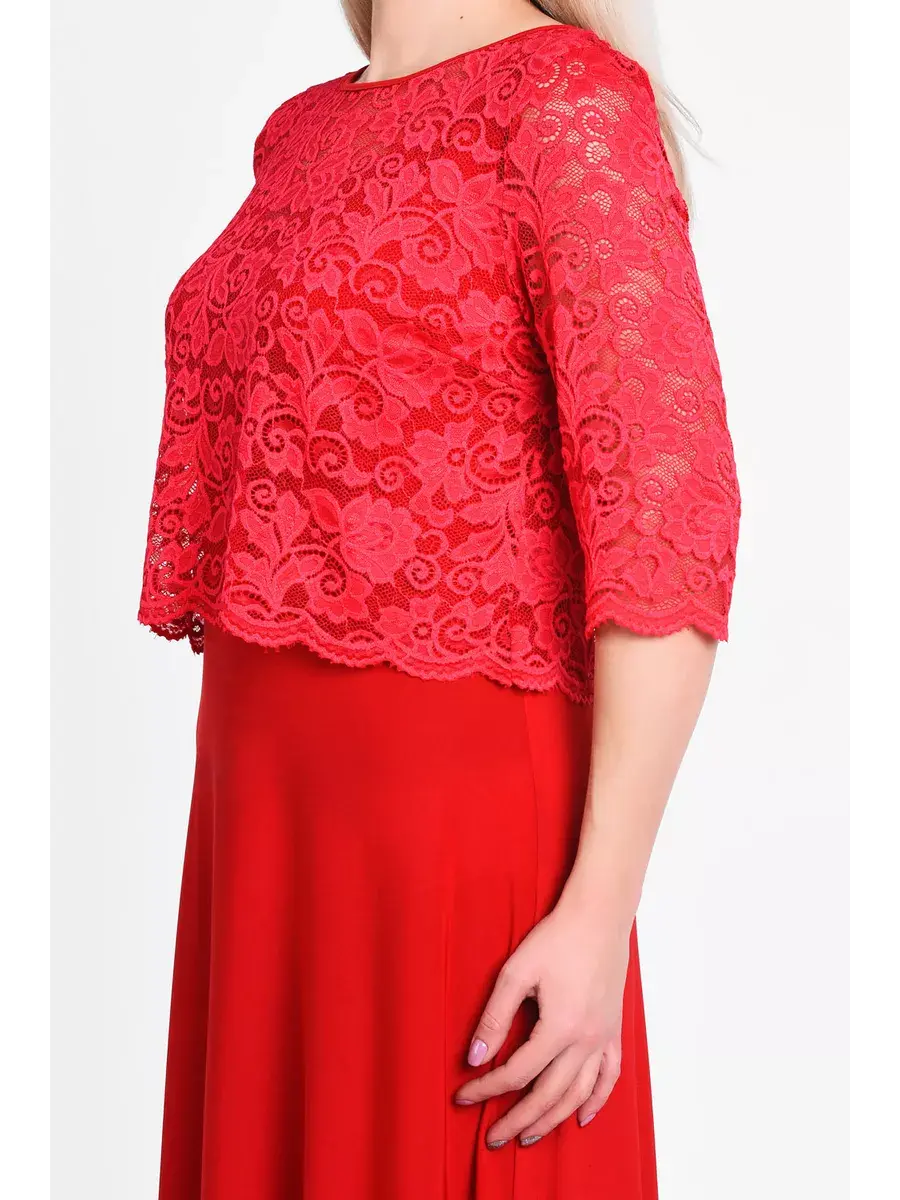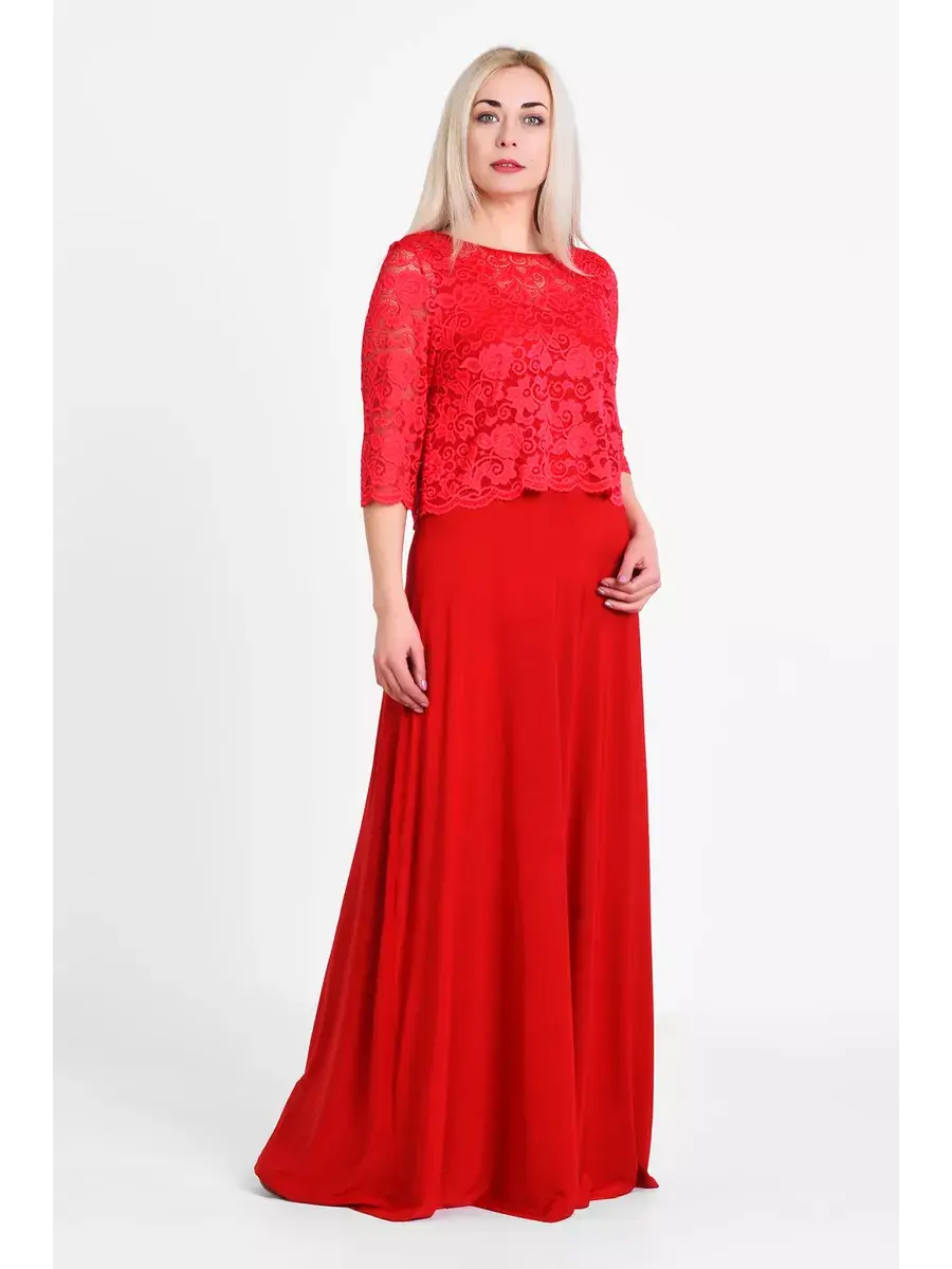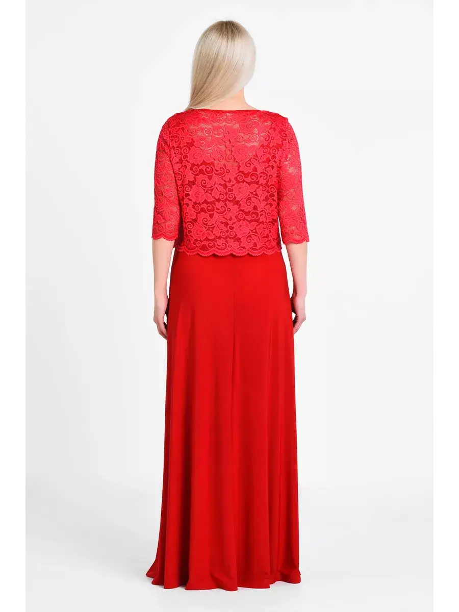 Эффектное многослойное платье макси, выполненное в комбинации струящегося трикотажа-масло и гипюра. Верх изделия в виде кружевного болеро с ажурным низом и обшлагами рукавов 3/4; с круглым вырезом горловины, надетого на полуприлегающий сарафан с глубоким вырезом «подкова» спереди и сзади. Модель придает образу женственность и мягкость, зрительно удлиняет ноги, делает силуэт грациозным. Драпировка нижней части изделия скрадывает формы.