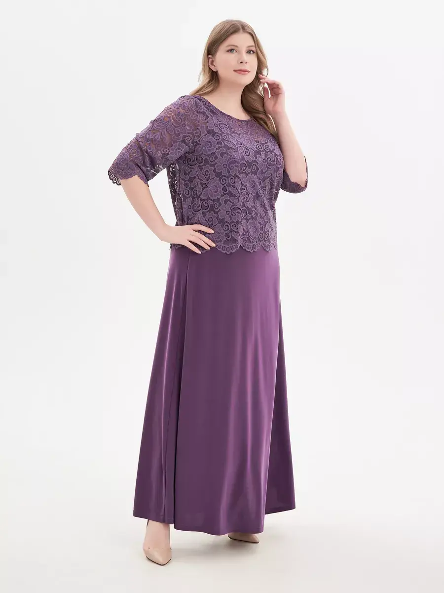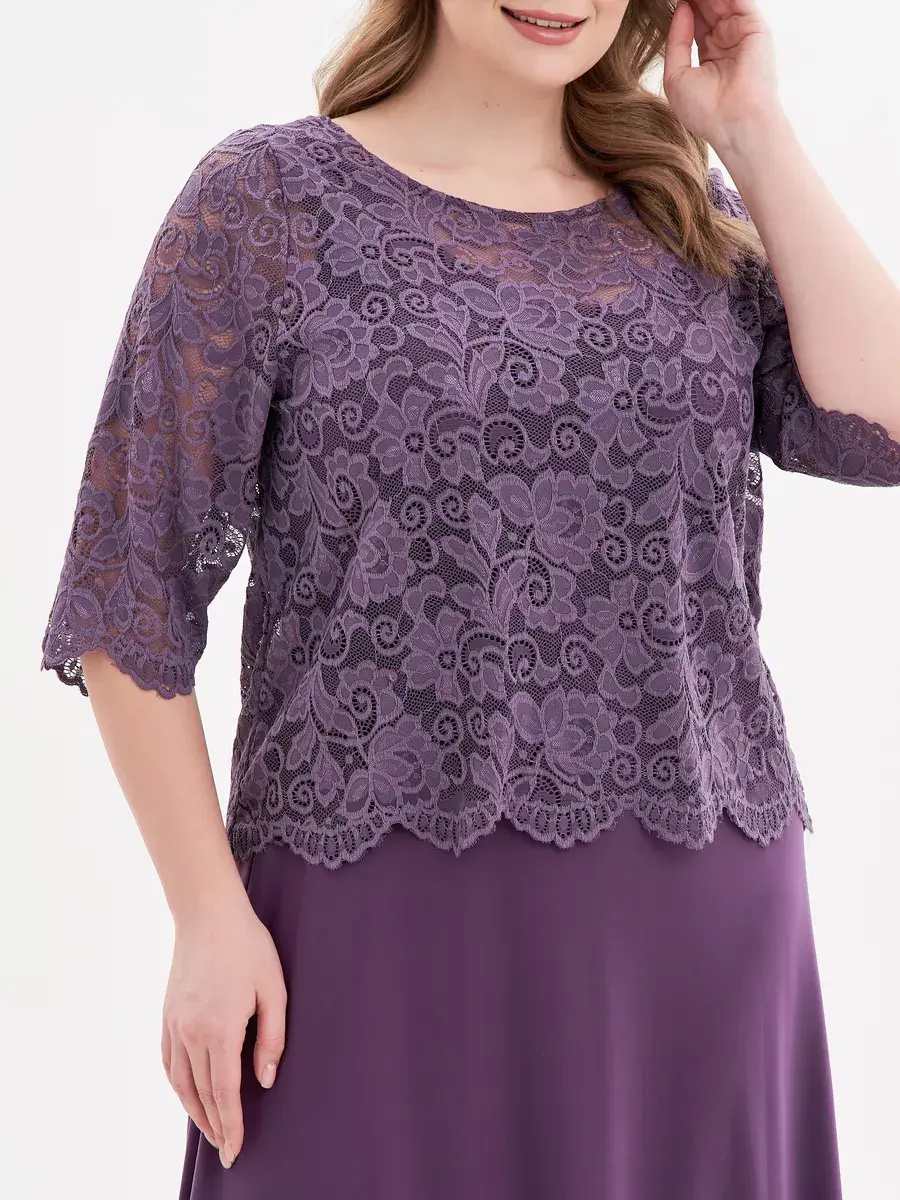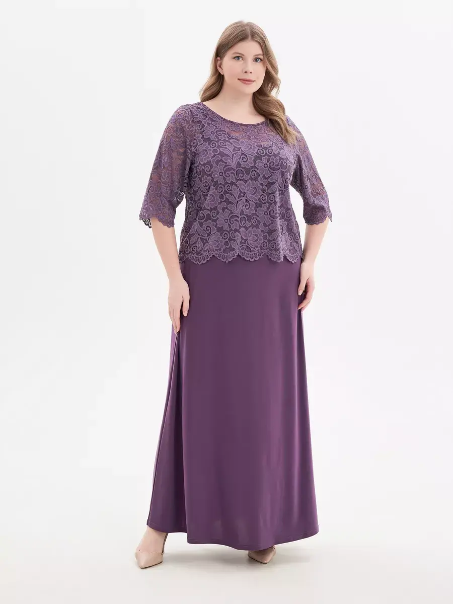 Эффектное многослойное платье макси, выполненное в комбинации струящегося трикотажа-масло и гипюра. Верх изделия в виде кружевного болеро с ажурным низом и обшлагами рукавов 3/4; с круглым вырезом горловины, надетого на полуприлегающий сарафан с глубоким вырезом «подкова» спереди и сзади. Модель придает образу женственность и мягкость, зрительно удлиняет ноги, делает силуэт грациозным. Драпировка нижней части изделия скрадывает формы.
