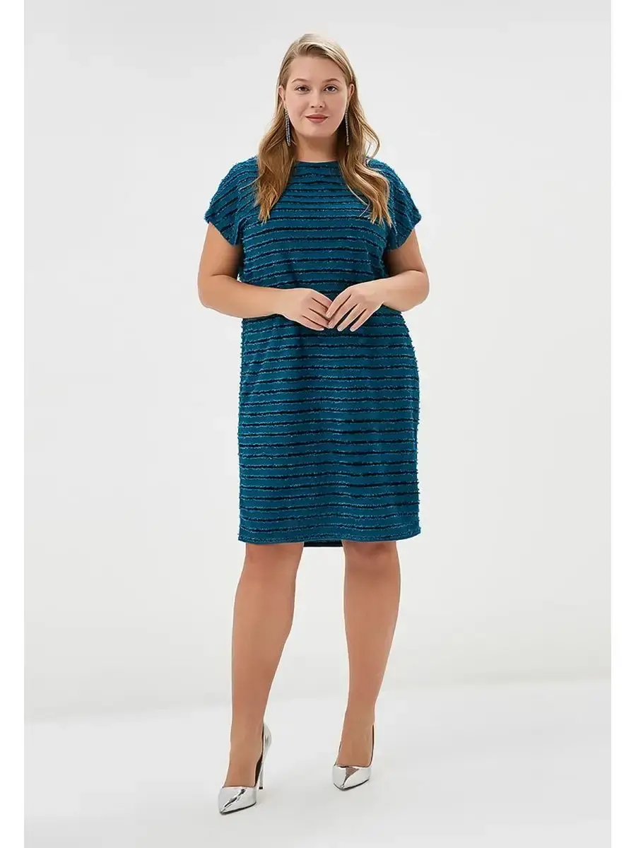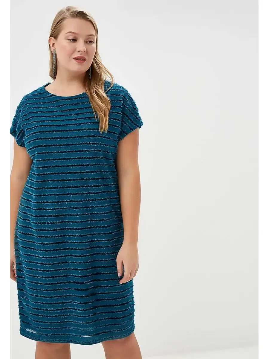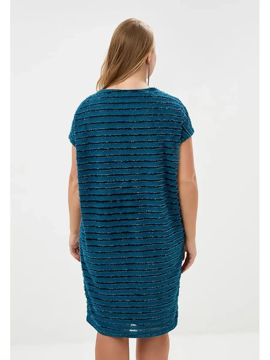 Стильное платье из ткани, имитирующей горизонтальную полоску из плотного материала с необработанными краями, нашитого на тонкую трикотажную основу. Модель свободного лаконичного кроя; длиной до колен; с короткими рукавами - крылышко со спущенной проймой; круглым вырезом горловины.
