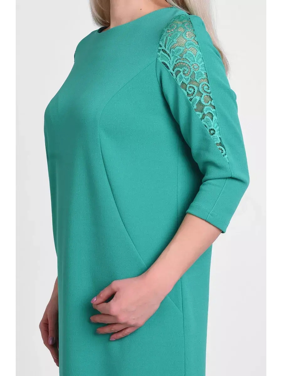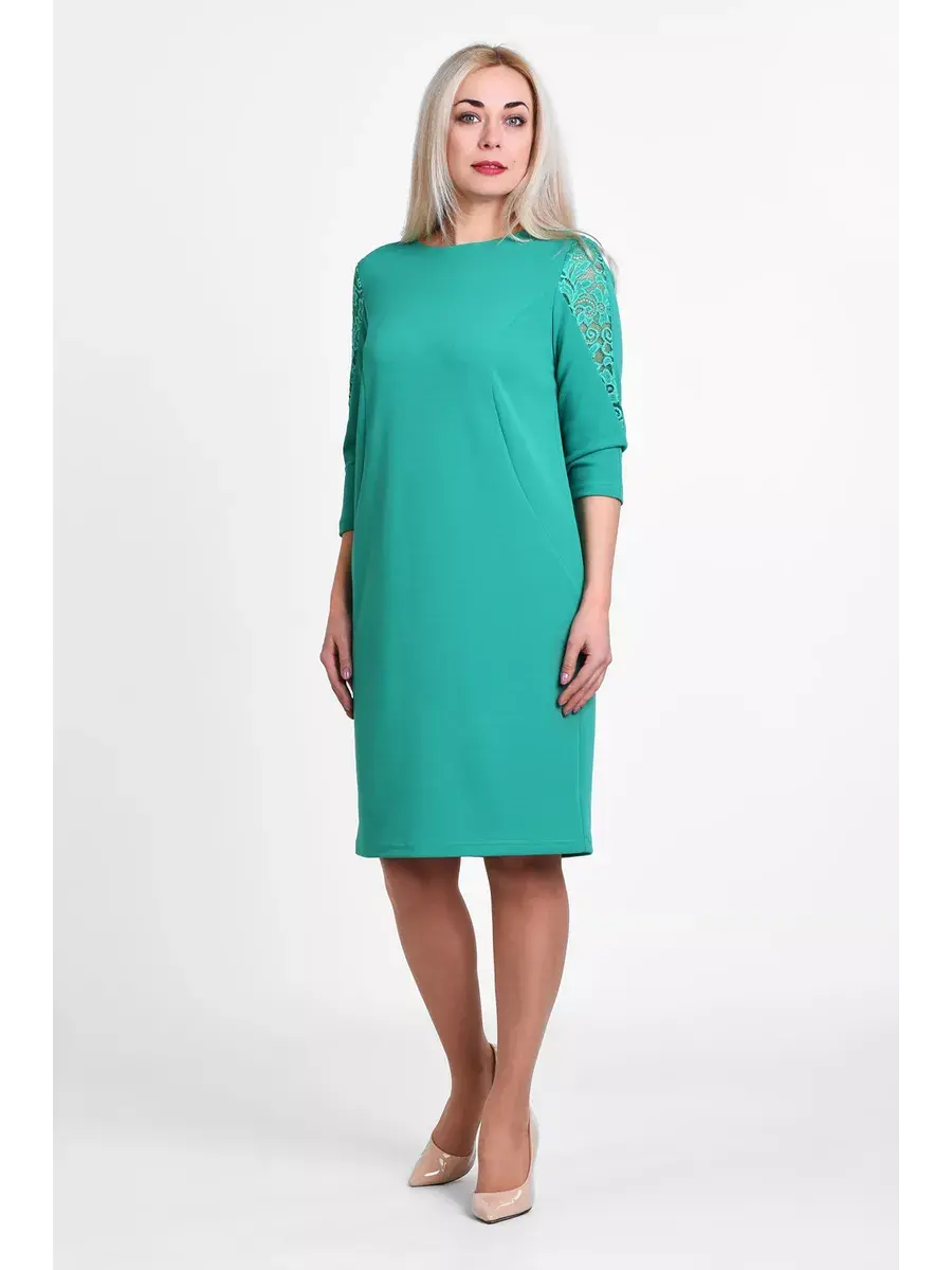 Нарядное стильное платье длиной до колен, из плотного трикотажа со вставками из ажурного гипюра. Модель с втачными рукавами 3/4, круглым вырезом горловины. Длина по спинке от 100см до 105,5 см в зависимости от размера. Длина рукава 38см.