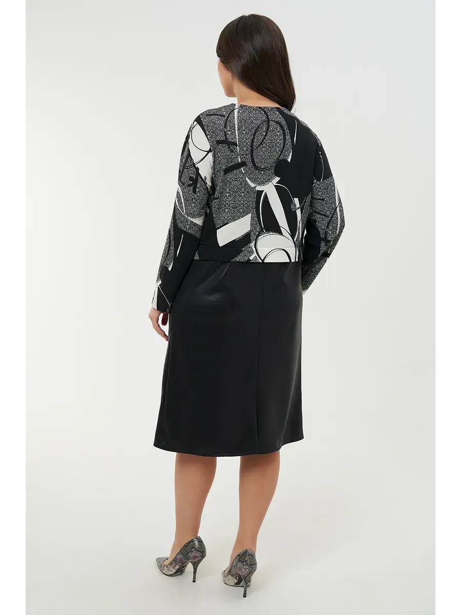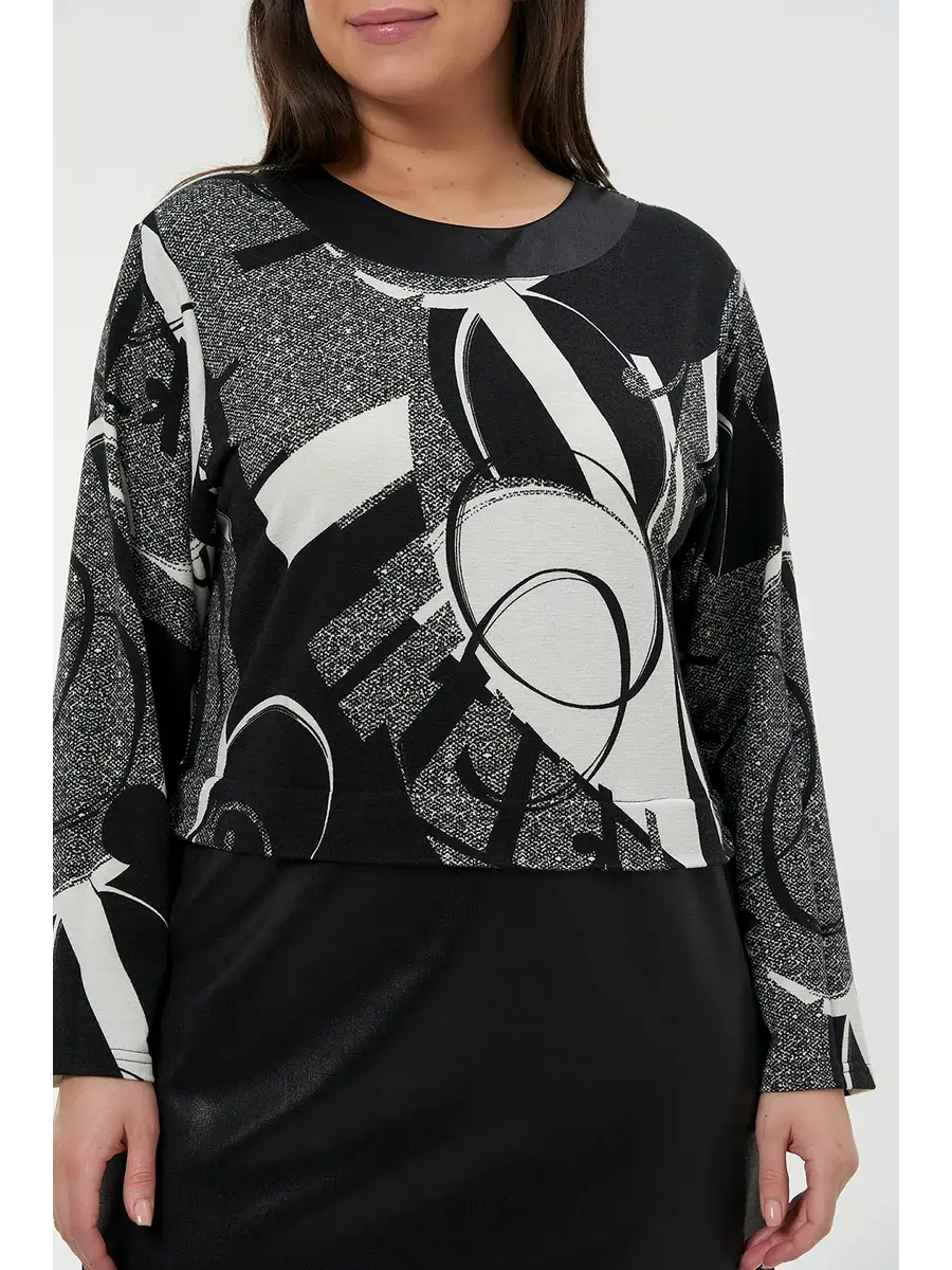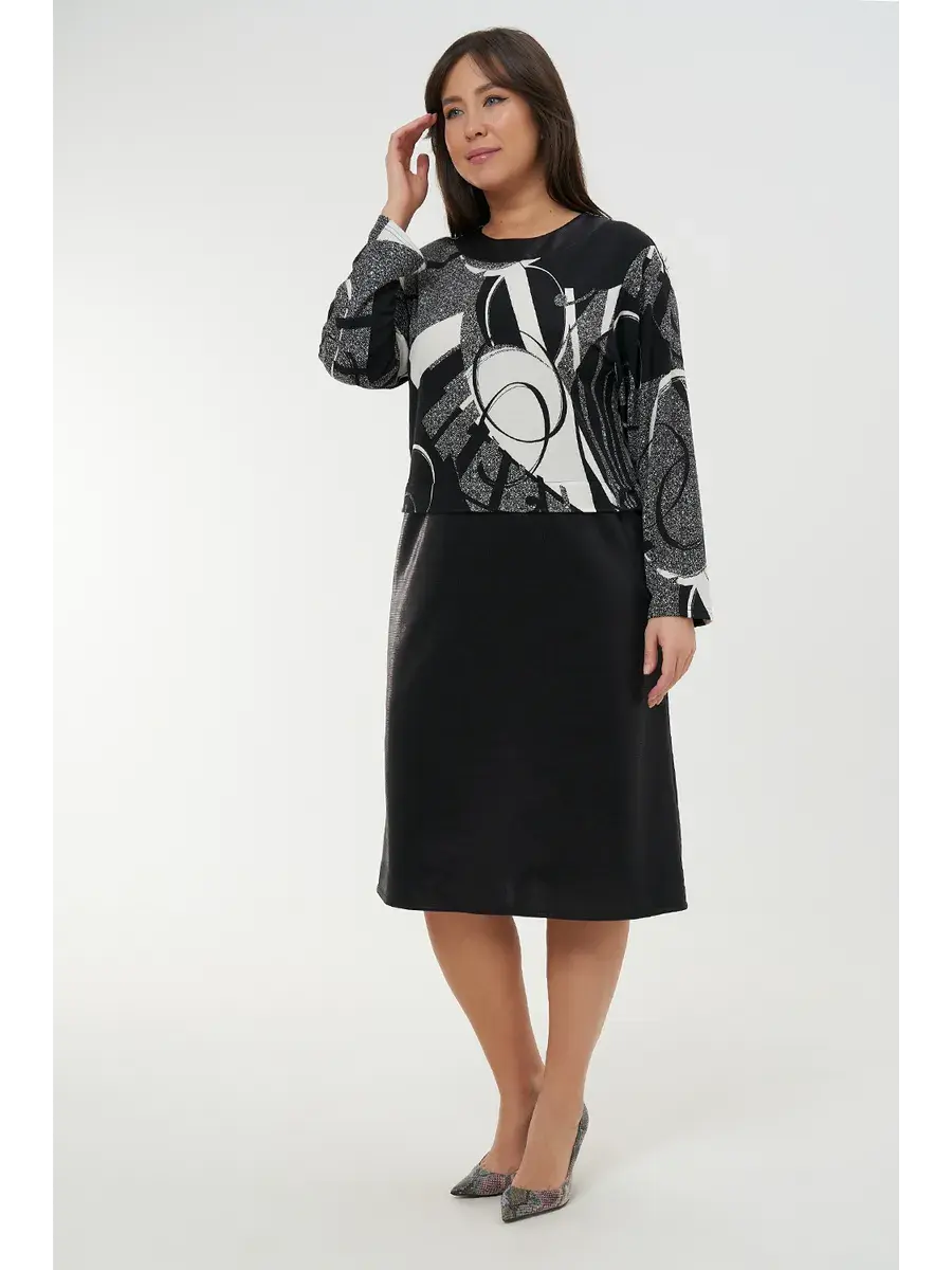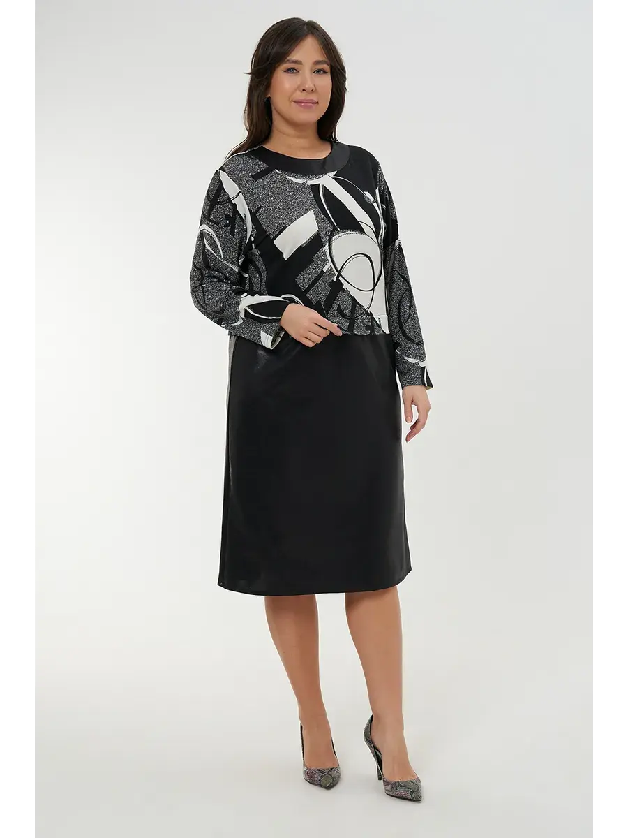 Женское платье больших размеров от бренда OLSI прямого кроя с длинным рукавом. Верх платья выполнен из трикотажного полотна, низ выполнен из плотного полотна с эластаном по типу имитации кожи с блеском.