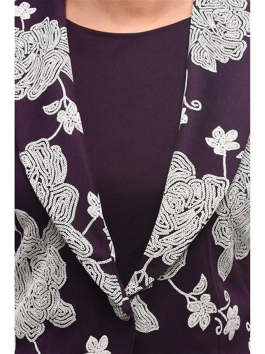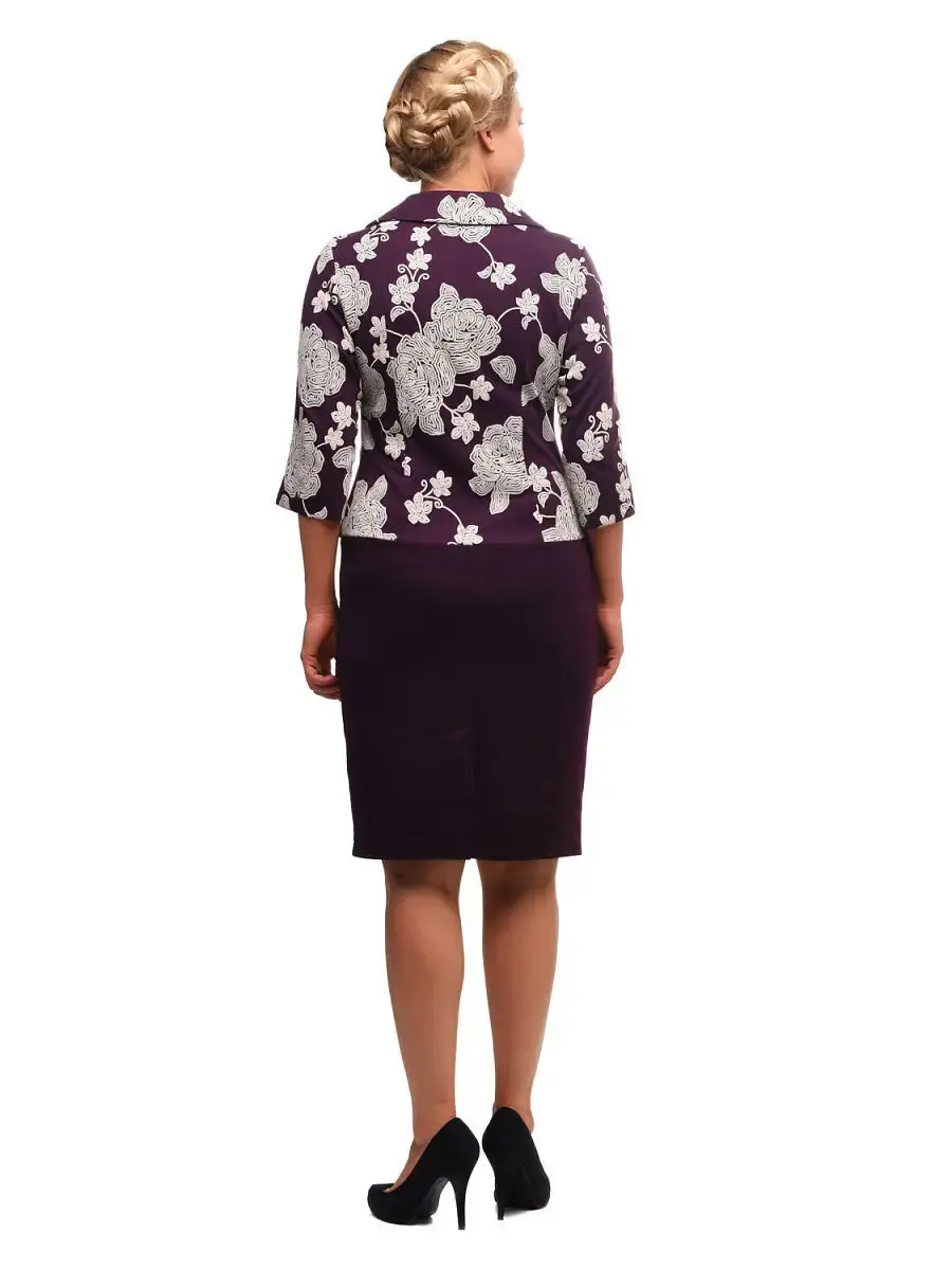 Элегантный костюм-имитация однотонного платья-футляр длиной до колен, с округлым вырезом горловины и приталенного короткого жакета из ткани с рельефным цветочным принтом; узкими втачными рукавами 3/4, с открытыми разрезами манжетами; шалевым воротником и застежкой на среднюю пуговицу. Модель подчеркивает мягкость и красоту линий, эффектно преподносит достоинства фигуры и нивелирует нюансы. Придает образу романтичность и элегантность.