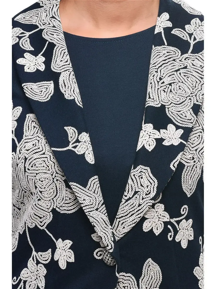 Элегантный костюм-имитация однотонного платья-футляр длиной до колен, с округлым вырезом горловины и приталенного короткого жакета из ткани с рельефным цветочным принтом; узкими втачными рукавами 3/4, с открытыми разрезами манжетами; шалевым воротником и застежкой на среднюю пуговицу. Модель подчеркивает мягкость и красоту линий, эффектно преподносит достоинства фигуры и нивелирует нюансы. Придает образу романтичность и элегантность.