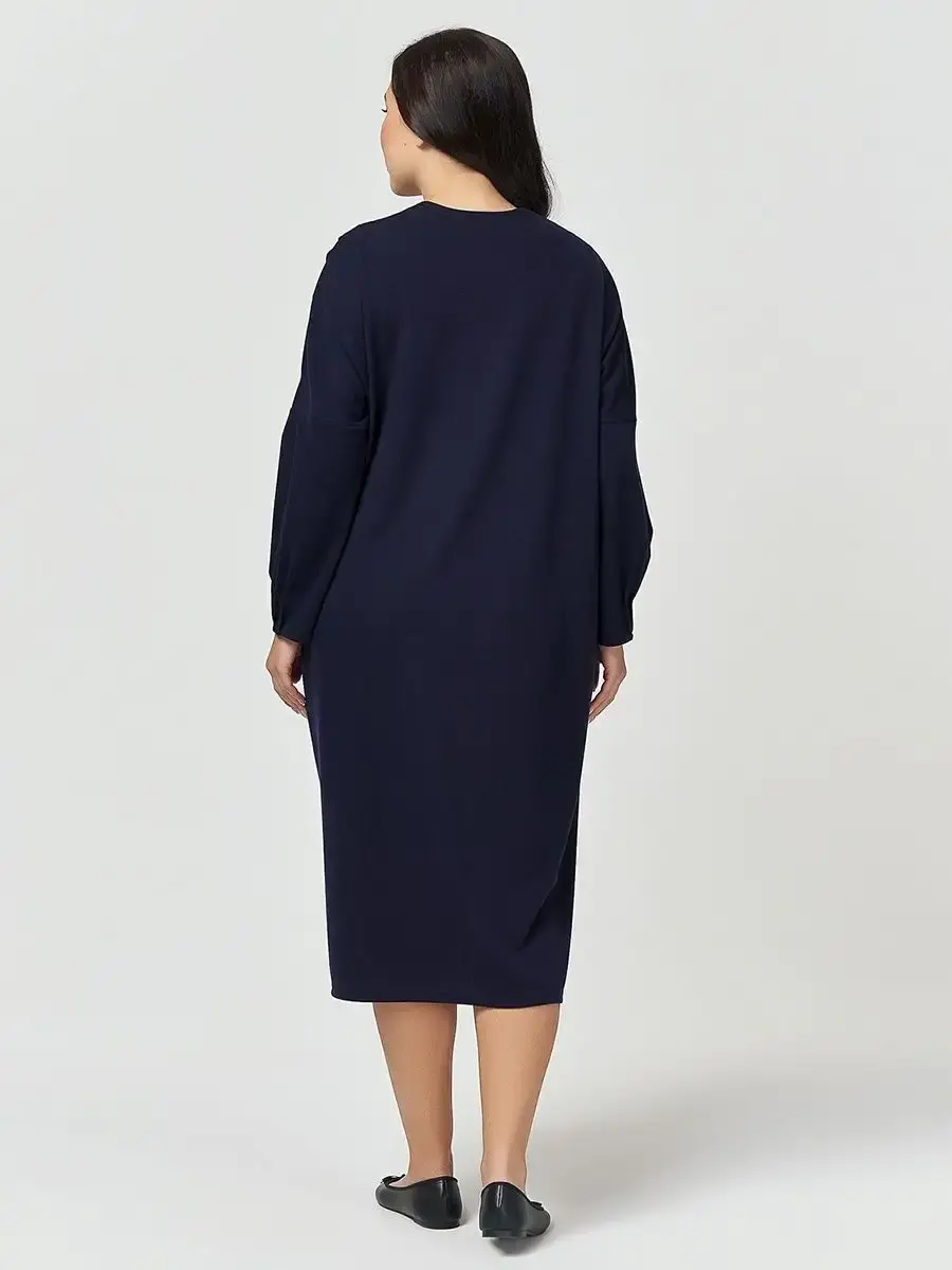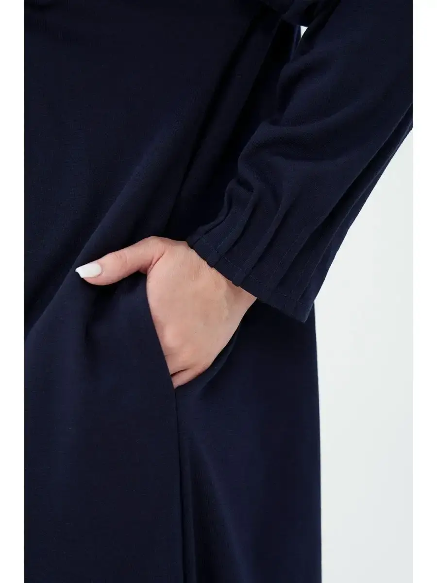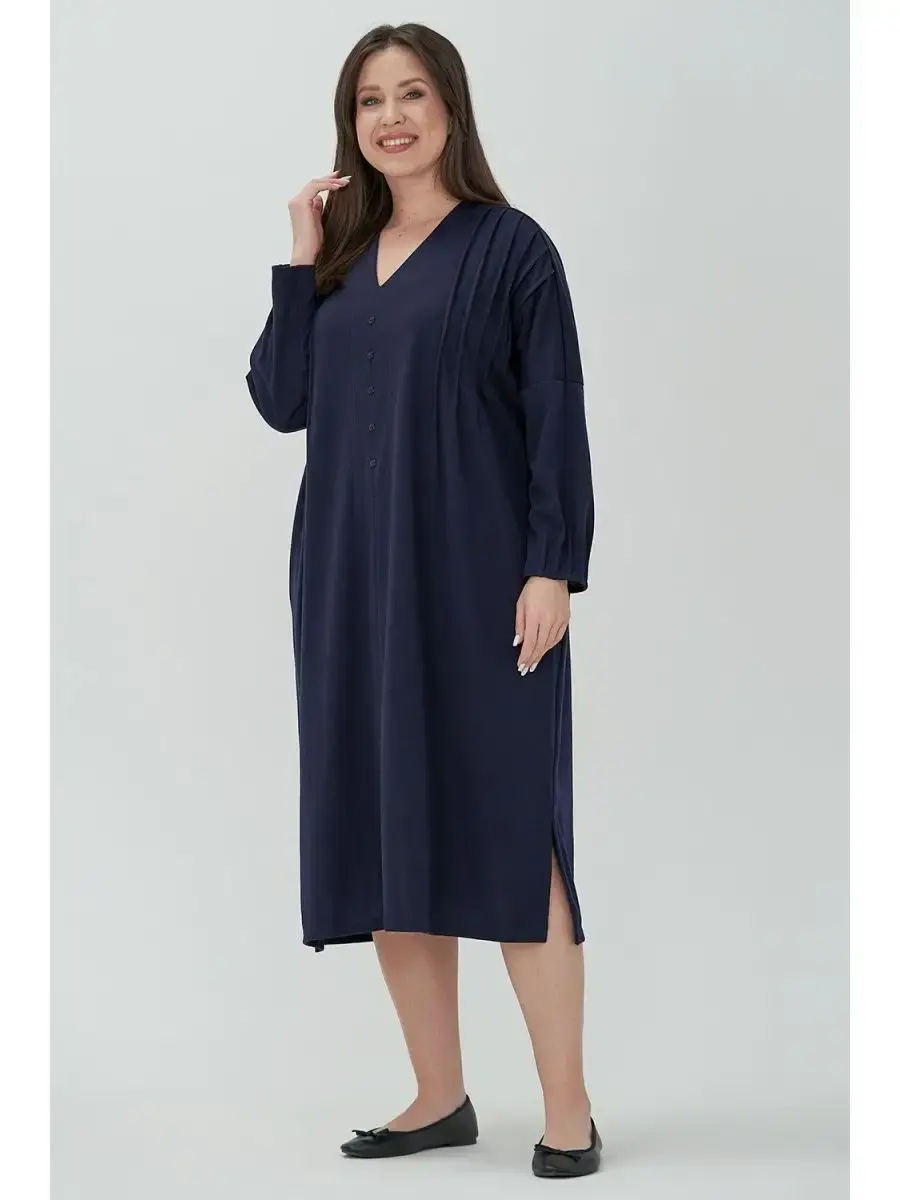 Просторное, уютное и комфортное женское платье большого размера с V-образным вырезом, длинными рукавами, и карманами в боковых швах. Выполнено из плотного трикотажного полотна с эластаном. Длина изделия по спинке от 115см в р.48-50 до 120см в р.70, длина рукава 60см.