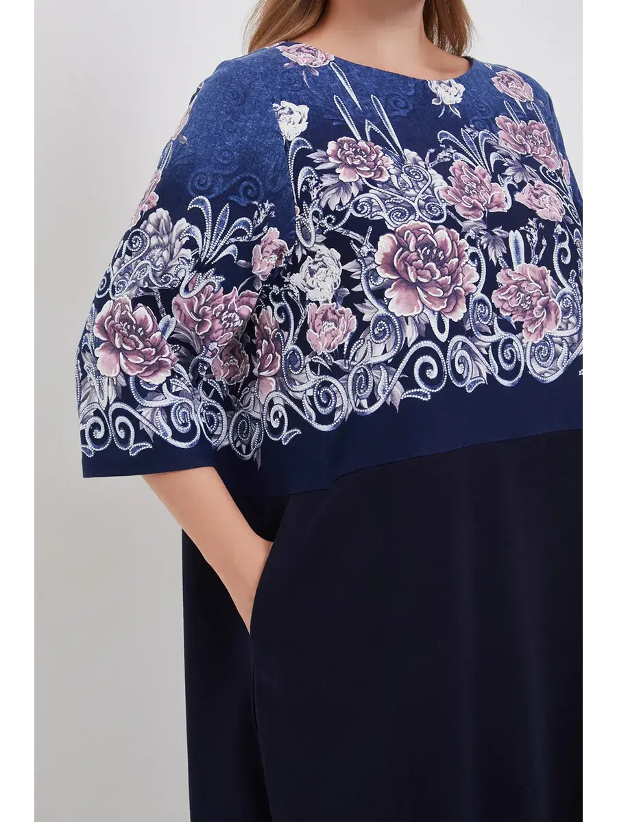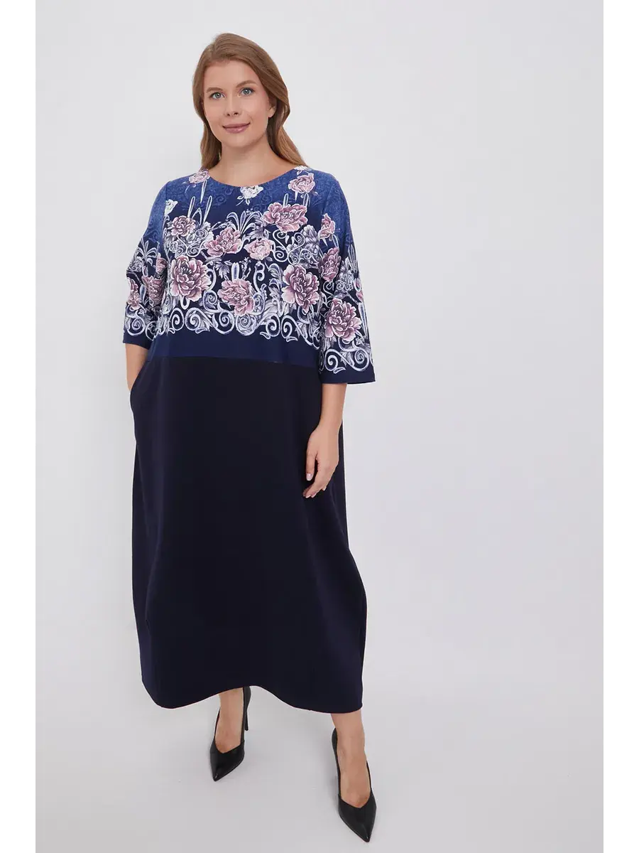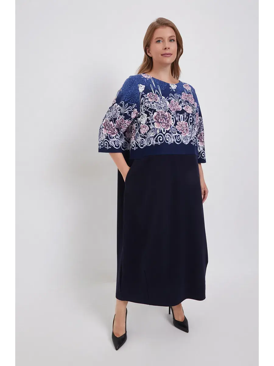 Элегантное трикотажное платье больших размеров с цветочным принтом и однотонным низом — это одежда, которая подойдёт каждой женщине и подчеркнёт её женственность и утончённый вкус.