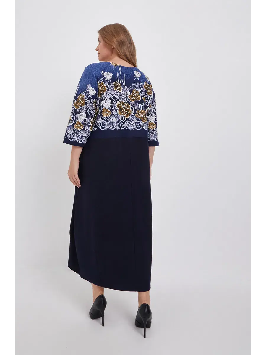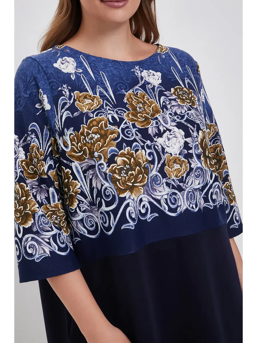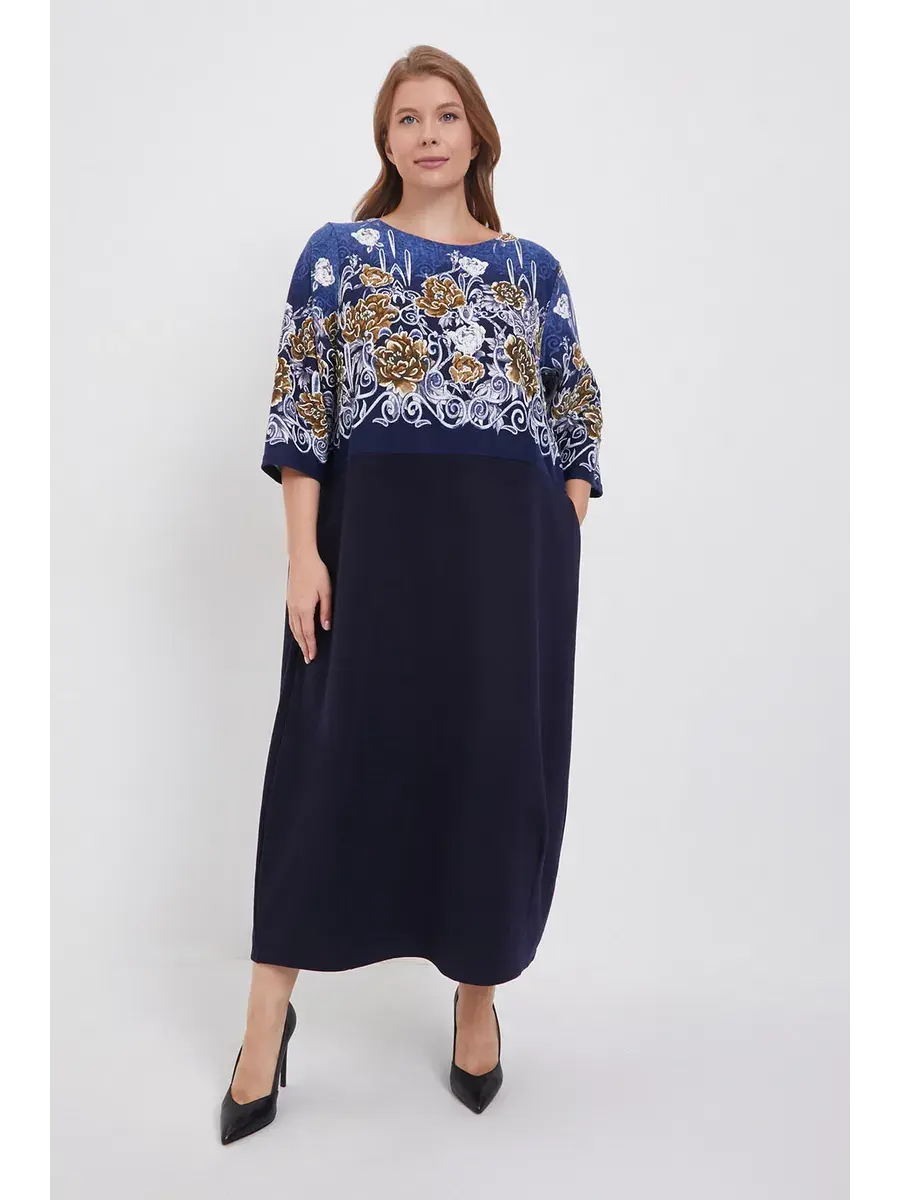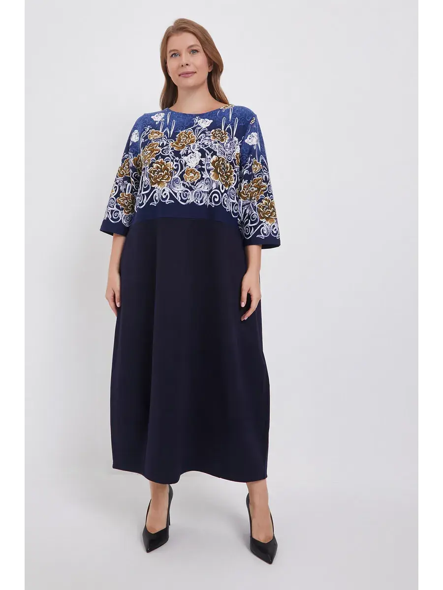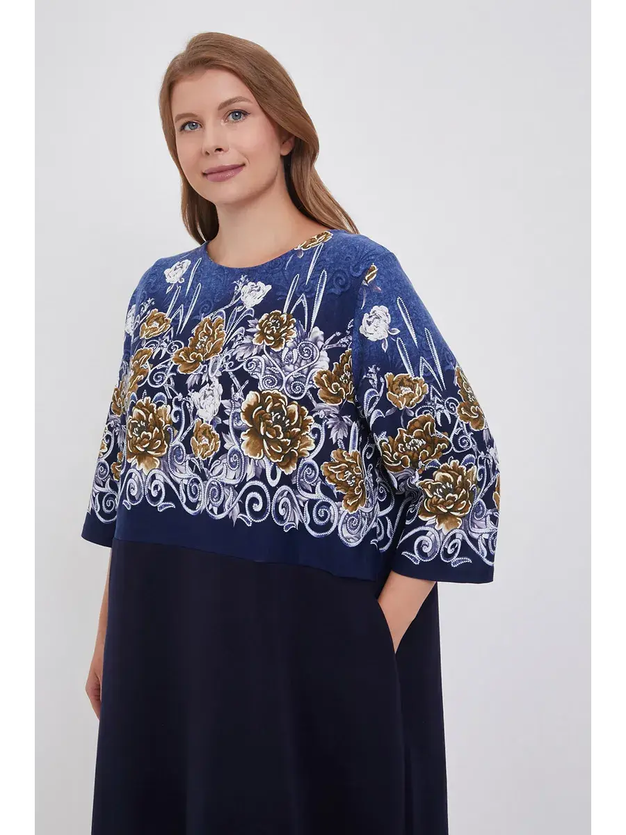 Элегантное трикотажное платье больших размеров с цветочным принтом и однотонным низом — это одежда, которая подойдёт каждой женщине и подчеркнёт её женственность и утончённый вкус.