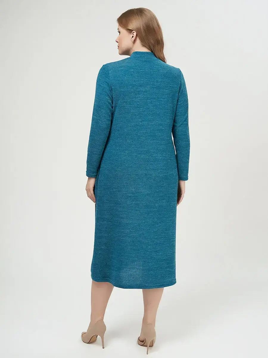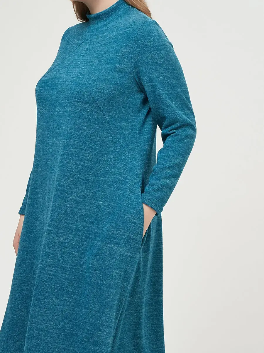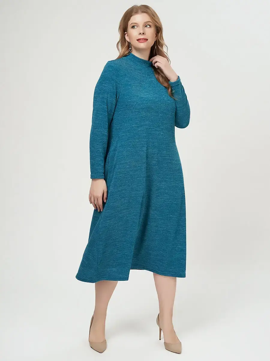 Стильное платье до середины голени из воздушного трикотажа – меланж. Модель, расклешенная книзу, с длинными втачными рукавами, воротником-стойкой, врезными боковыми карманами.