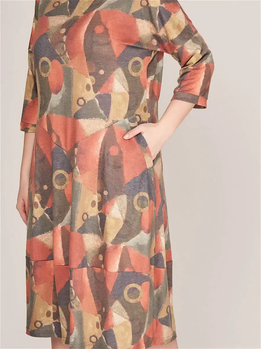 Эффектное платье до середины голени, из тонкого трикотажа с вискозой, с геометрическим принтом в стилистике футуризма начала прошлого века. Модель свободного прямого кроя, с круглым вырезом горловины, отрезными рукавами на манжетах длиной 3/4, со спущенной проймой.Длина по спинке:р.48-109смр.50-109,5смр.52-110смр.54-110,5смр.56-111смр.58-111,5смр.60-112смр.62-112,5смр.64-113смр.66-113,5смр.68-114смр.70-114,5смДлина рукава 45см.