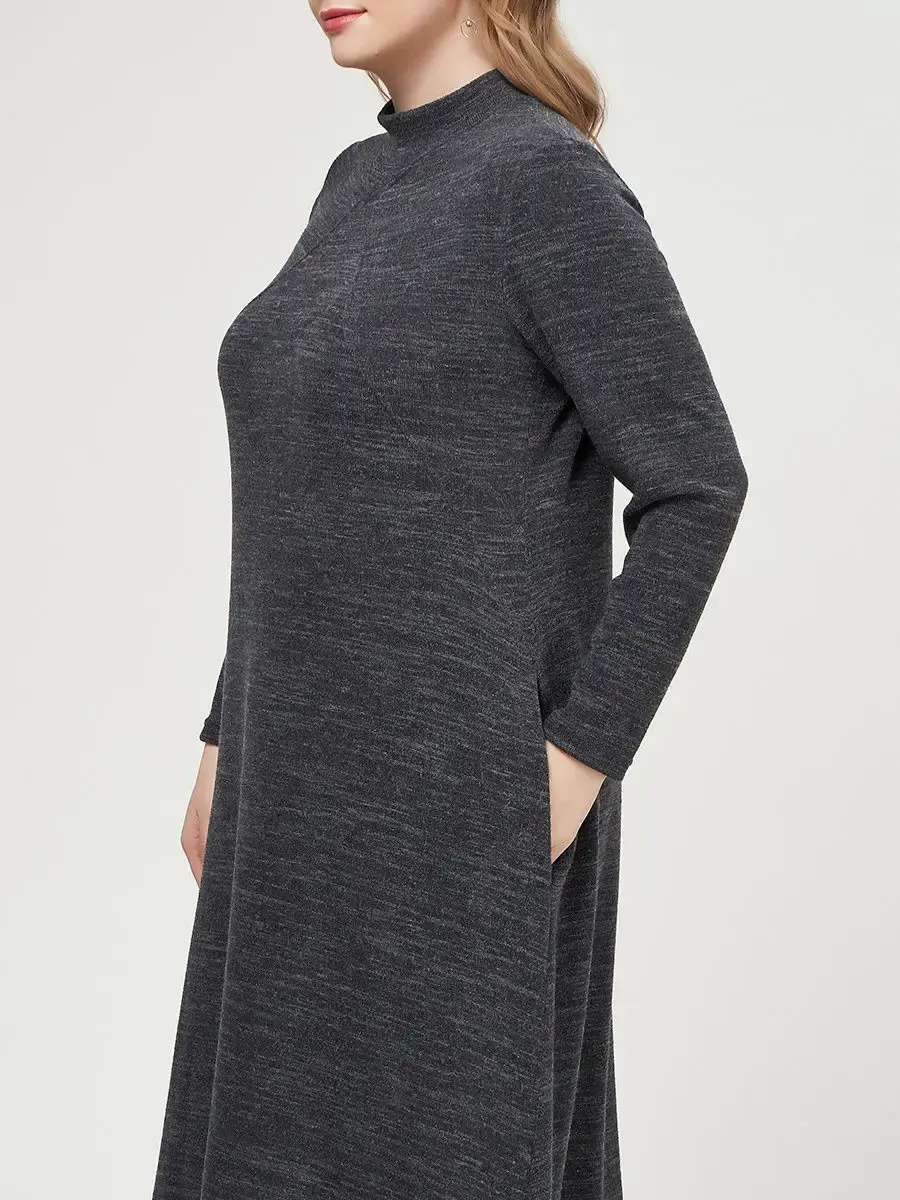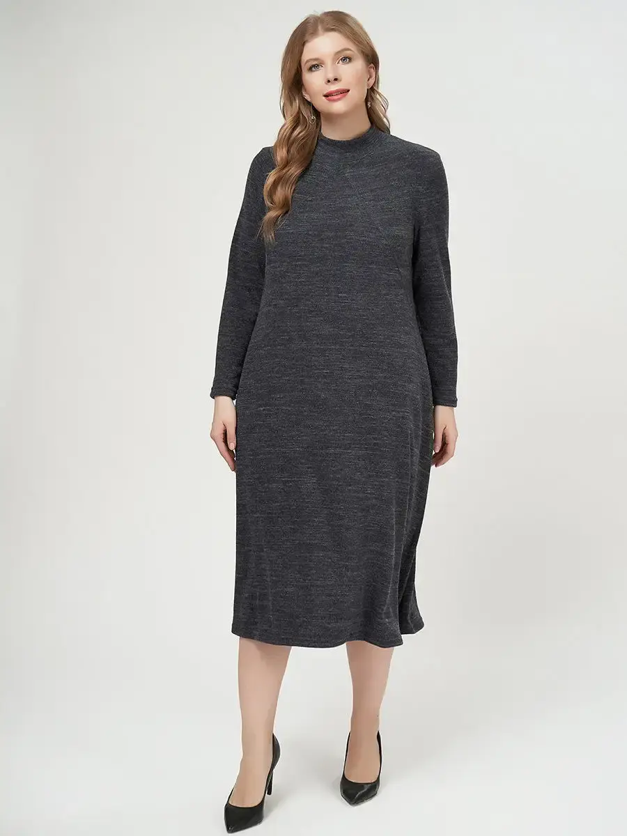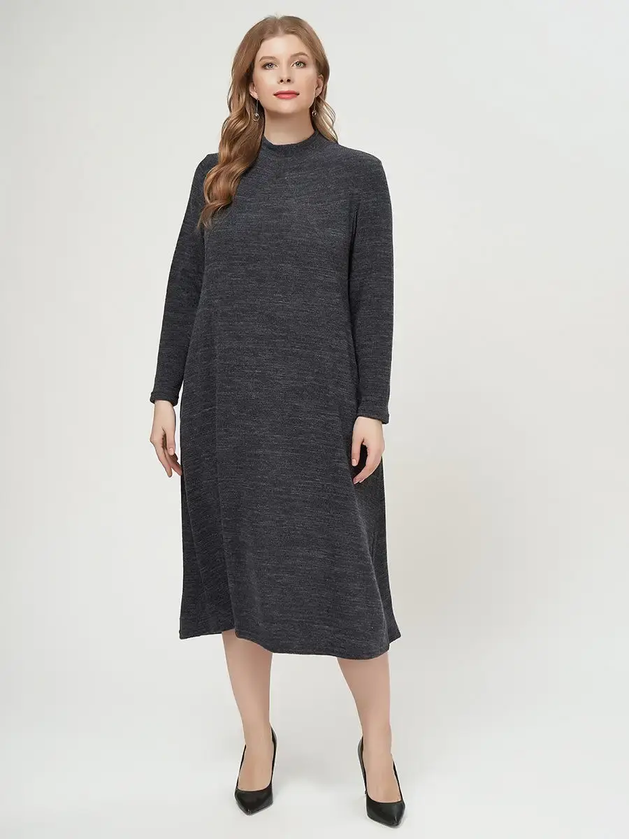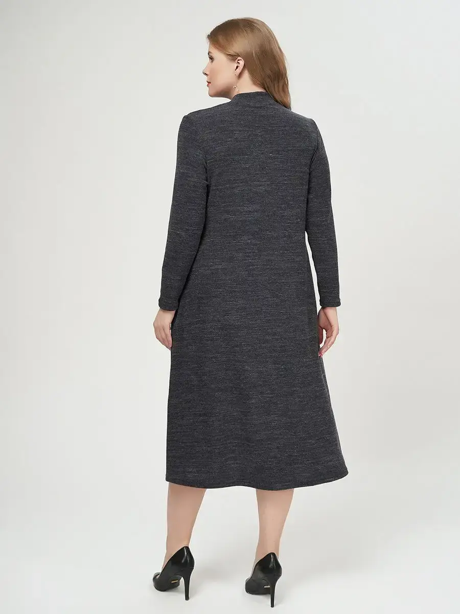 Стильное платье до середины голени из воздушного трикотажа – меланж. Модель, расклешенная книзу, с длинными втачными рукавами, воротником-стойкой, врезными боковыми карманами.