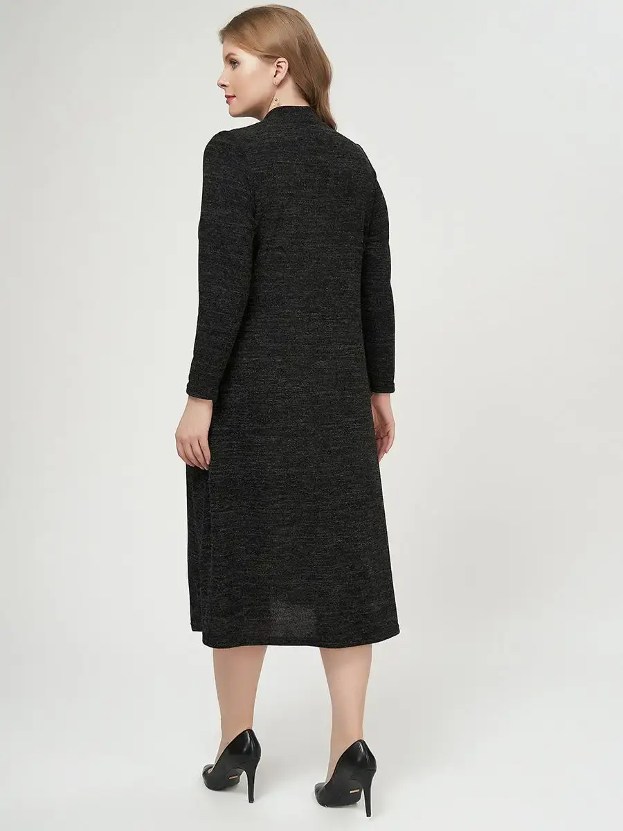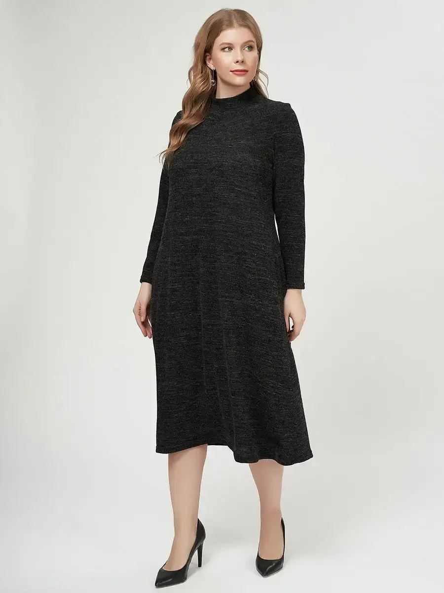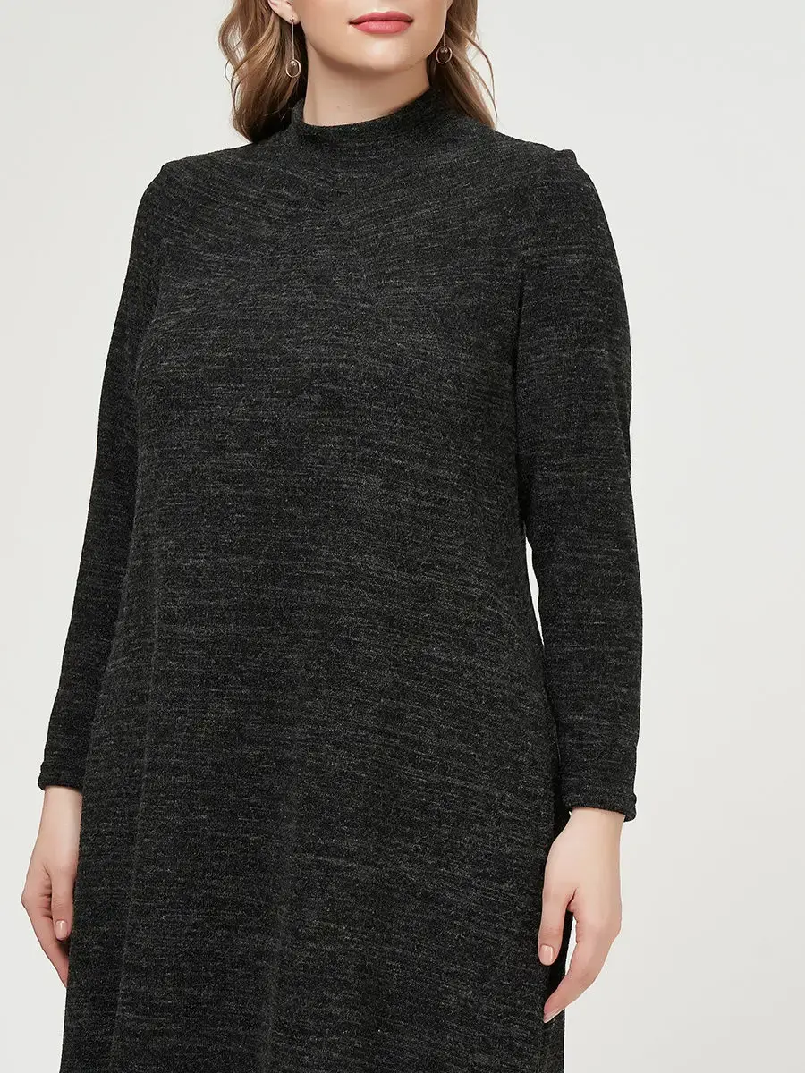 Стильное платье до середины голени из воздушного трикотажа – меланж. Модель, расклешенная книзу, с длинными втачными рукавами, воротником-стойкой, врезными боковыми карманами.