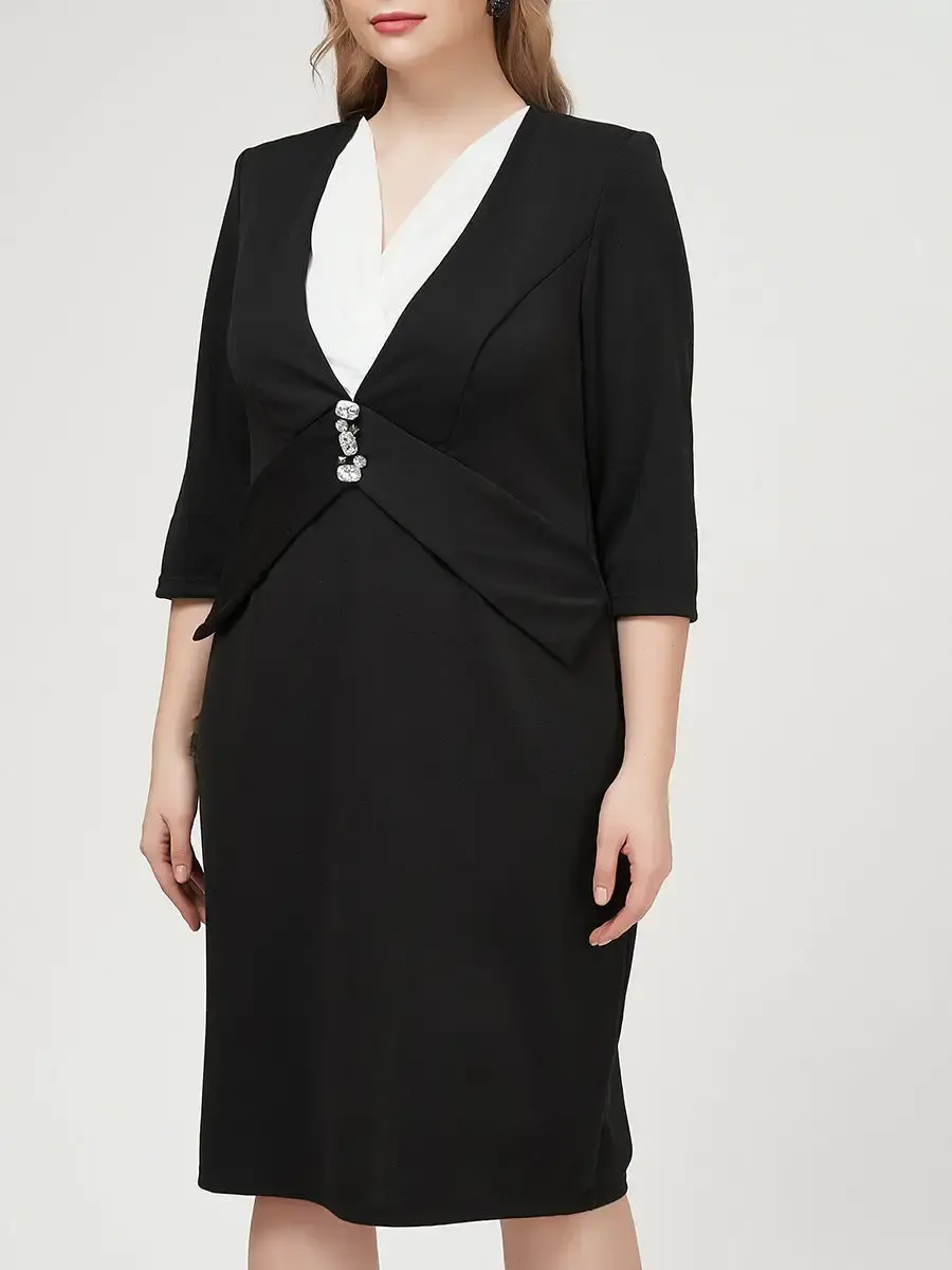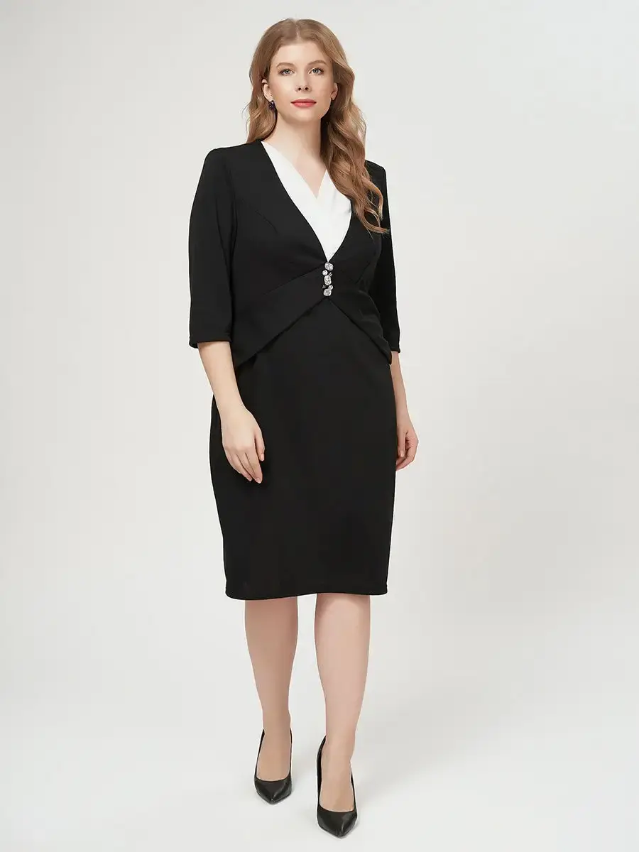 Элегантное платье длиной до середины колена, имитирующее костюм, состоящий из короткого жакета, юбки - карандаш и тонкой офисной блузы. Модель, зауженная книзу с V-образным вырезом, втачным рукавом 3/4, со шлицей-вырезом сзади.