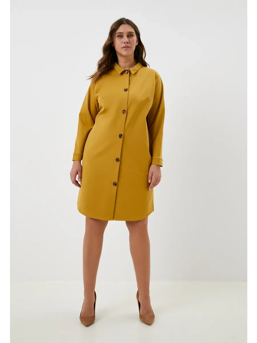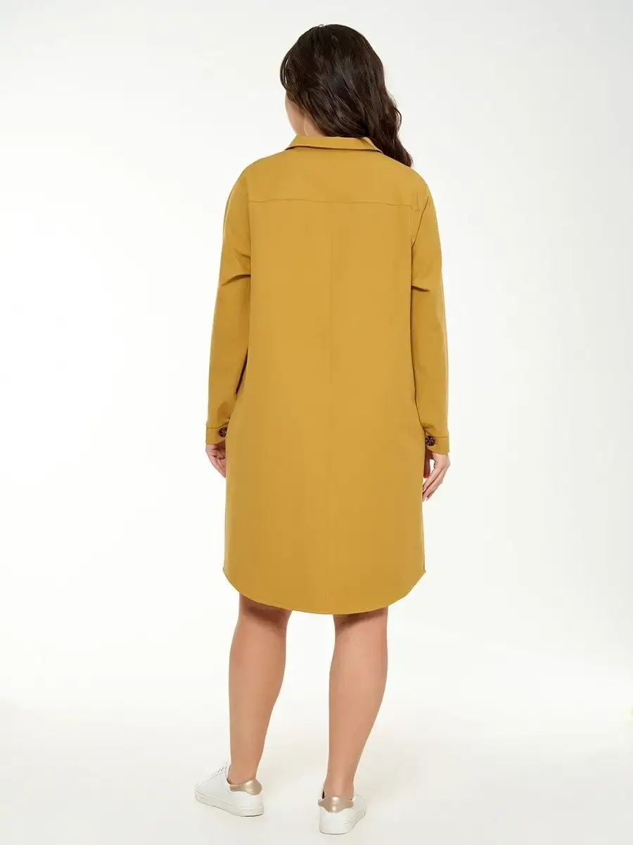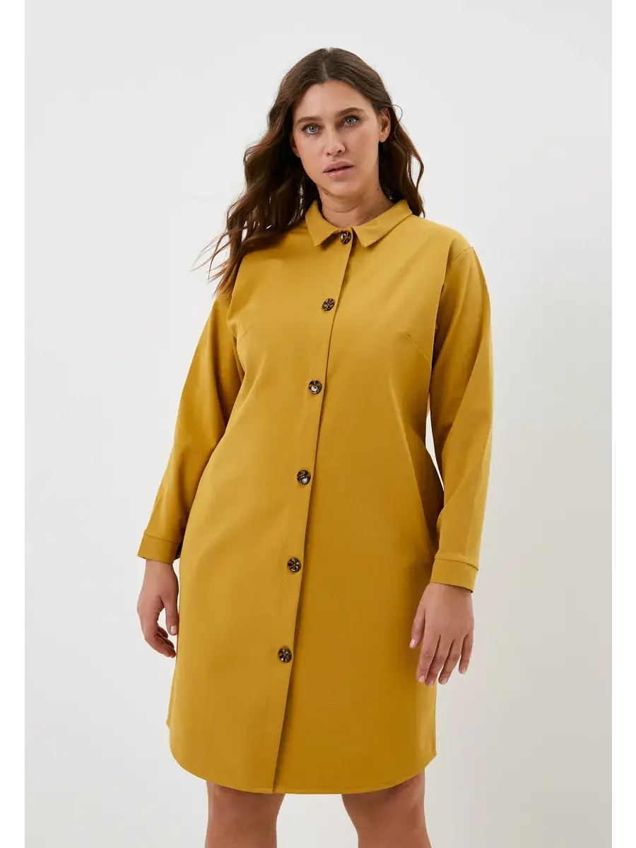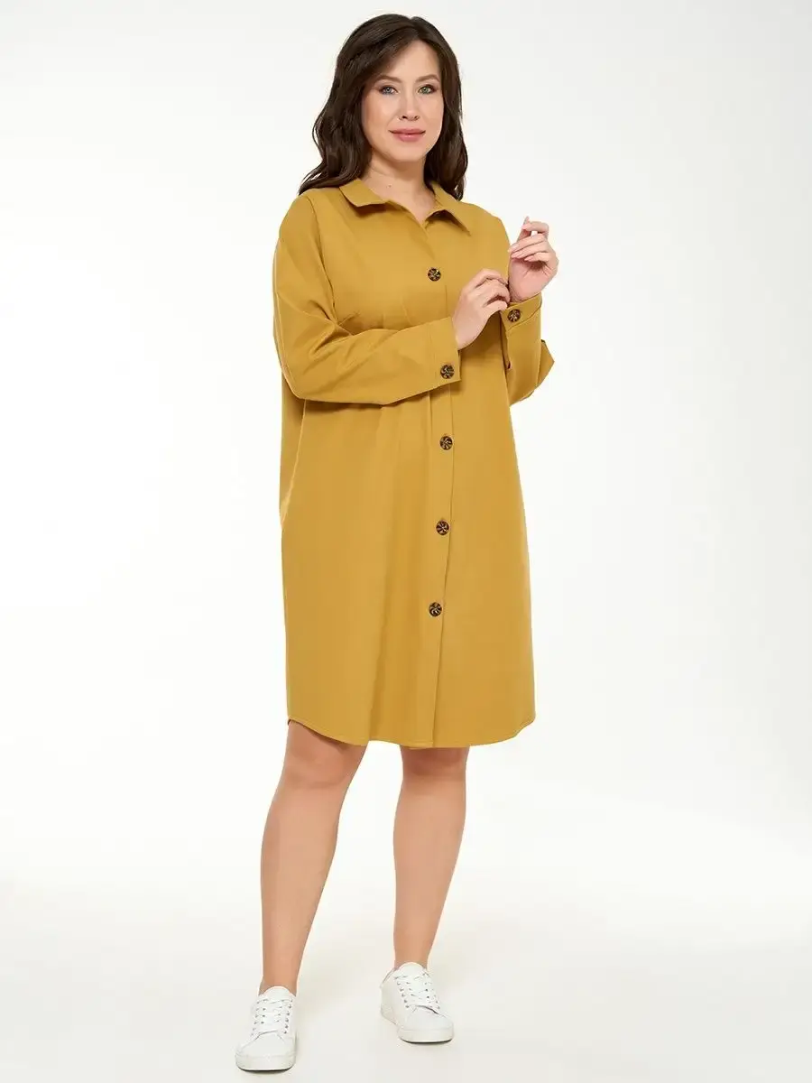 Повседневное платье больших размеров выполнено из плотного хлопка со стрейчем, на пуговицах, с карманами в шве. Отложной воротник, длинный рукав с манжетом на пуговице. Длина изделия по спинке/ длина рукава соответственно: