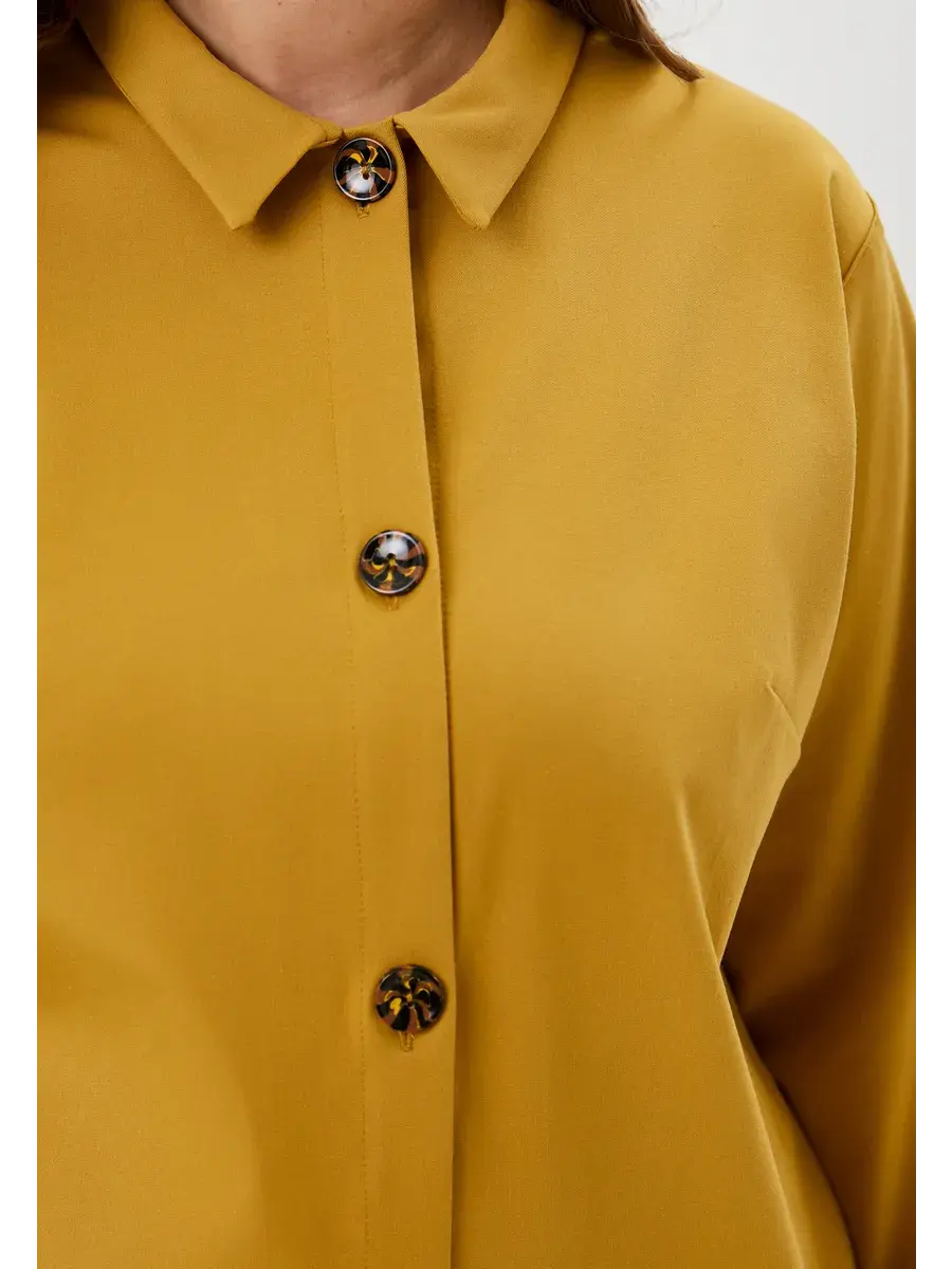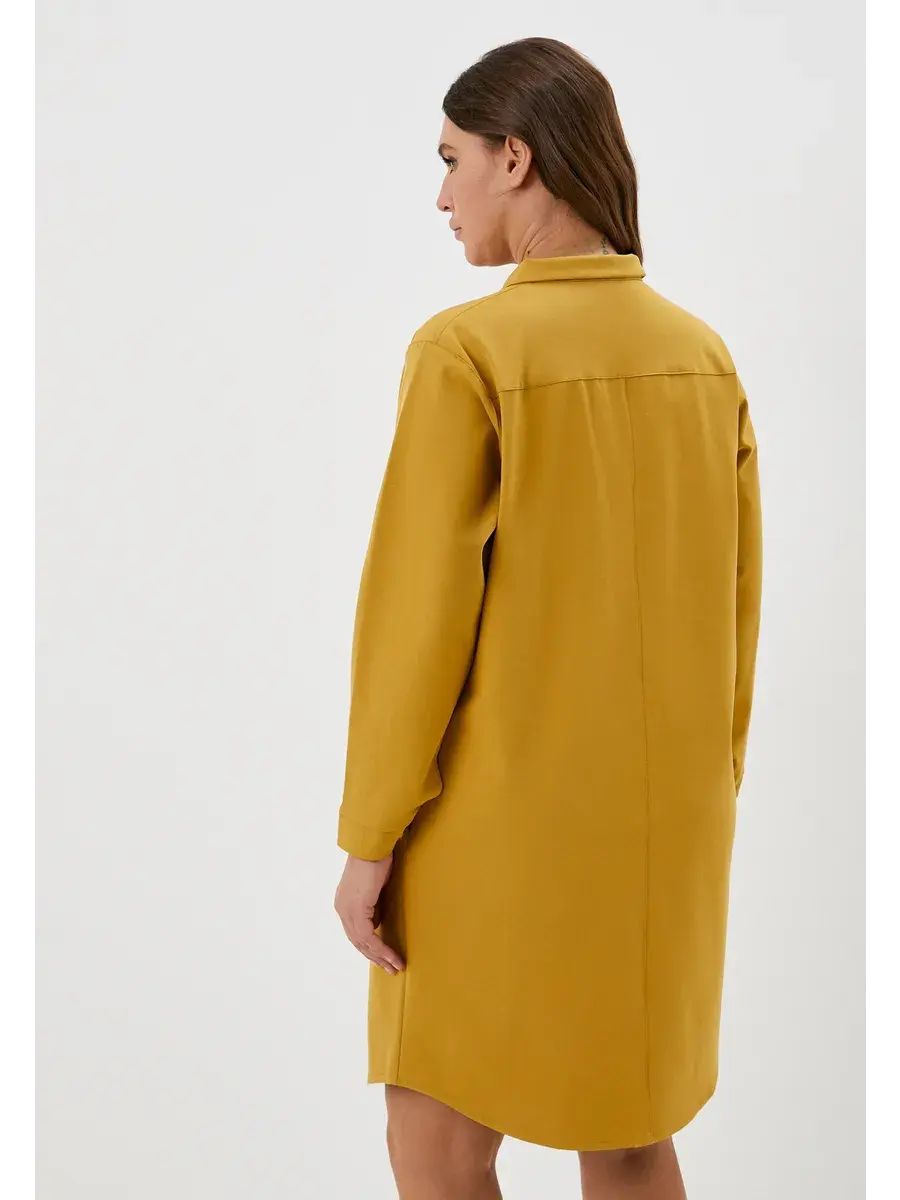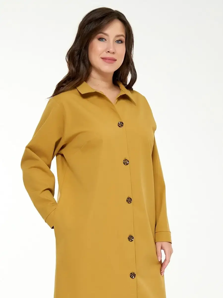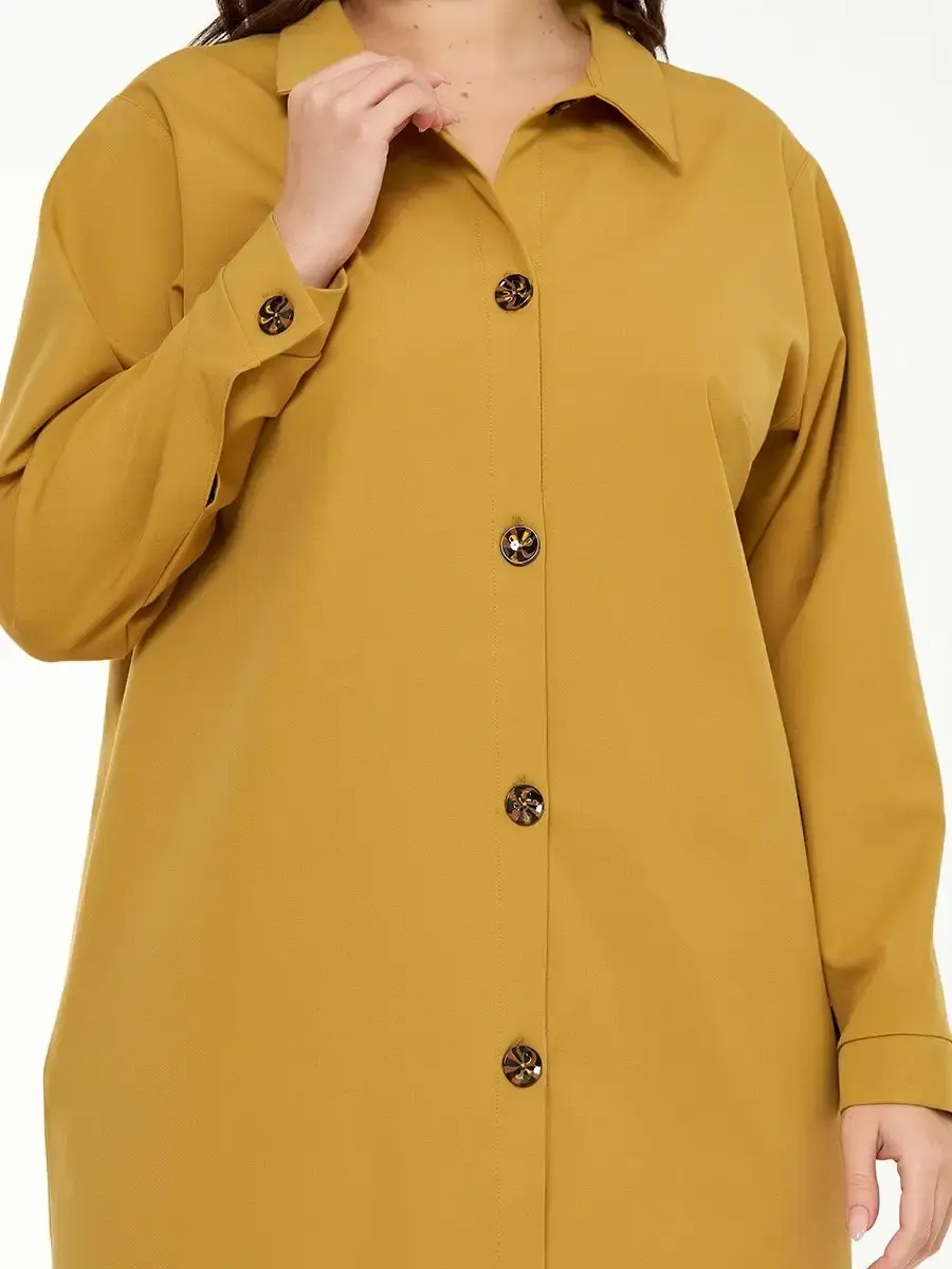 Повседневное платье больших размеров выполнено из плотного хлопка со стрейчем, на пуговицах, с карманами в шве. Отложной воротник, длинный рукав с манжетом на пуговице. Длина изделия по спинке/ длина рукава соответственно: