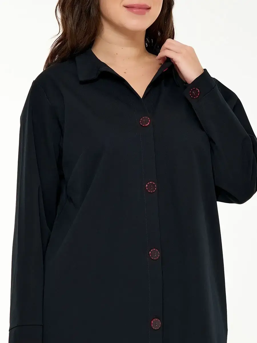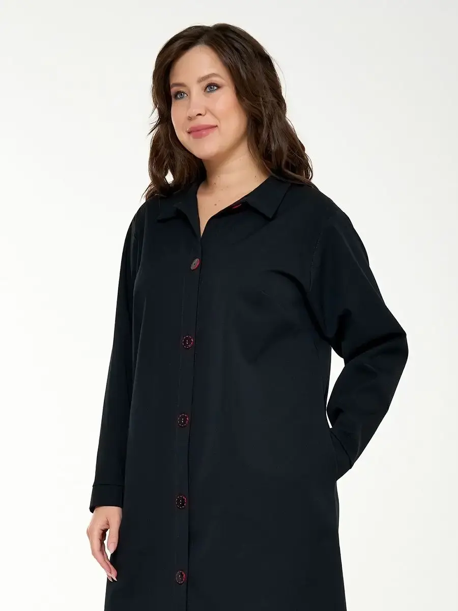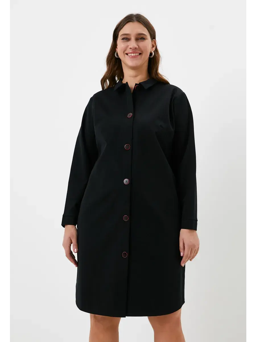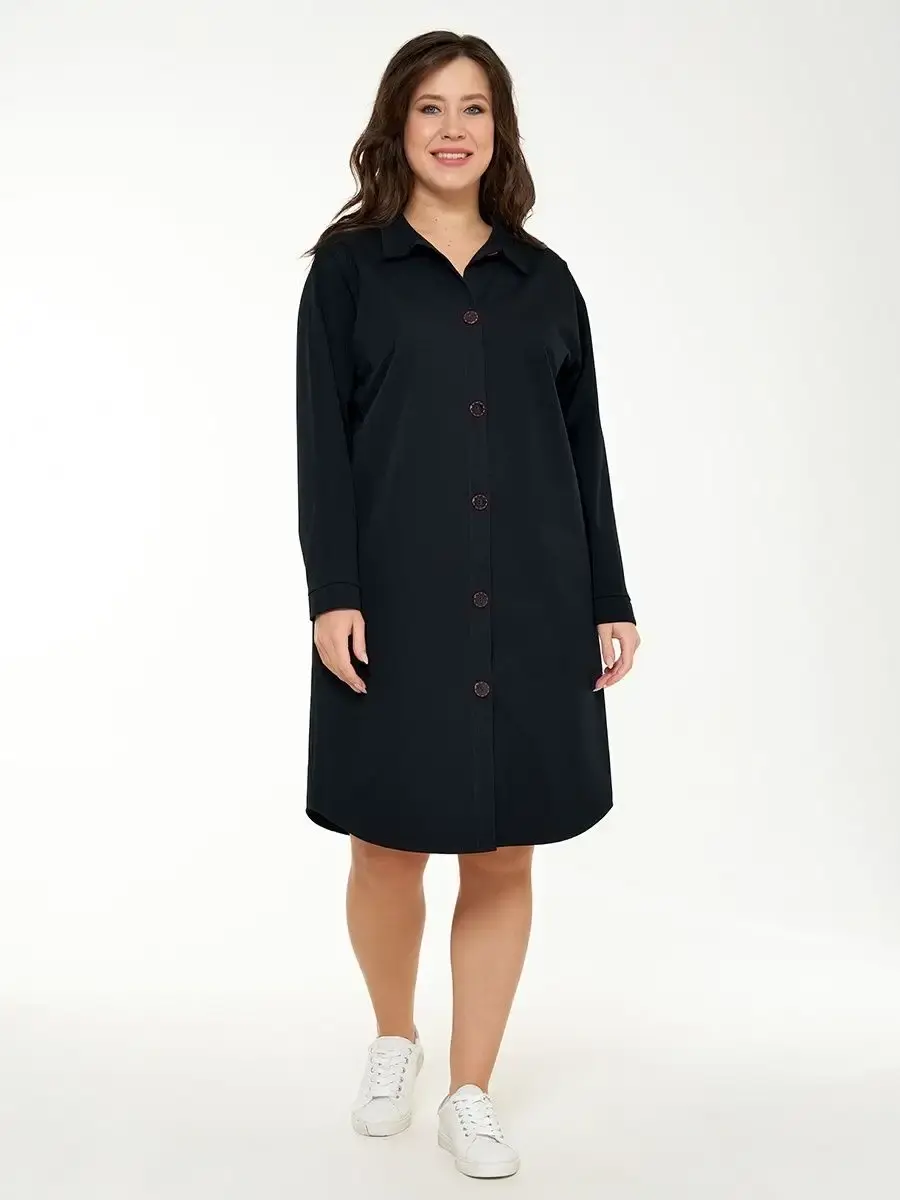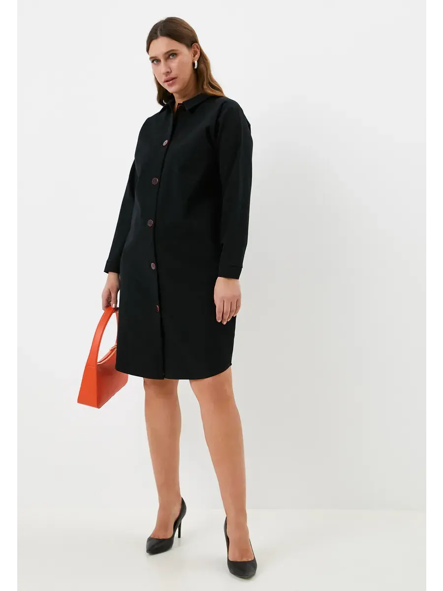Повседневное платье больших размеров выполнено из плотного хлопка со стрейчем, на пуговицах, с карманами в шве. Отложной воротник, длинный рукав с манжетом на пуговице. Длина изделия по спинке/ длина рукава соответственно: