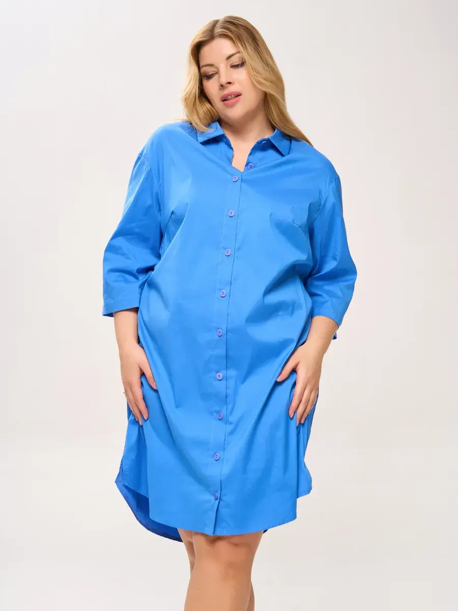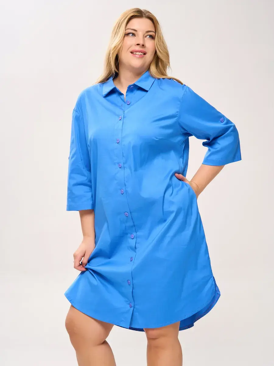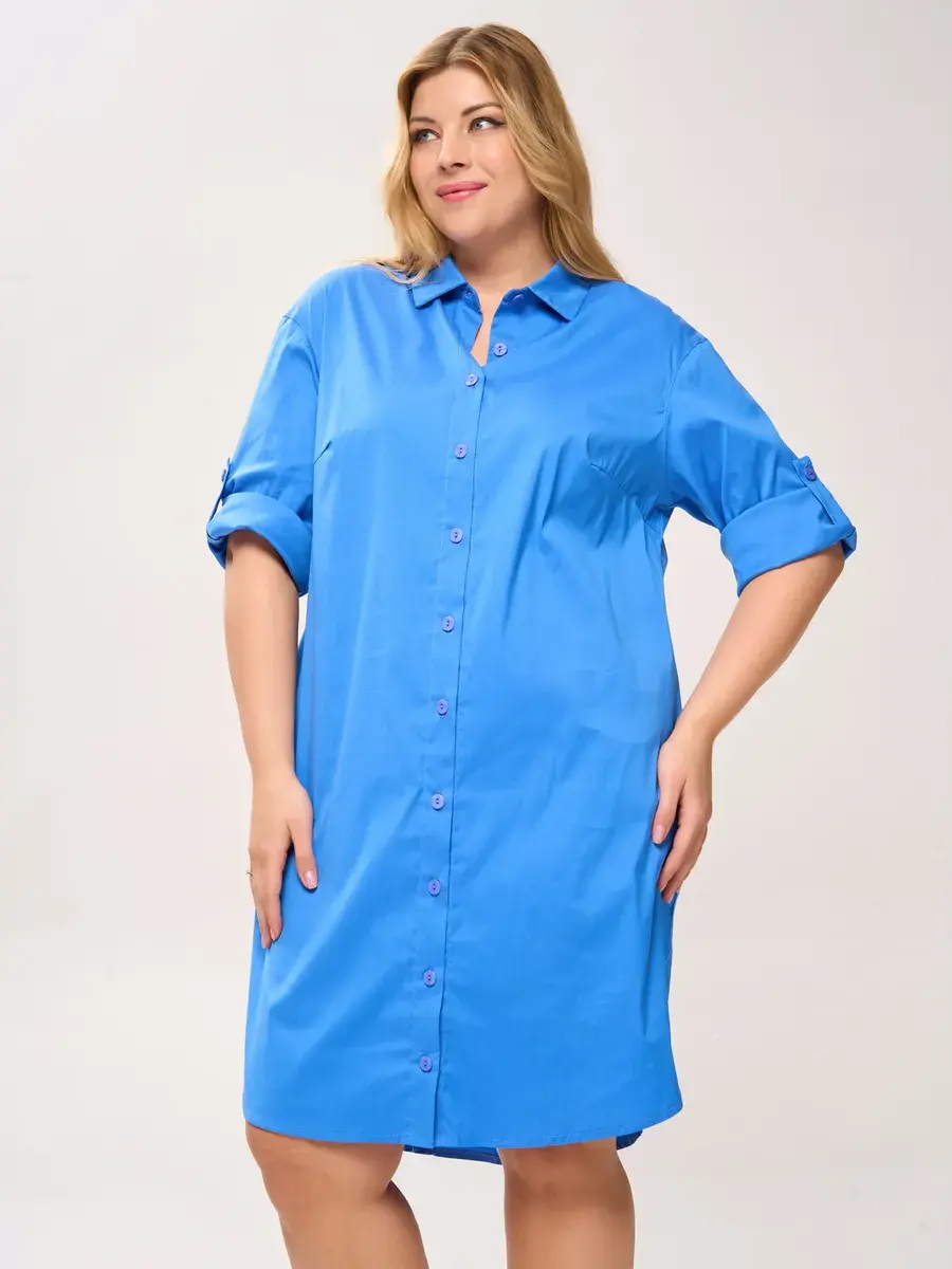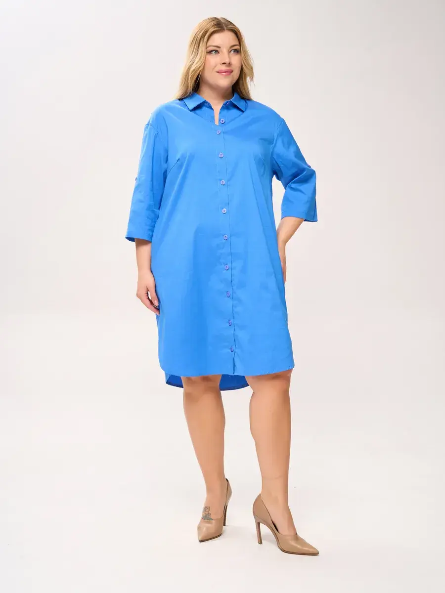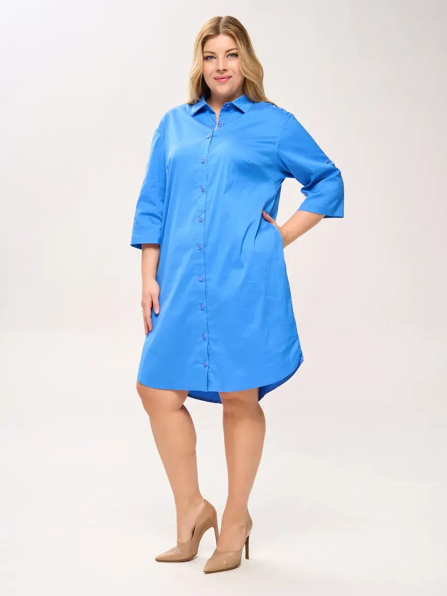 Эффектное платье-шемизье длиной чуть ниже колен, из хлопковой ткани. Модель с классическим рубашечным воротником, с пуговичной застежкой на открытой французской планке; с втачными рукавами 3/4 со спущенной проймой.