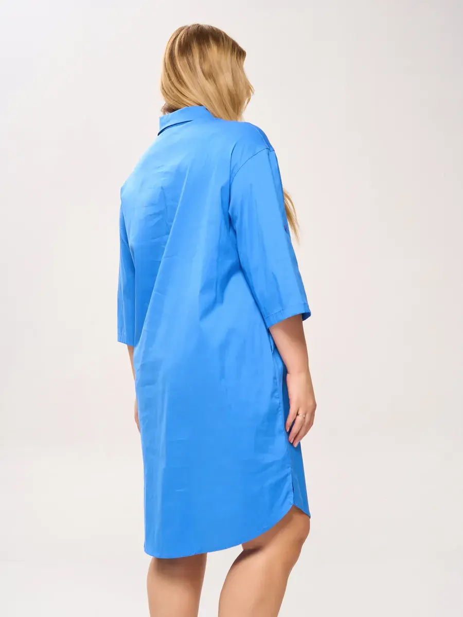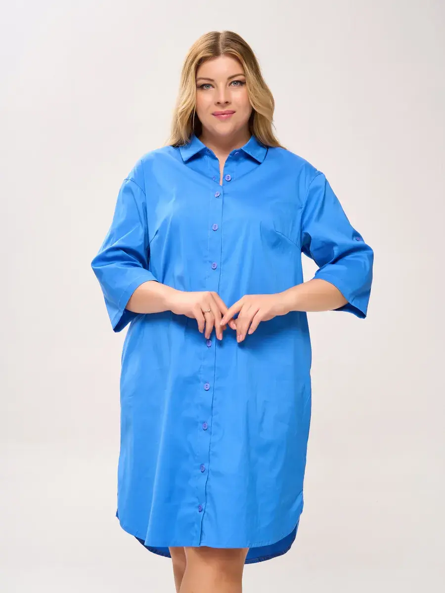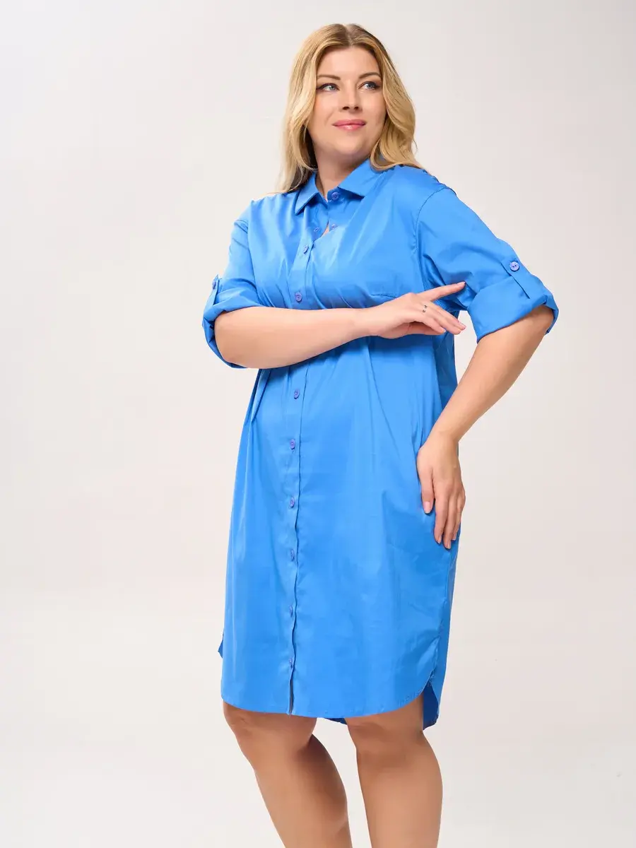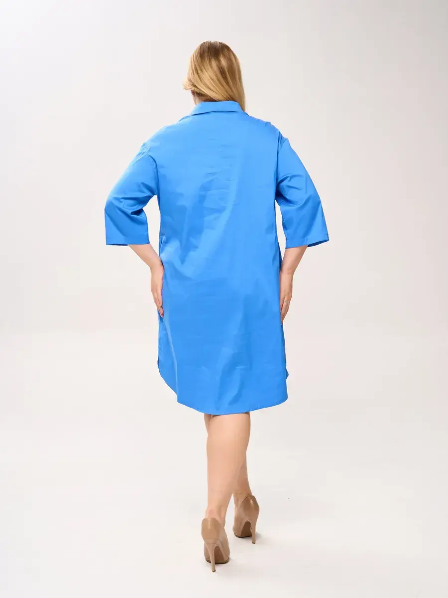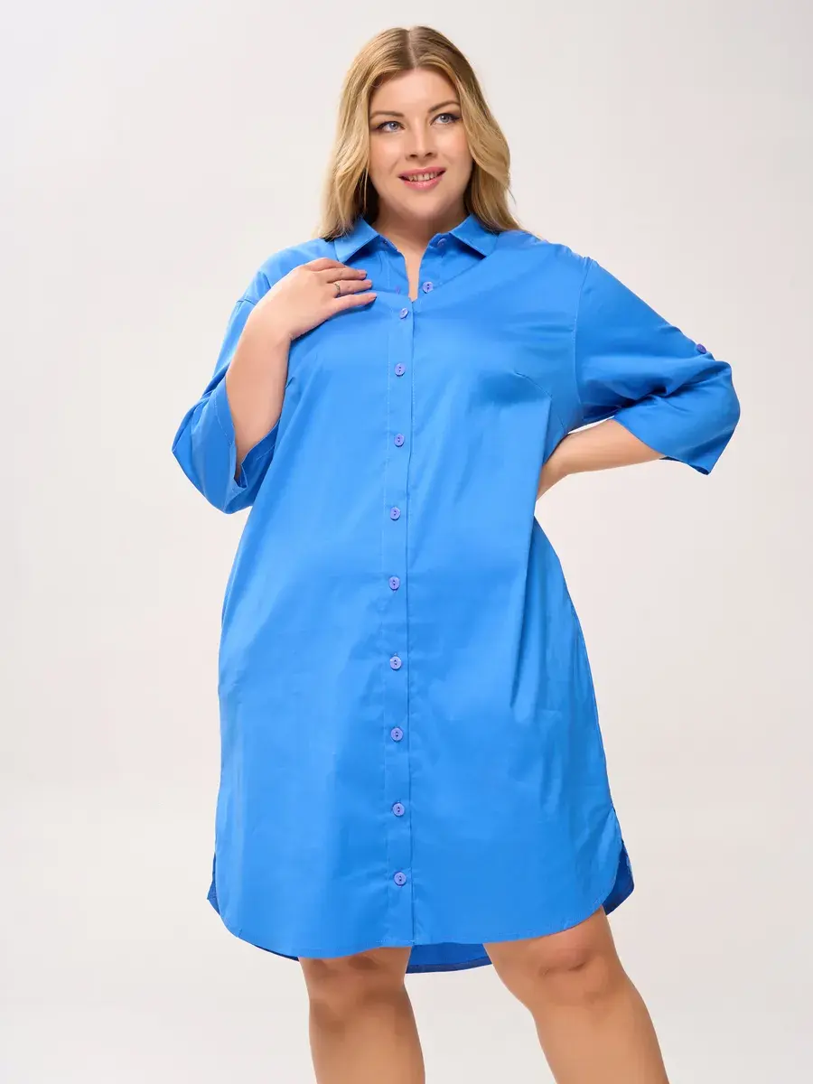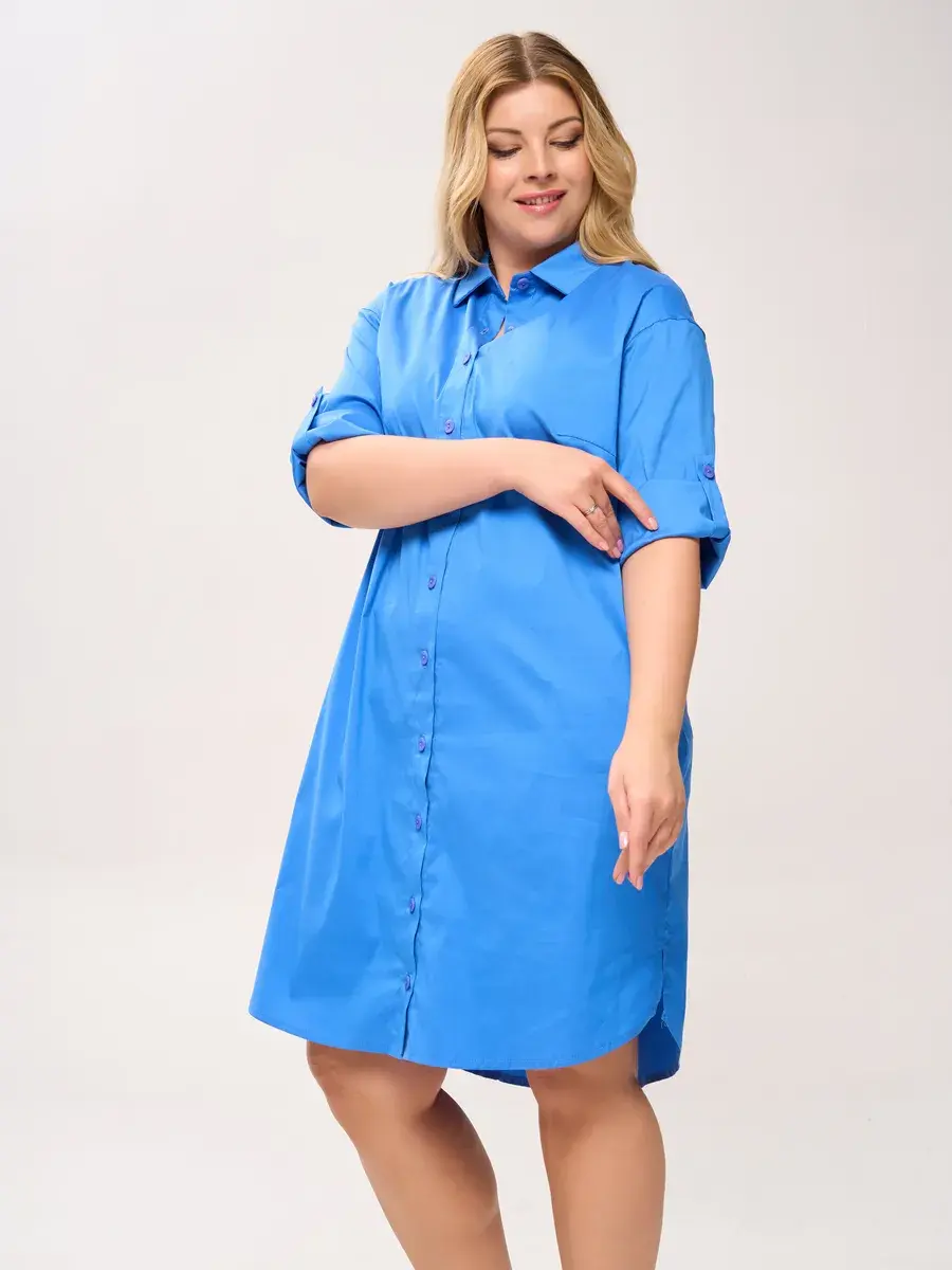 Эффектное платье-шемизье длиной чуть ниже колен, из хлопковой ткани. Модель с классическим рубашечным воротником, с пуговичной застежкой на открытой французской планке; с втачными рукавами 3/4 со спущенной проймой.