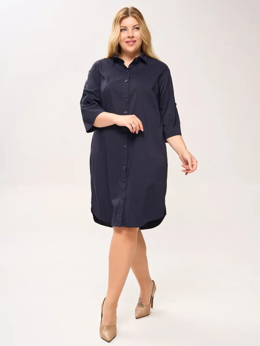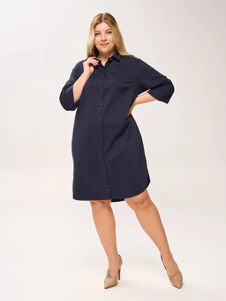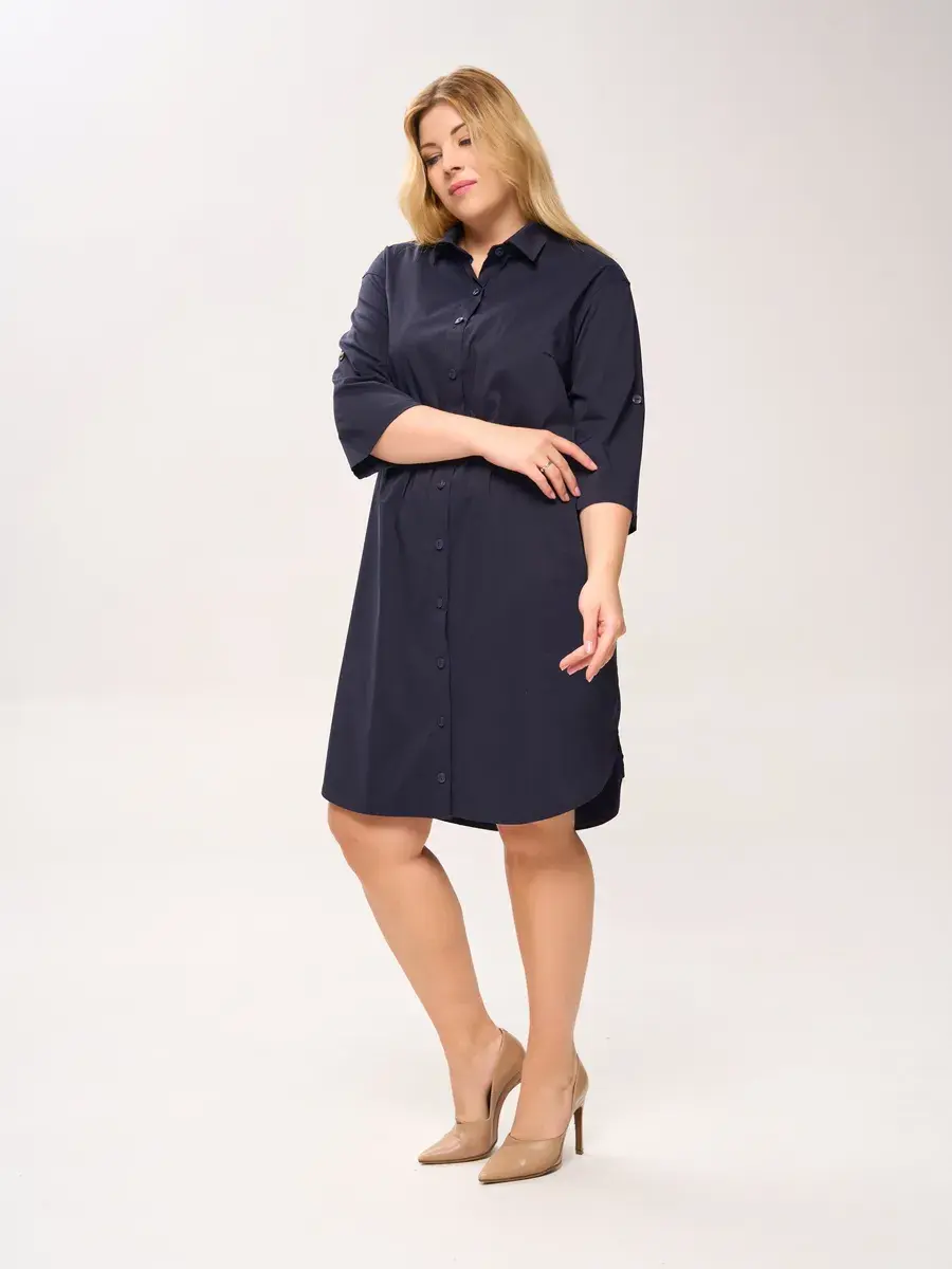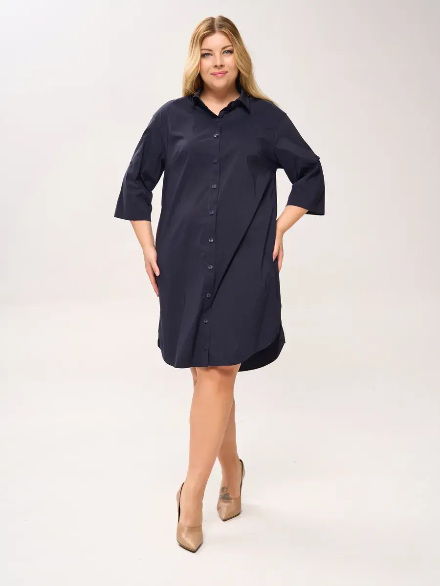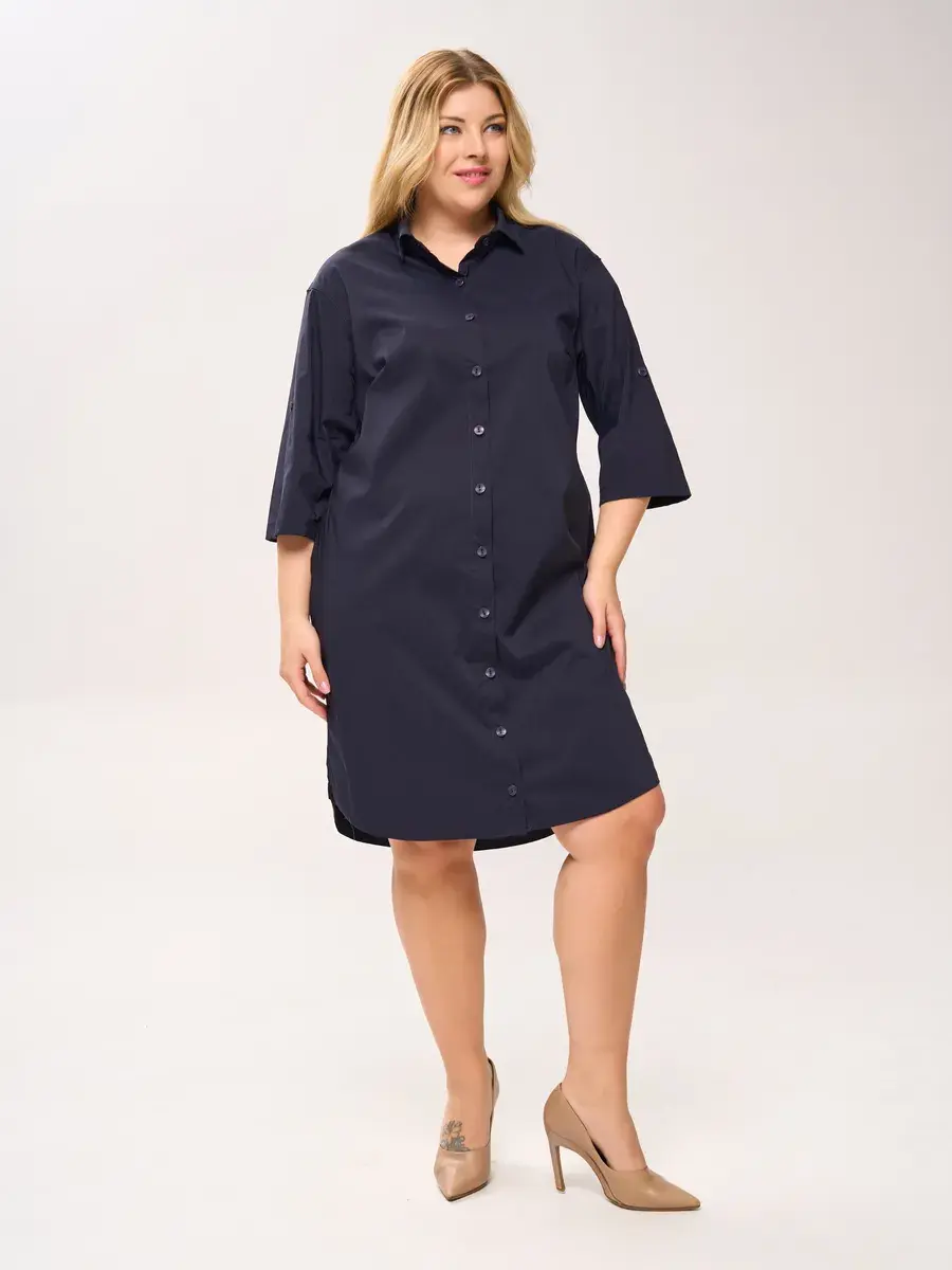 Эффектное платье-шемизье длиной чуть ниже колен, из хлопковой ткани. Модель с классическим рубашечным воротником, с пуговичной застежкой на открытой французской планке; с втачными рукавами 3/4 со спущенной проймой.