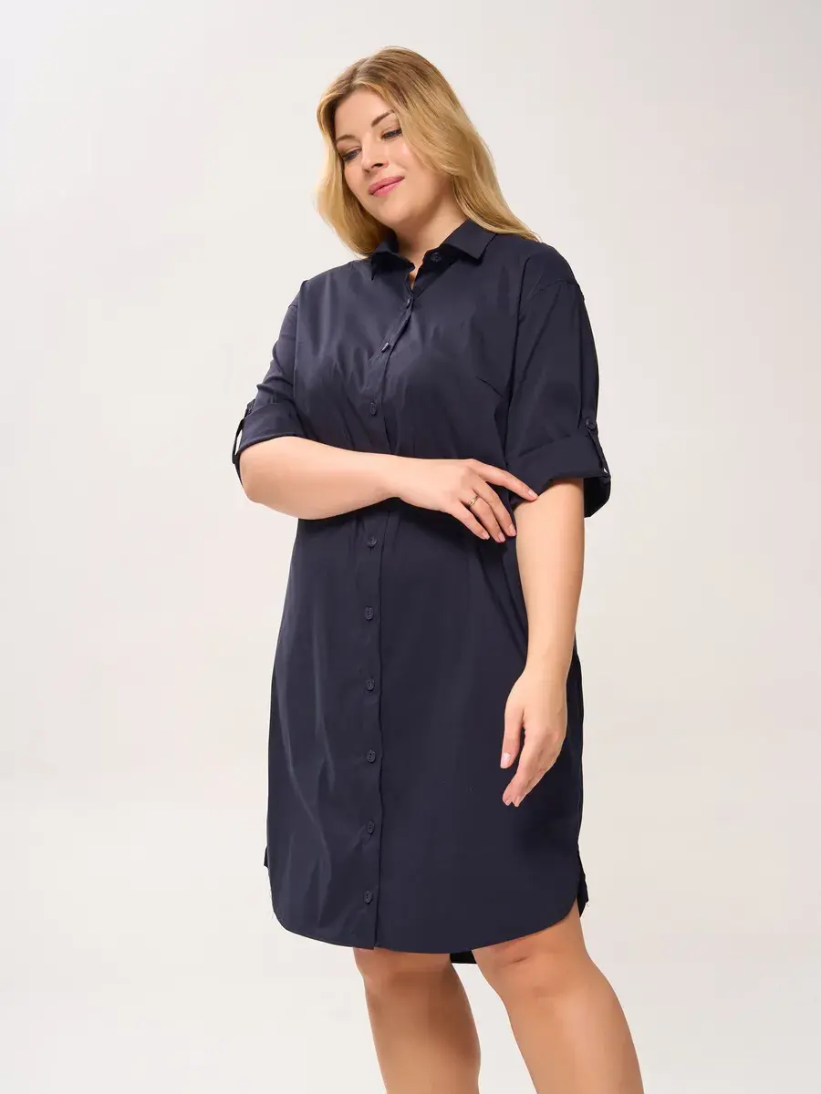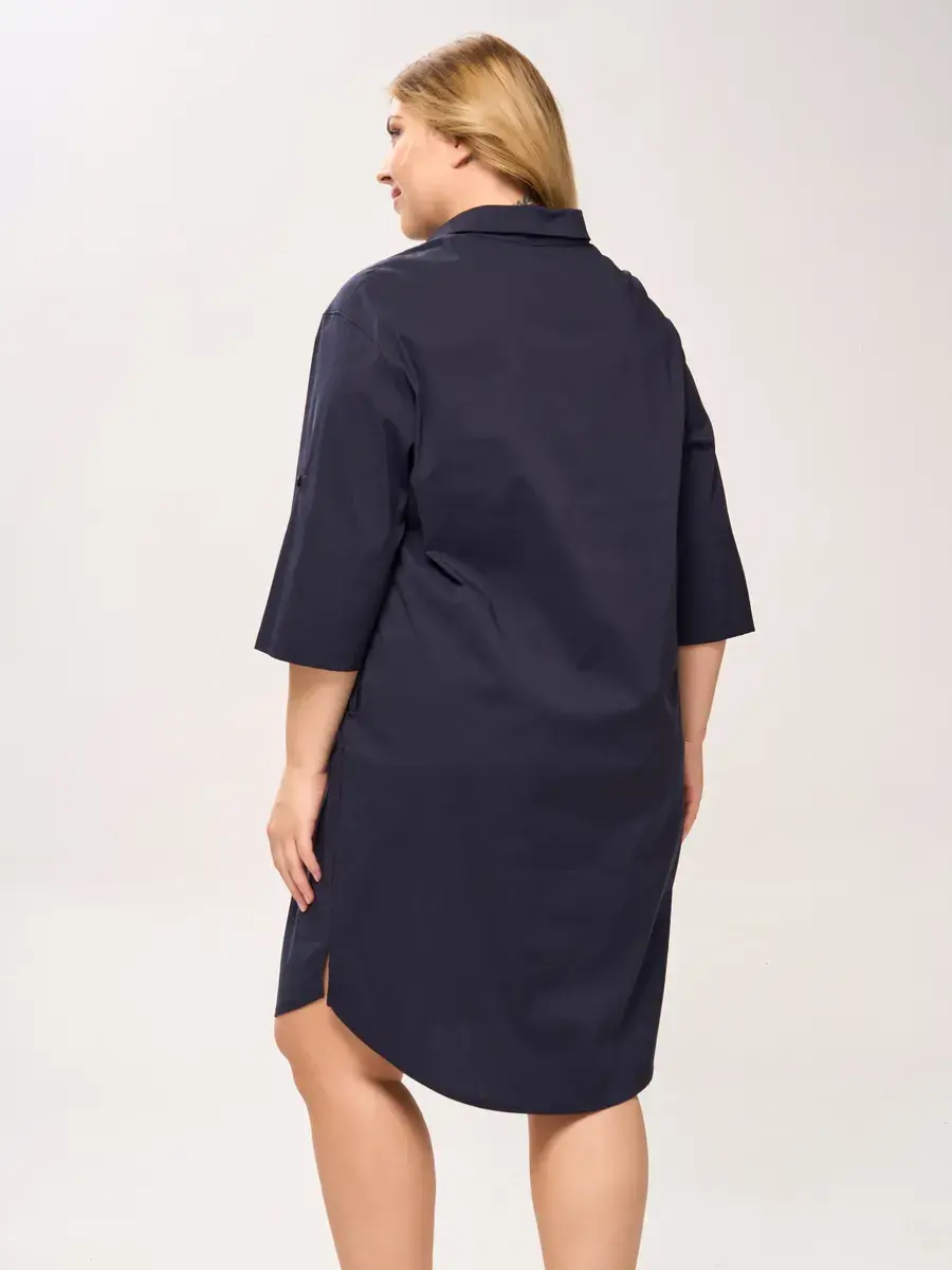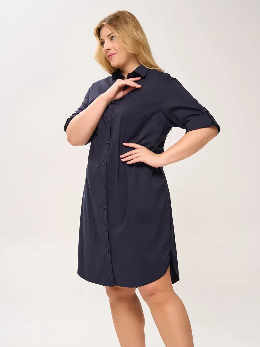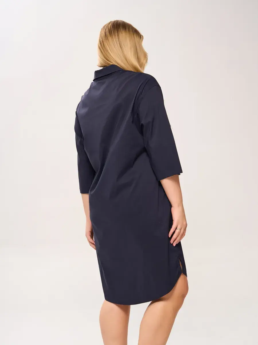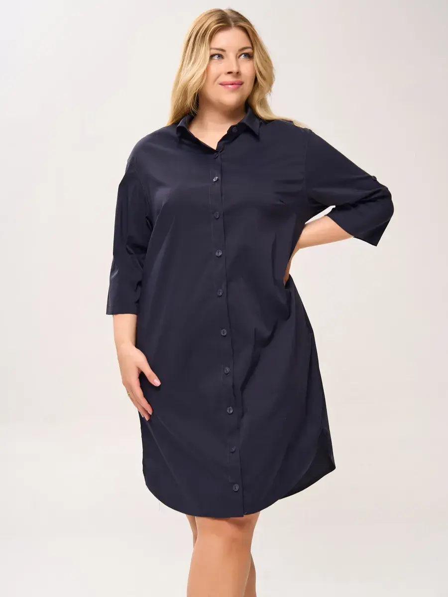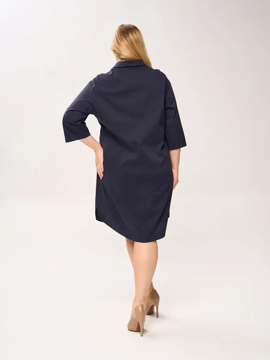 Эффектное платье-шемизье длиной чуть ниже колен, из хлопковой ткани. Модель с классическим рубашечным воротником, с пуговичной застежкой на открытой французской планке; с втачными рукавами 3/4 со спущенной проймой.