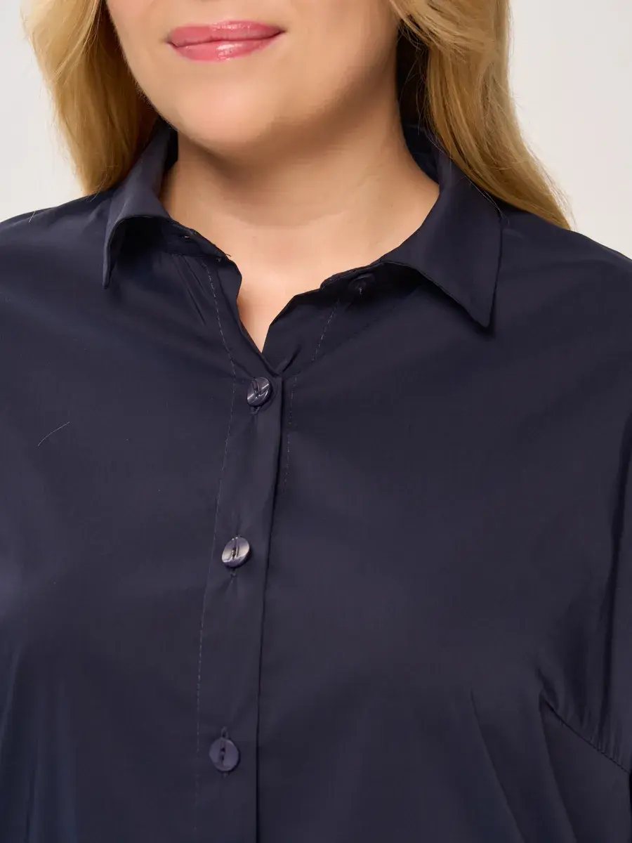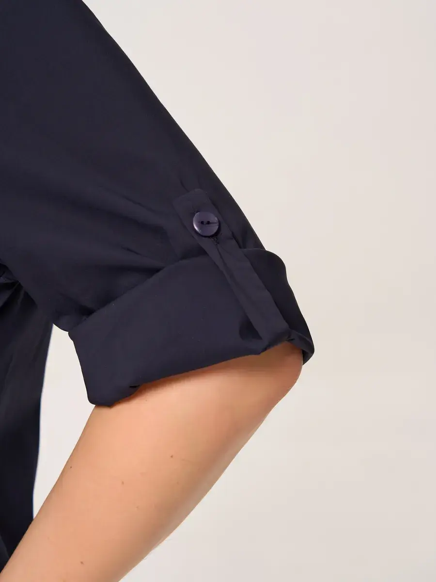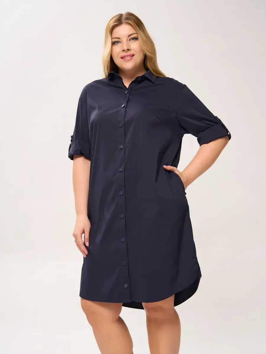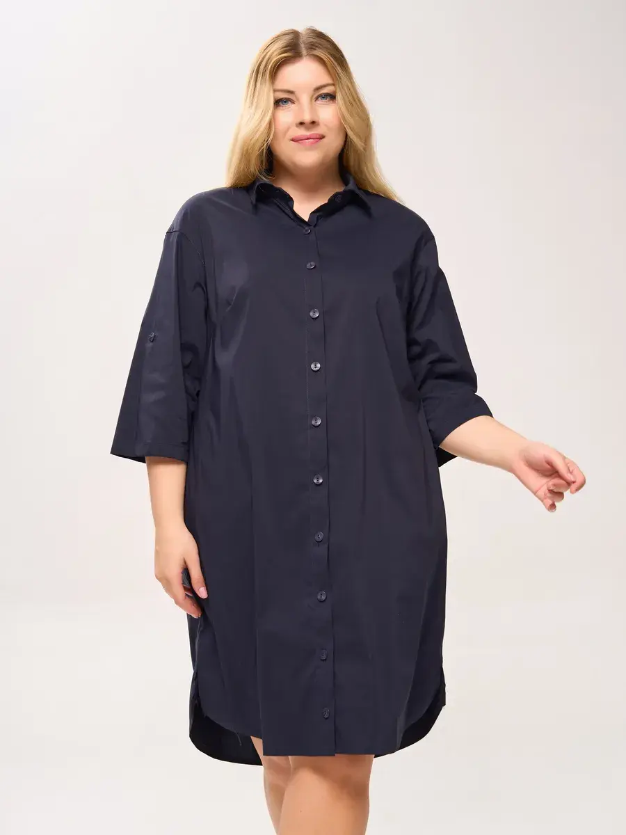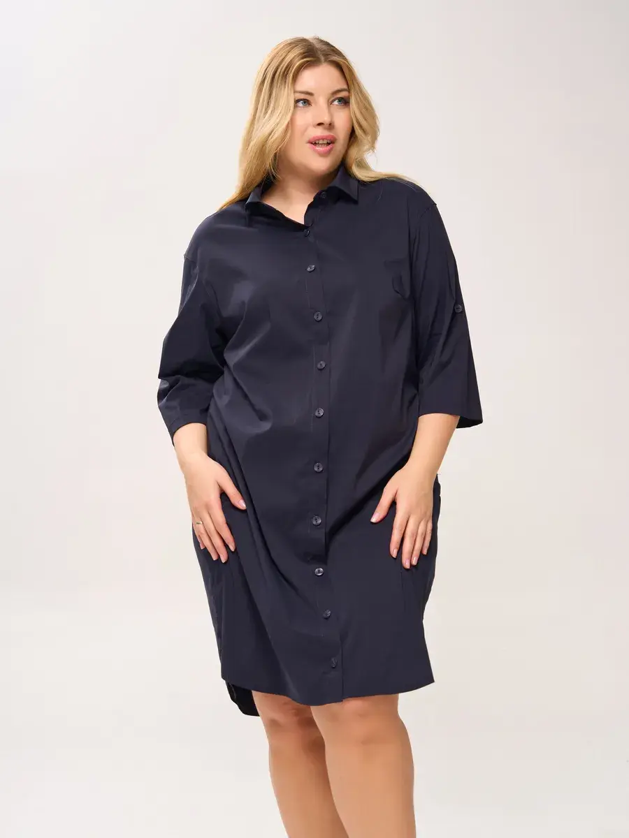 Эффектное платье-шемизье длиной чуть ниже колен, из хлопковой ткани. Модель с классическим рубашечным воротником, с пуговичной застежкой на открытой французской планке; с втачными рукавами 3/4 со спущенной проймой.