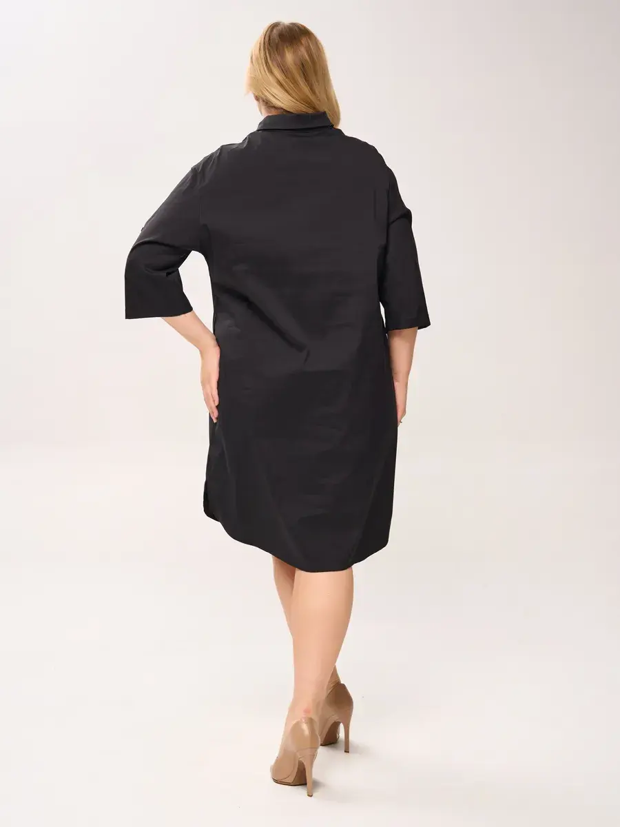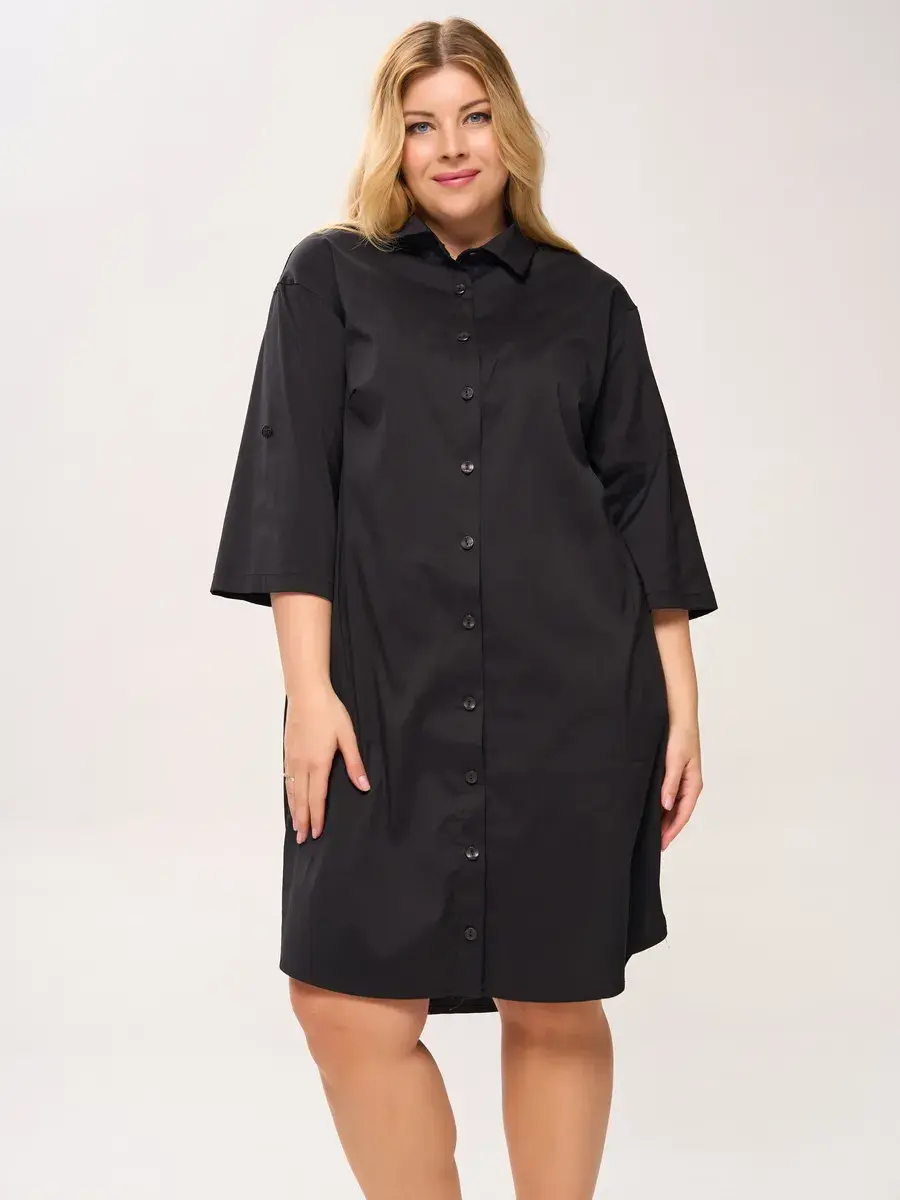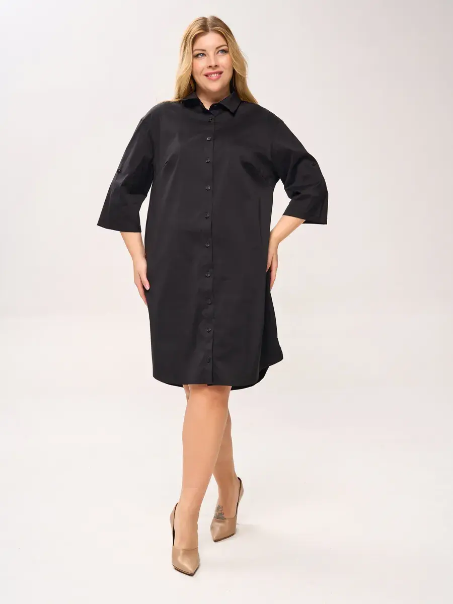 Эффектное платье-шемизье длиной чуть ниже колен, из хлопковой ткани. Модель с классическим рубашечным воротником, с пуговичной застежкой на открытой французской планке; с втачными рукавами 3/4 со спущенной проймой.