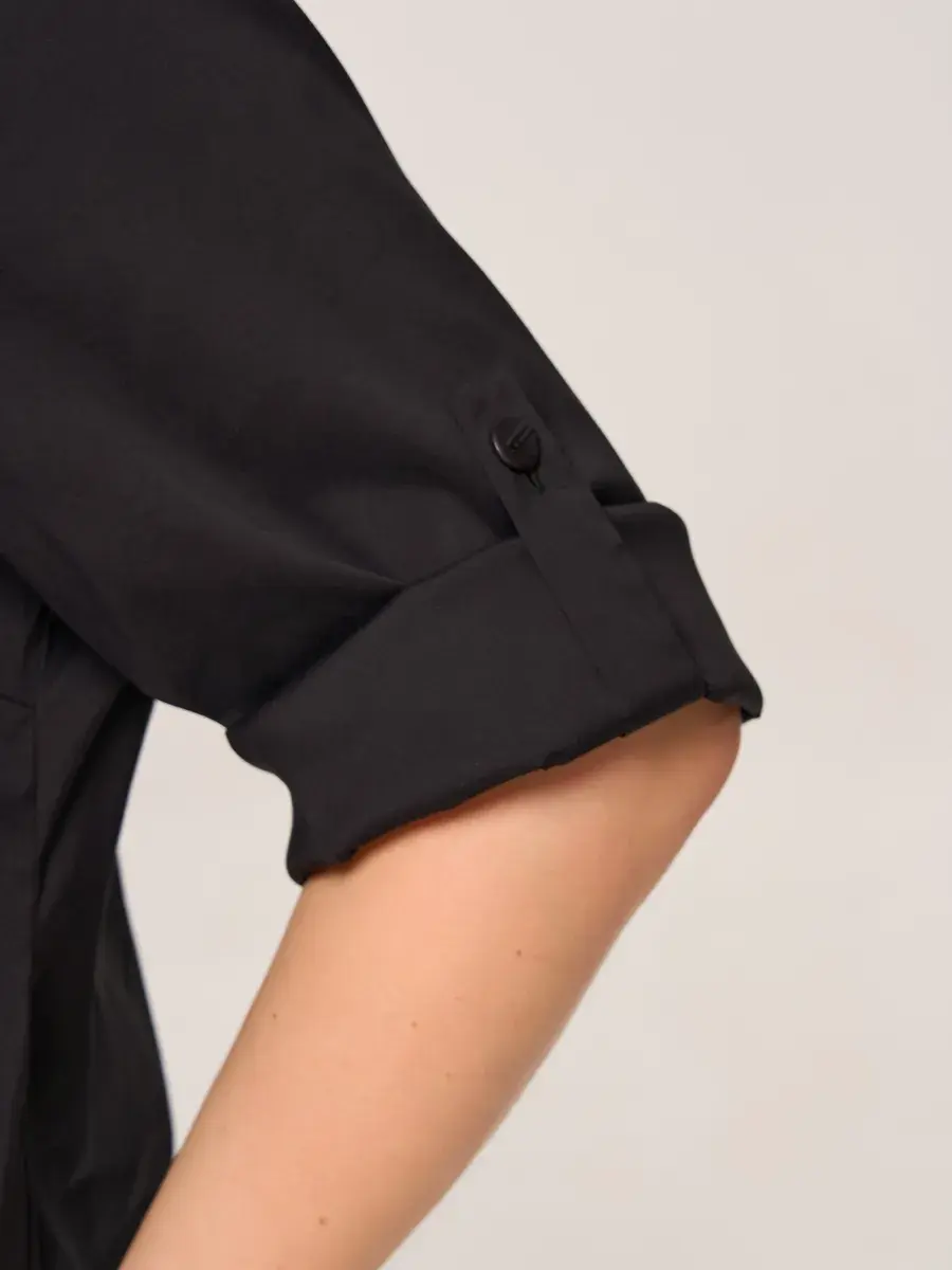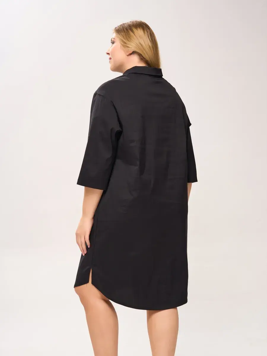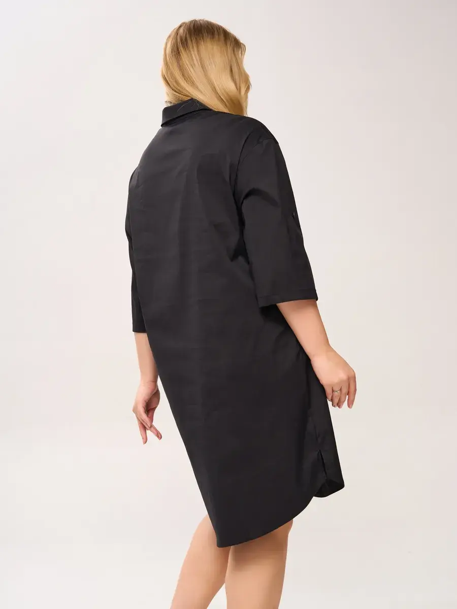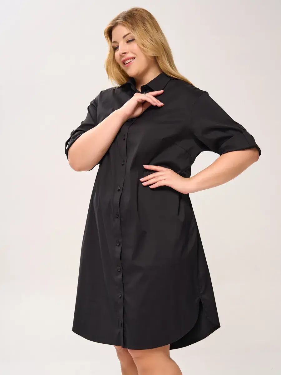 Эффектное платье-шемизье длиной чуть ниже колен, из хлопковой ткани. Модель с классическим рубашечным воротником, с пуговичной застежкой на открытой французской планке; с втачными рукавами 3/4 со спущенной проймой.