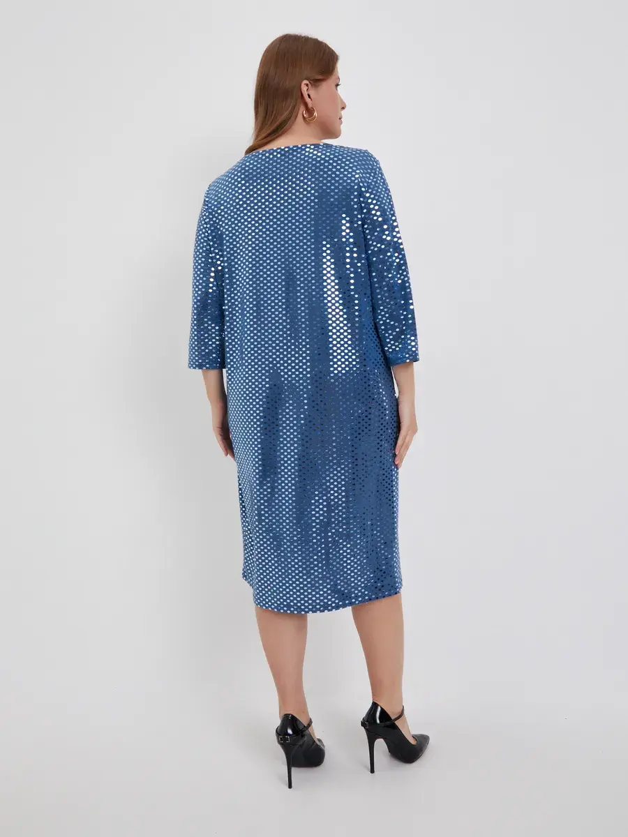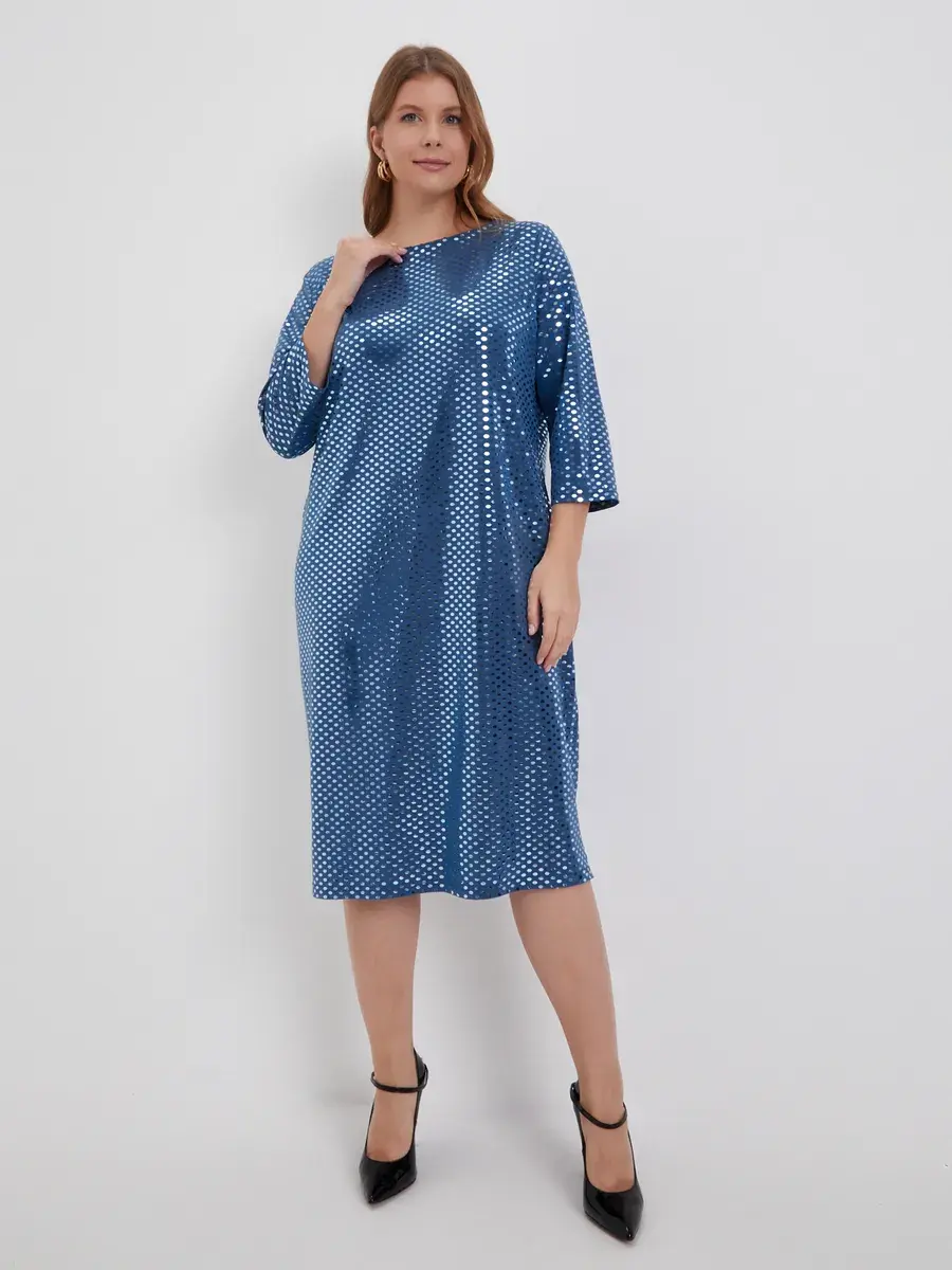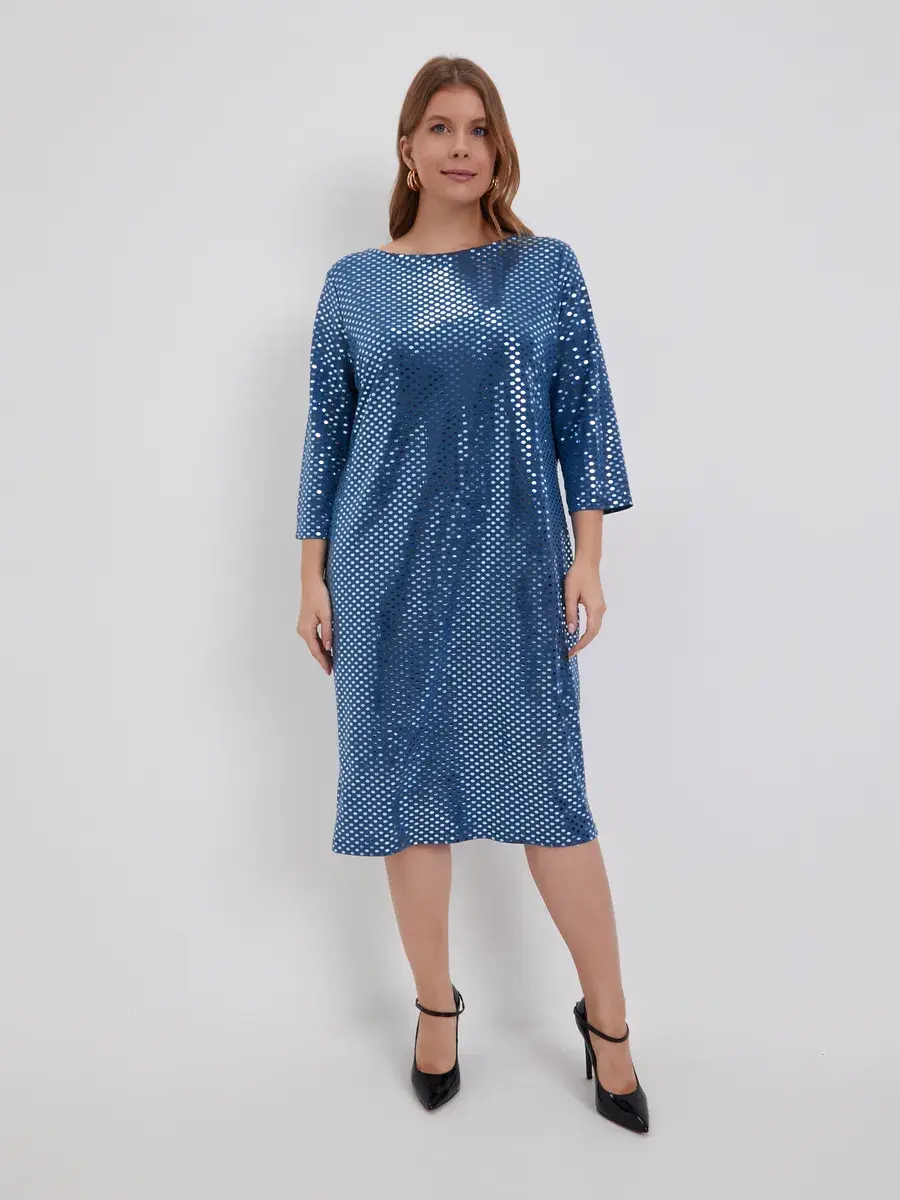 Изысканное нарядное платье от бренда OLSI из ткани с эффектным принтом-глиттером, создающим эффект пайеток. Модель лаконичного прямого кроя, плавно обрисовывающее фигуру; длиной ниже колен; с отрезными втачными рукавами длиной 3/4; вырезом горловины лодочка. Праздничное платье женщинам больших размеров будет хорошо сидеть на фигуре яблоко, перевернутый треугольник, прямойгольник. Наряд с блеском эффектно смотрится, в нем Вы будете украшением вечера! Платье с пайетками прекрасный вариант для праздничного мероприятия, выступлений, коктейльных вечеринок, Новый год или день рождения, на свадьбах, блеск переливается под светом сафитов.
