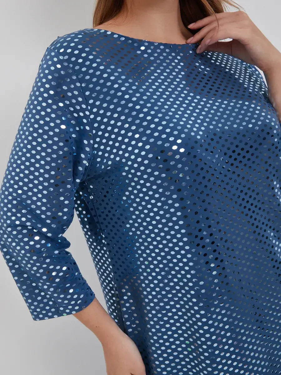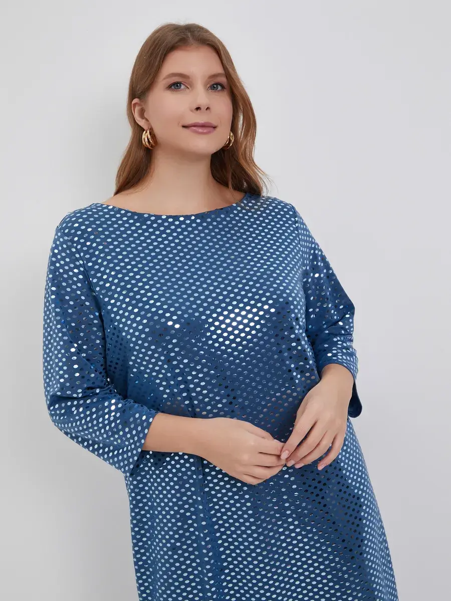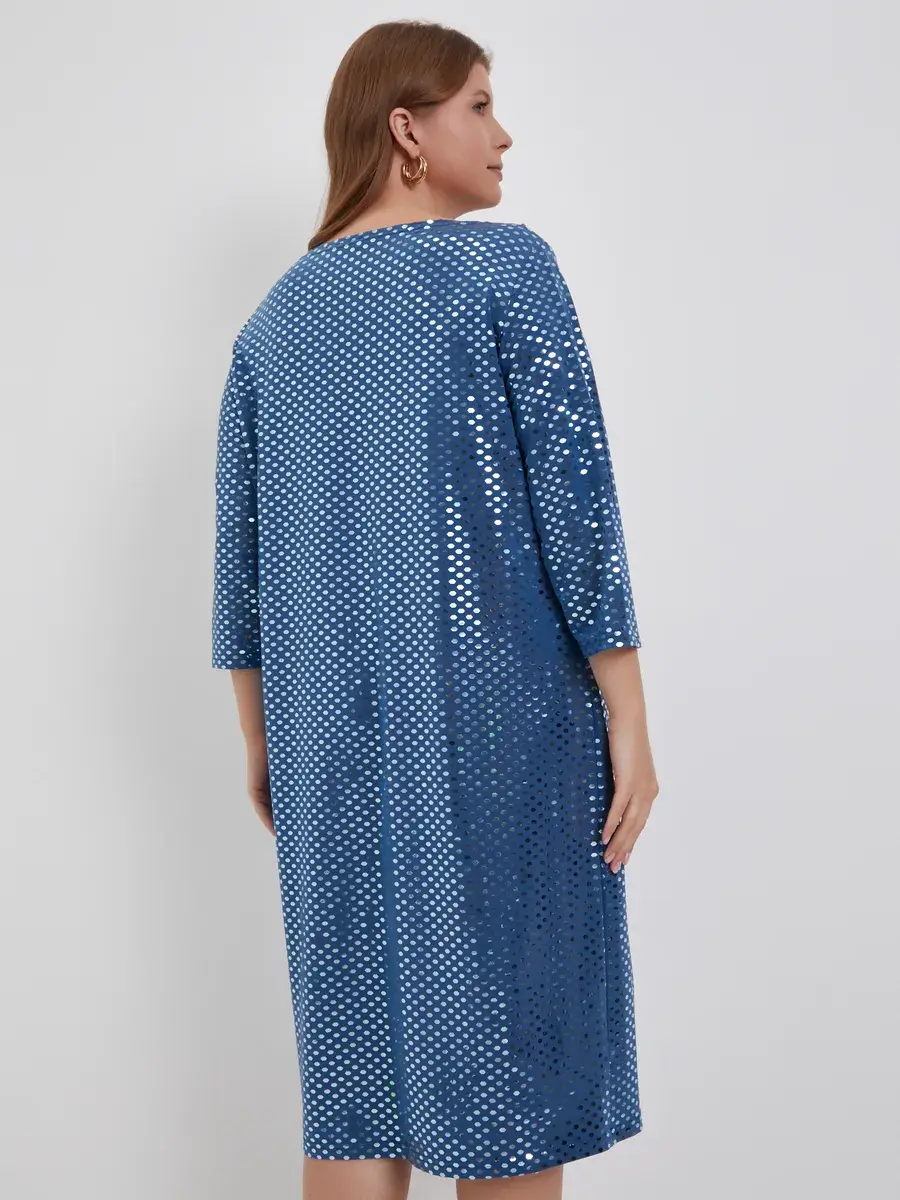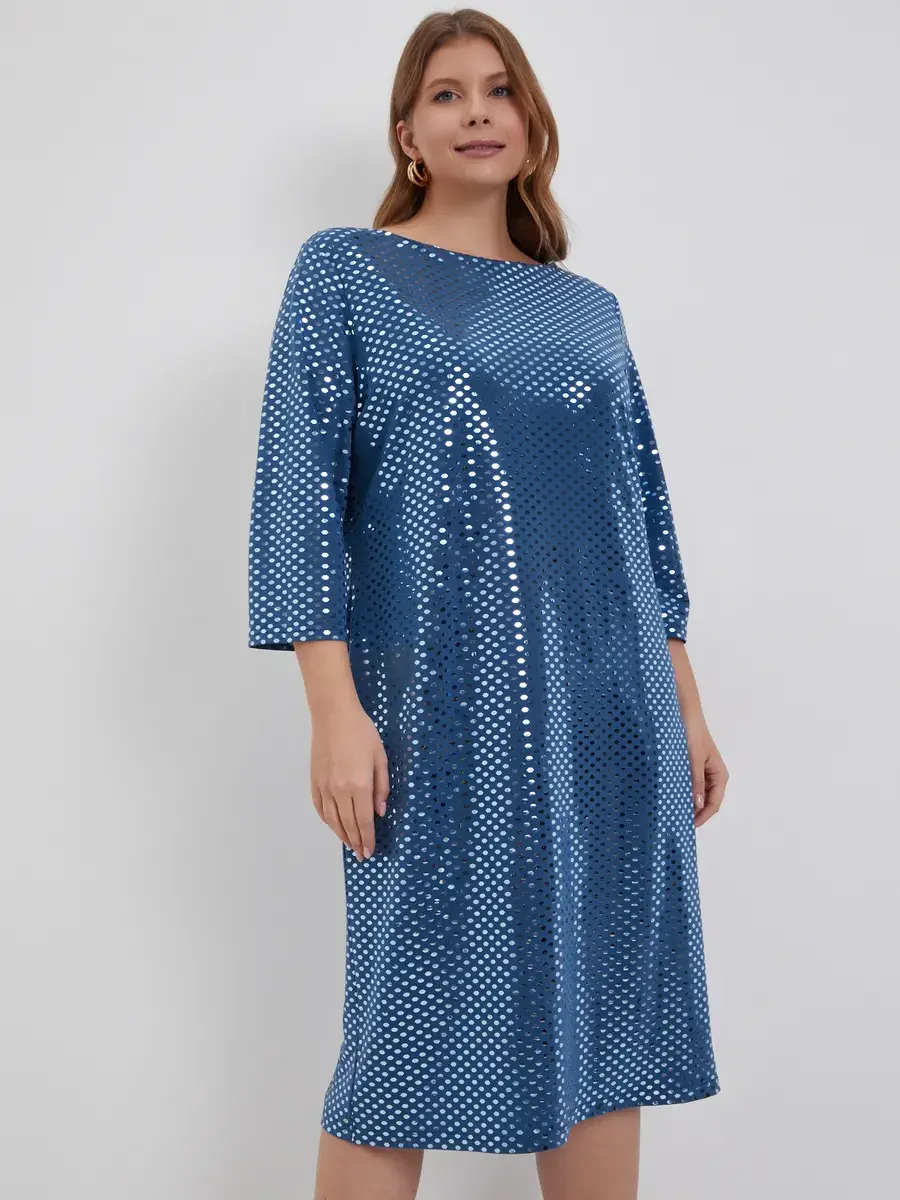 Изысканное нарядное платье от бренда OLSI из ткани с эффектным принтом-глиттером, создающим эффект пайеток. Модель лаконичного прямого кроя, плавно обрисовывающее фигуру; длиной ниже колен; с отрезными втачными рукавами длиной 3/4; вырезом горловины лодочка. Праздничное платье женщинам больших размеров будет хорошо сидеть на фигуре яблоко, перевернутый треугольник, прямойгольник. Наряд с блеском эффектно смотрится, в нем Вы будете украшением вечера! Платье с пайетками прекрасный вариант для праздничного мероприятия, выступлений, коктейльных вечеринок, Новый год или день рождения, на свадьбах, блеск переливается под светом сафитов.