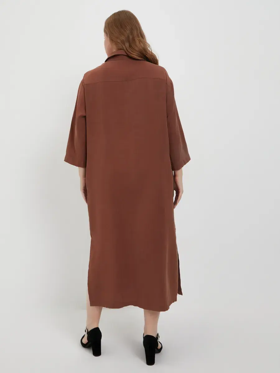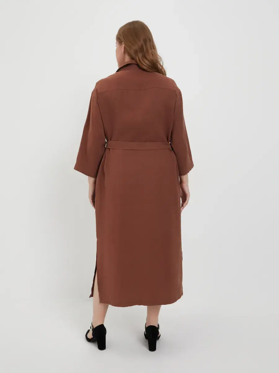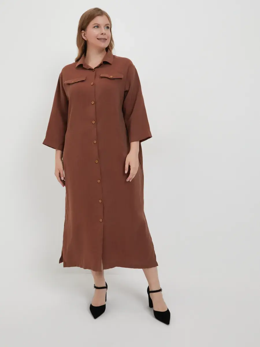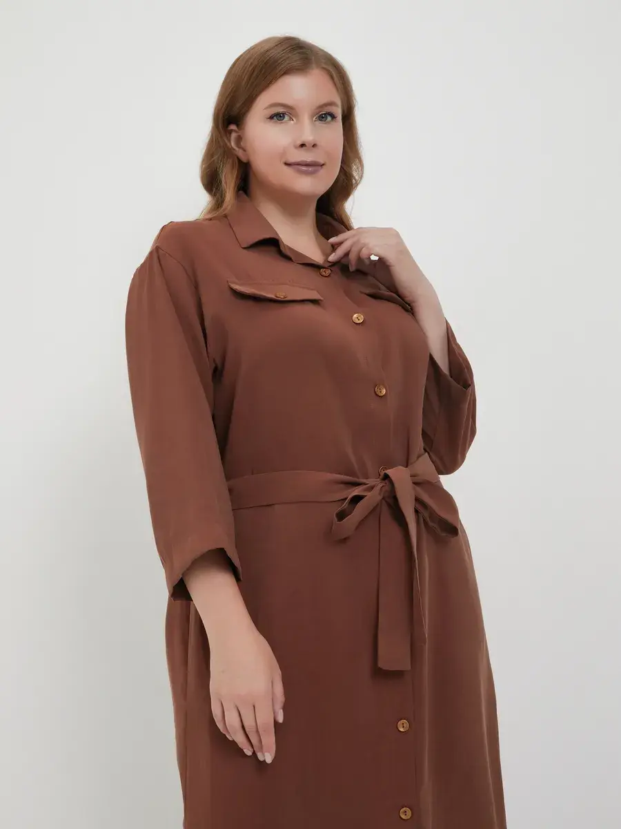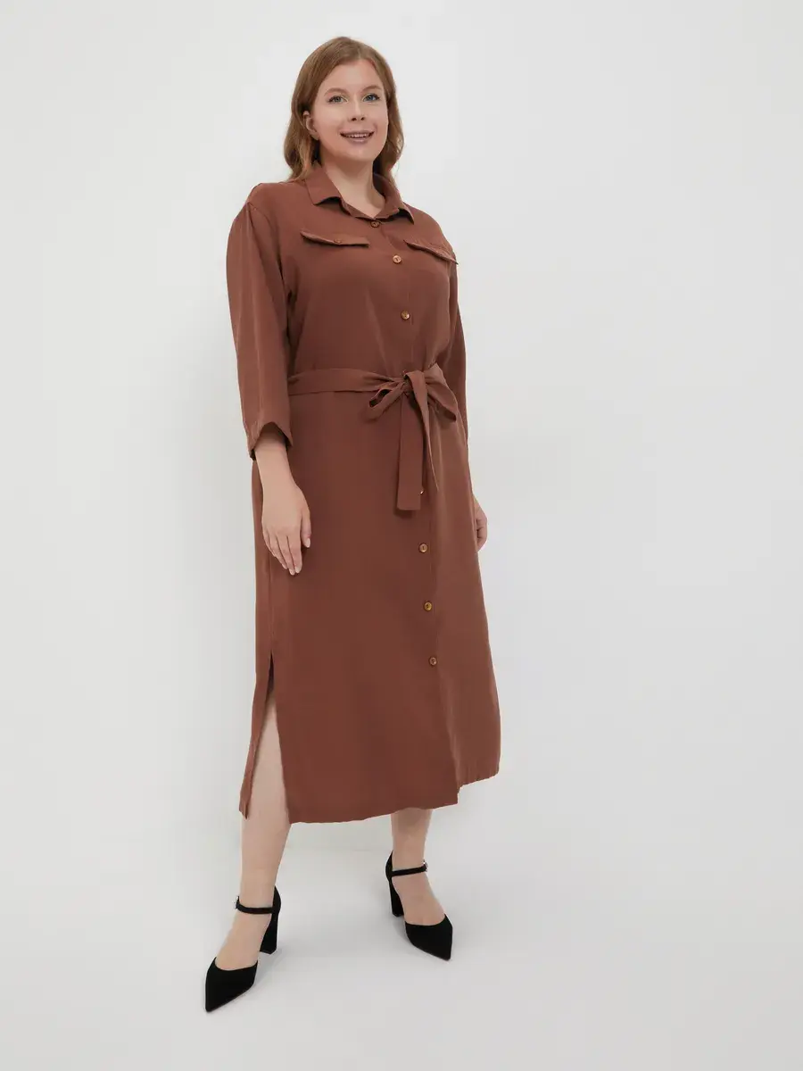 Повседневное женское платье больших размеров от бренда OLSI. Платье женское рубашечного фасона выполнено из мягкого приятного на ощупь текстильного полотна. Платье-рубашка длиной до щиколотки, материал не тянется. Отложной воротник, рукав 7/8, по низу боковые разрезы для удобства. Пояс в комплекте с платьем.