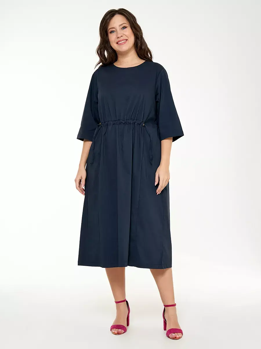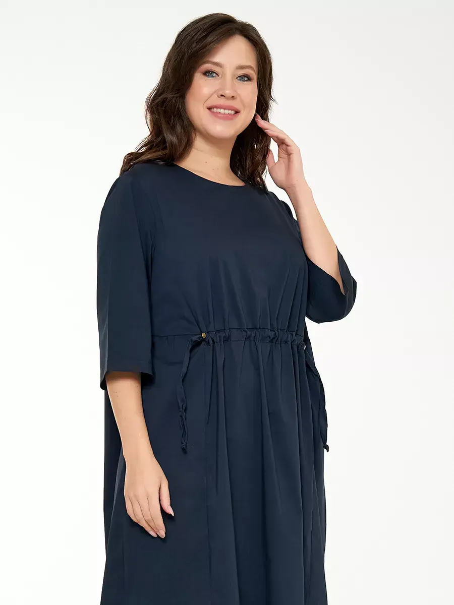 Повседневное женское платье больших размеров от бренда OLSI из хлопкового полотна с эластаном, свободного кроя. Сзади застежка молния. Силуэт можно регулировать завязками, продетыми в кулиску спереди на уровне талии.. Без карманов. Рукав широкий и свободный. Длина по спинке во всех размерах 120см, длина рукава 40см.