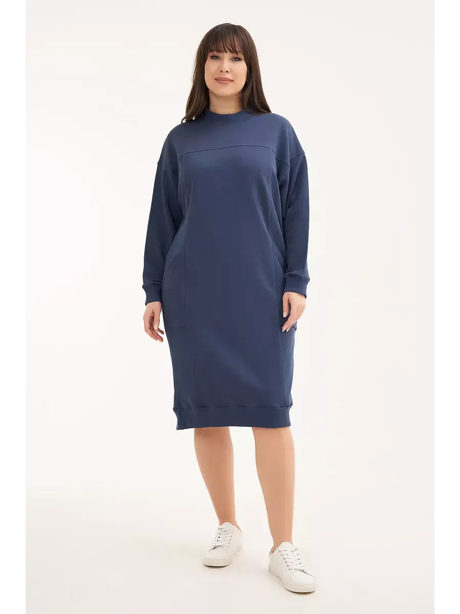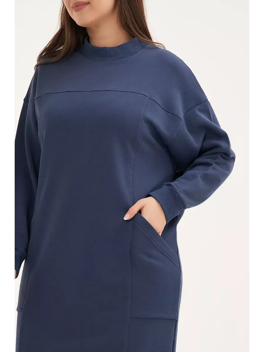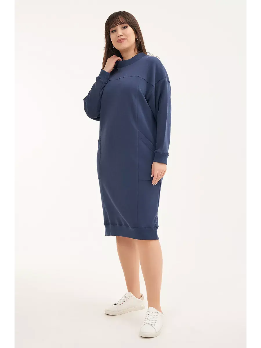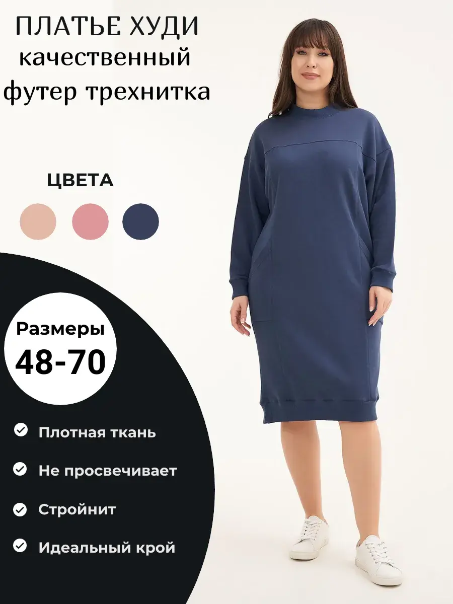 Повседневное женское платье больших размеров выполнено из футера трёхнитки без теплого начеса, прямого кроя с карманами.