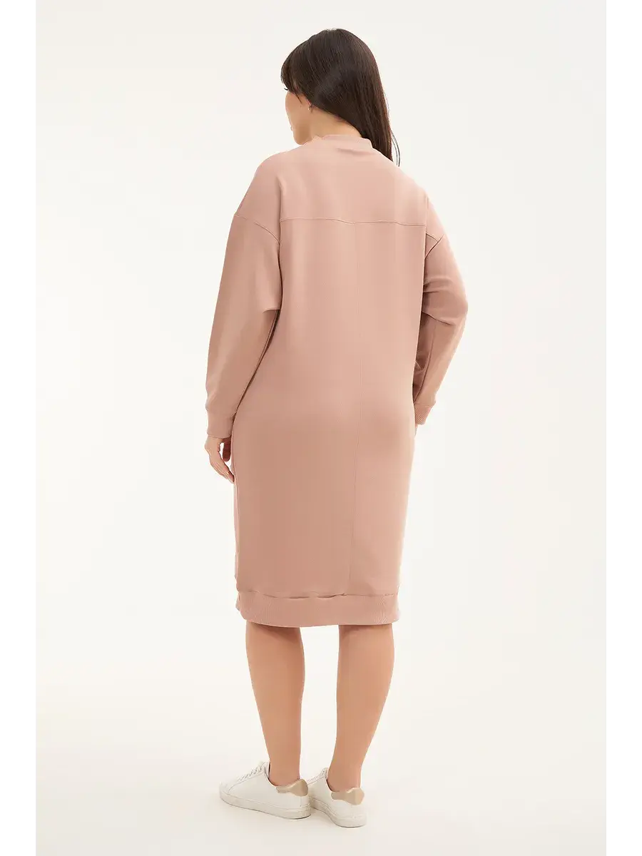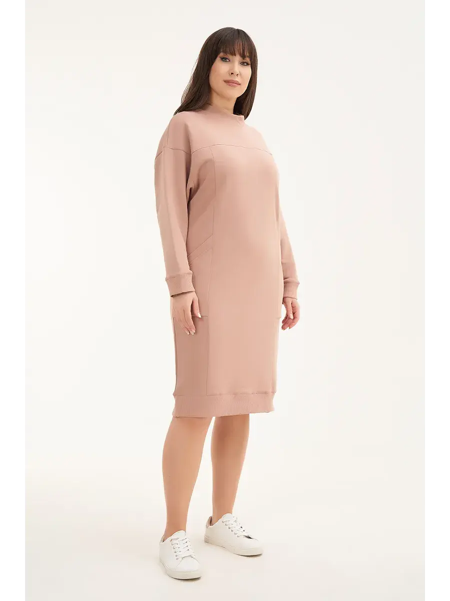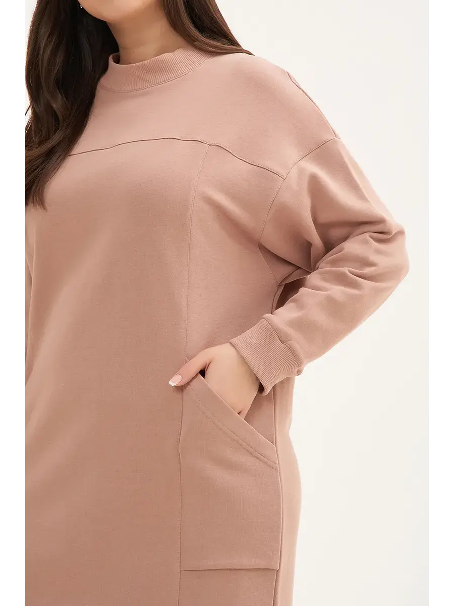 Повседневное женское платье больших размеров выполнено из футера трёхнитки без теплого начеса, прямого кроя с карманами.