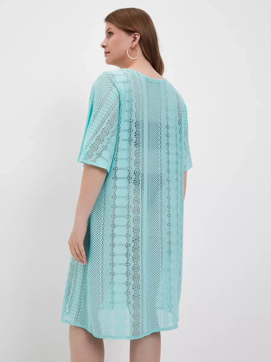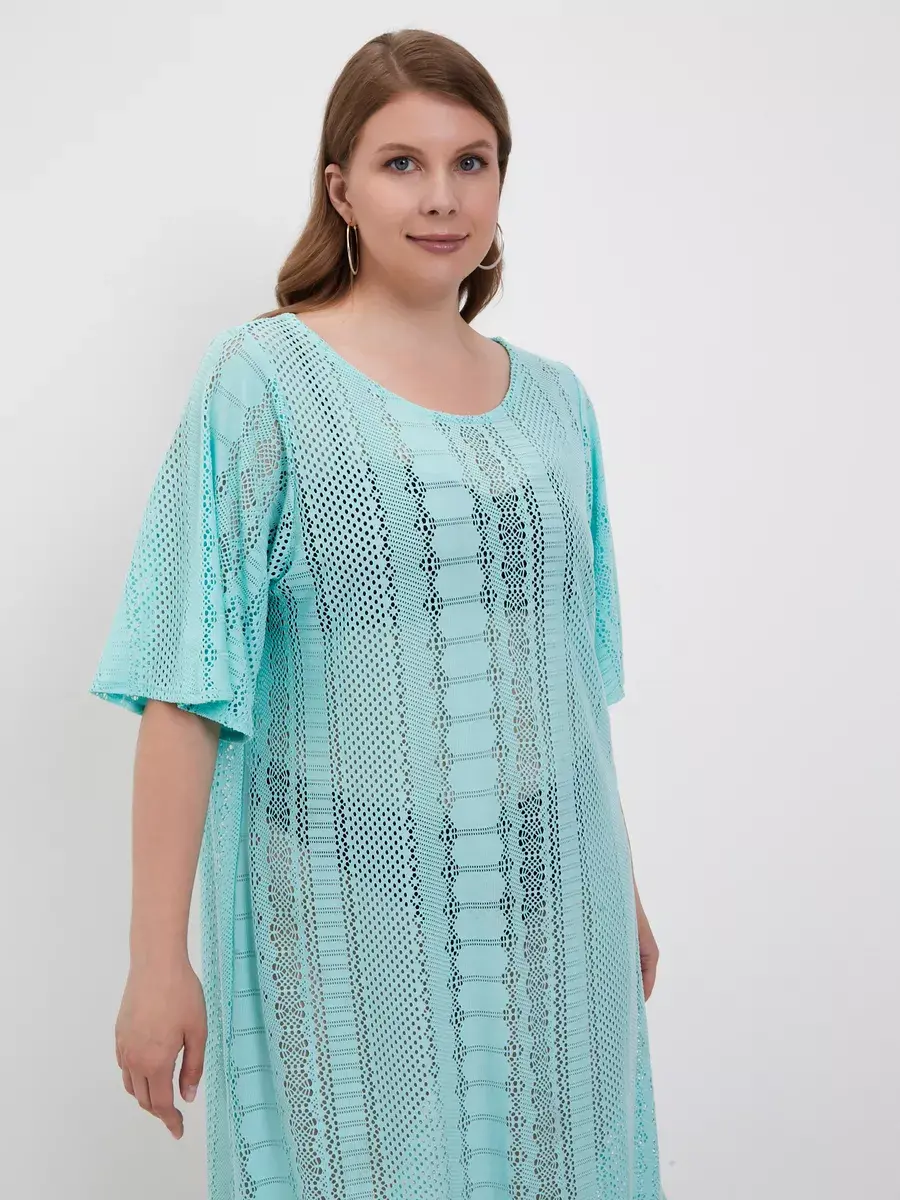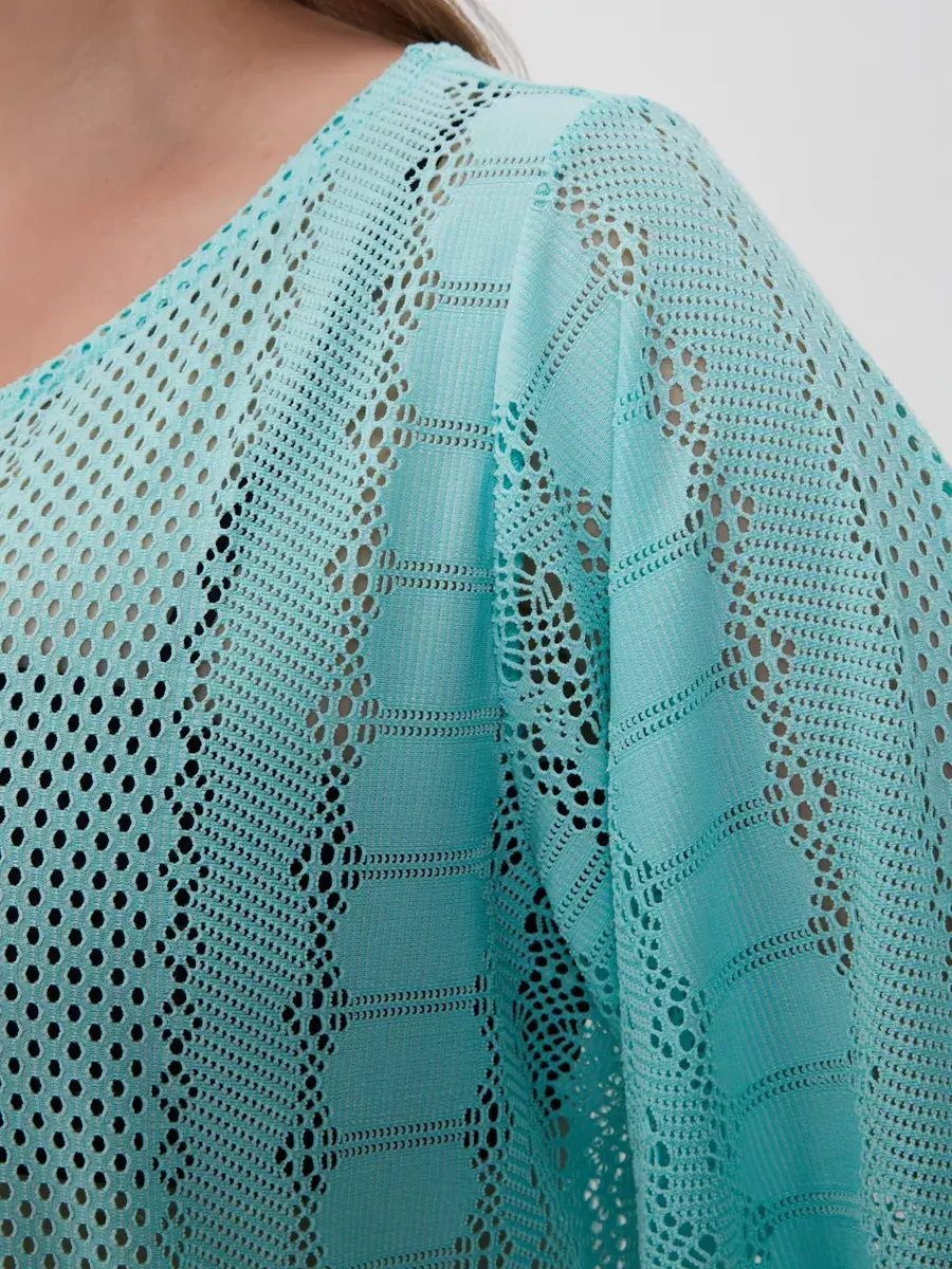 Пляжное платье - туника сетка женская больших размеров от бренда Олси, выполнена из узорного полупрозрачного материала. Идеальный вариант на купальник. Модель для полных женщин, с широким рукавом, скрывает проблемные зоны, пропорции накидля для пляжного отдыха визуально удлиняют силуэт. Также можно стилизовать изделие для повседневного ношения летом на отдыхе, или в городе.