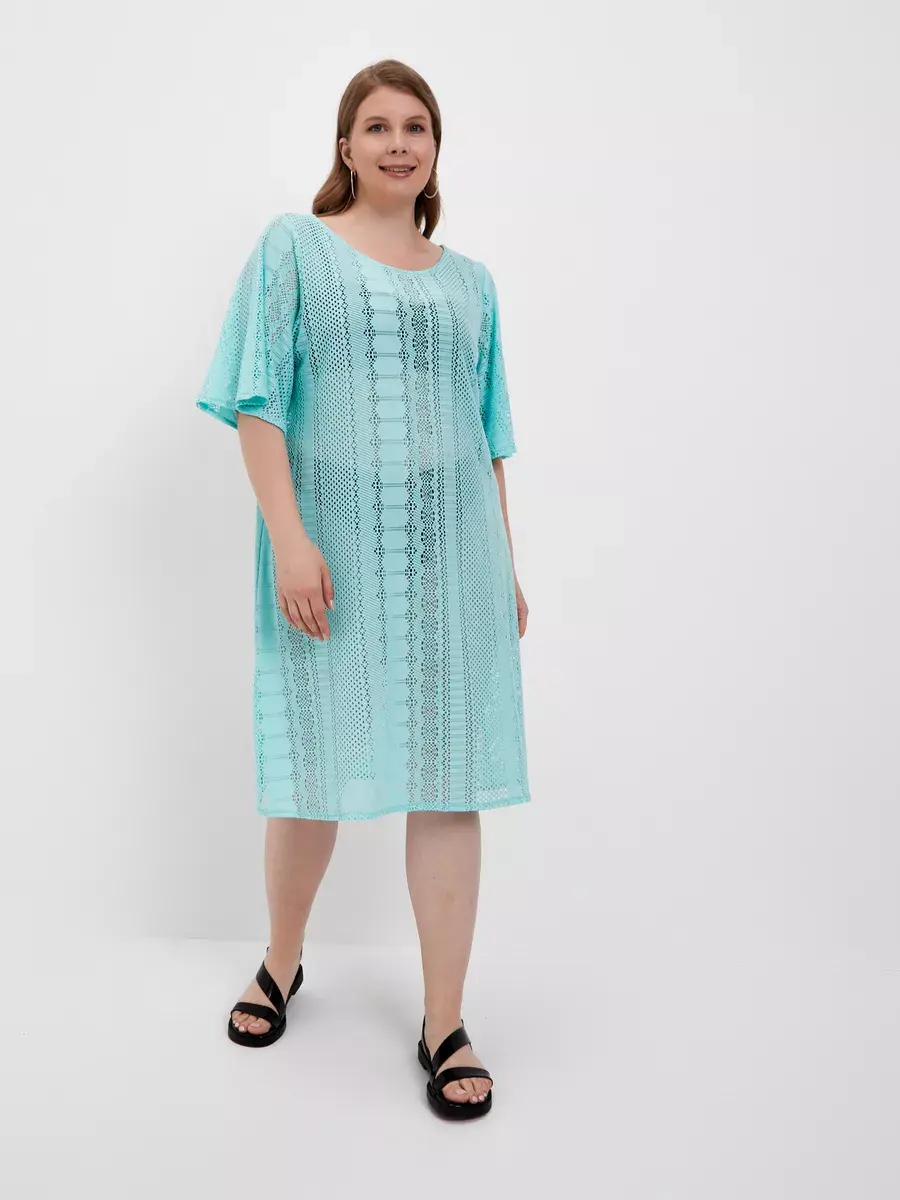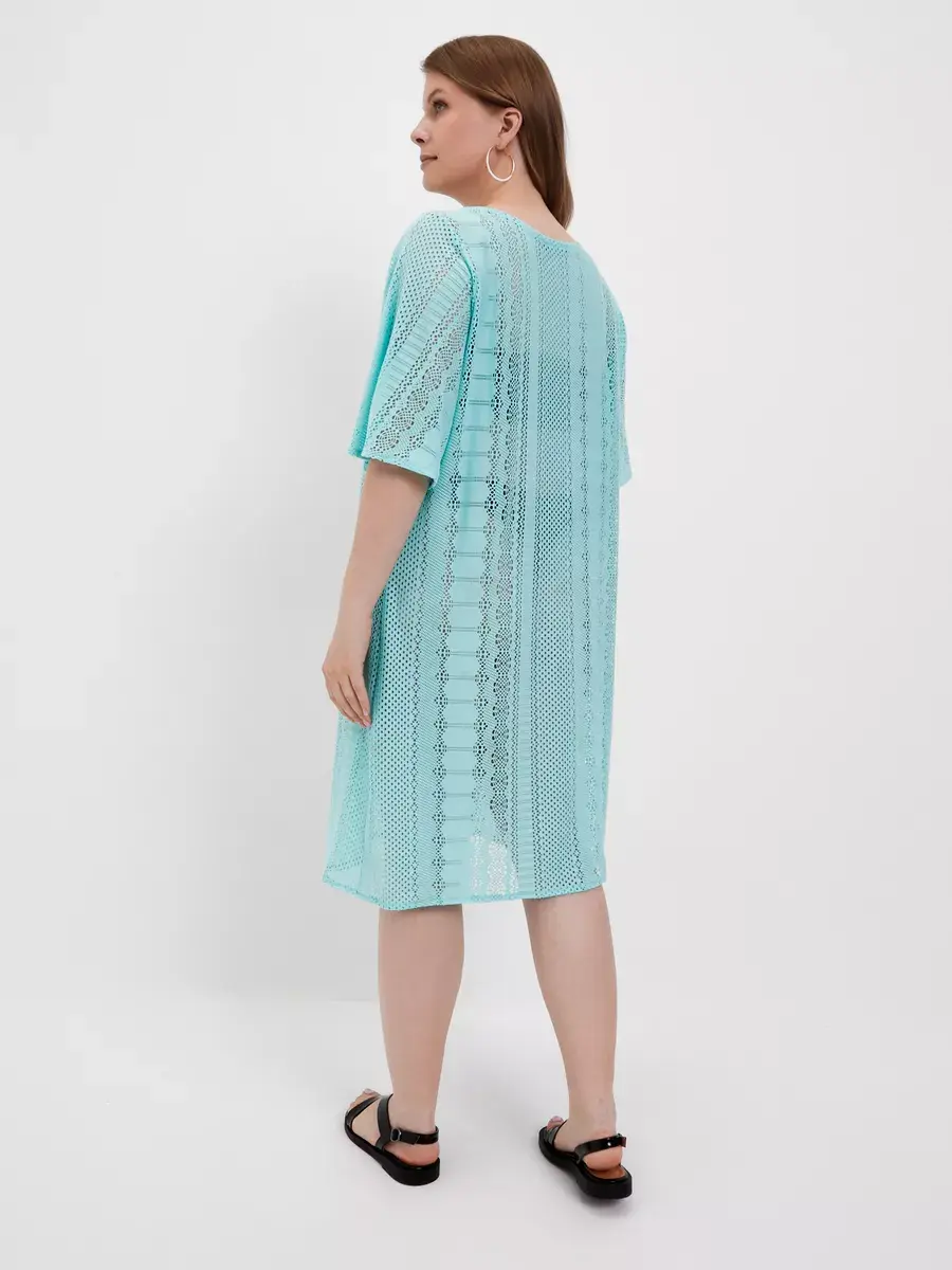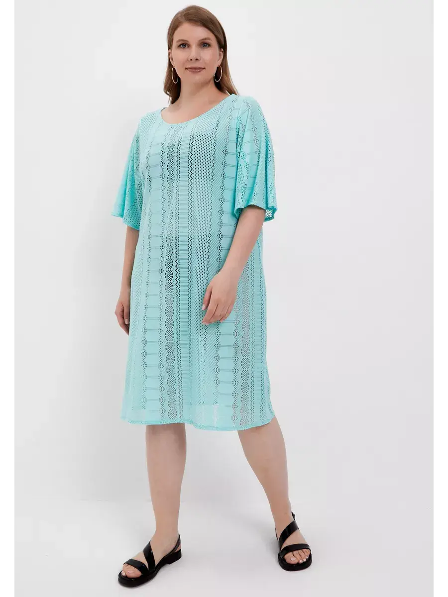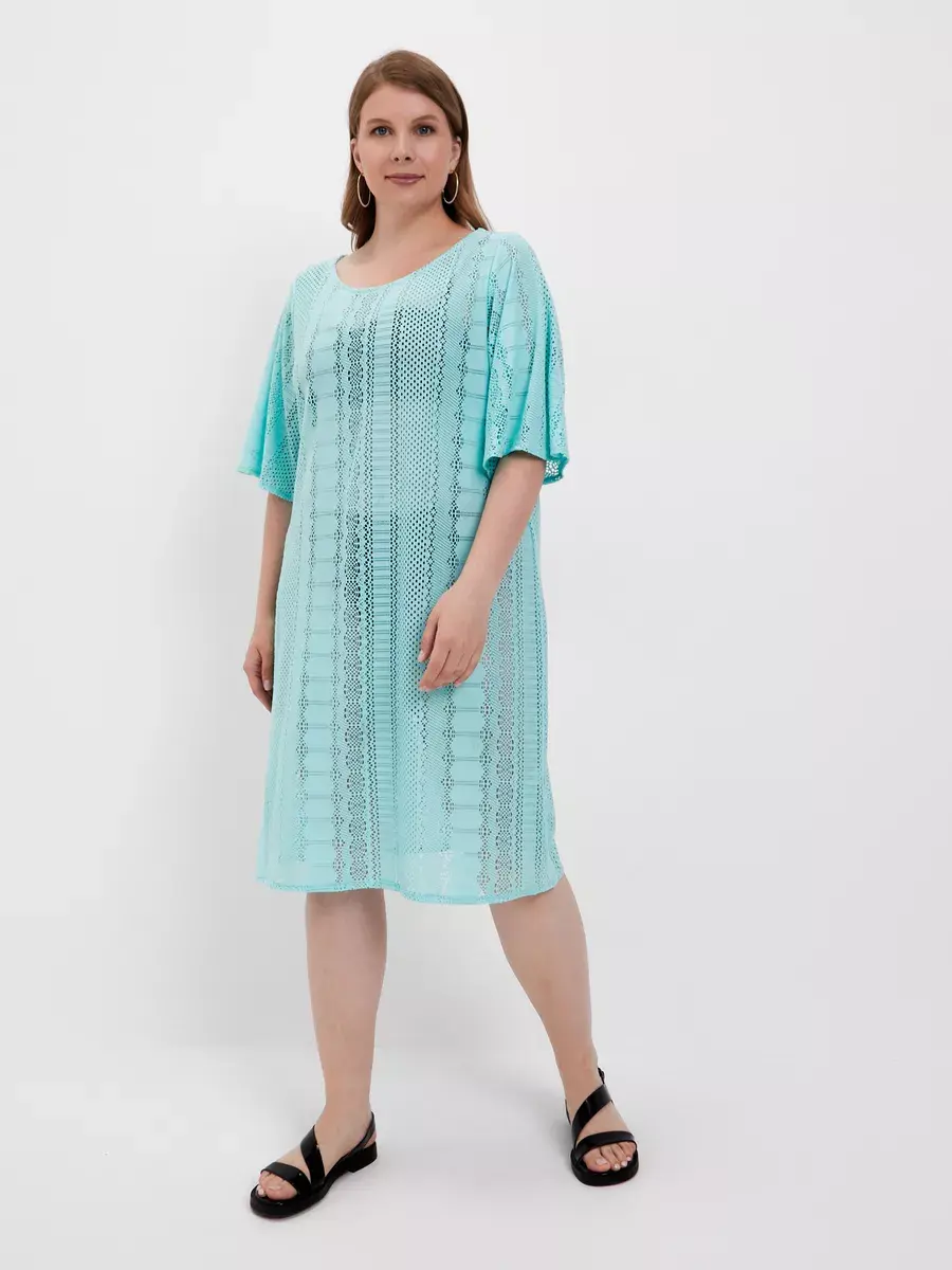 Пляжное платье - туника сетка женская больших размеров от бренда Олси, выполнена из узорного полупрозрачного материала. Идеальный вариант на купальник. Модель для полных женщин, с широким рукавом, скрывает проблемные зоны, пропорции накидля для пляжного отдыха визуально удлиняют силуэт. Также можно стилизовать изделие для повседневного ношения летом на отдыхе, или в городе.