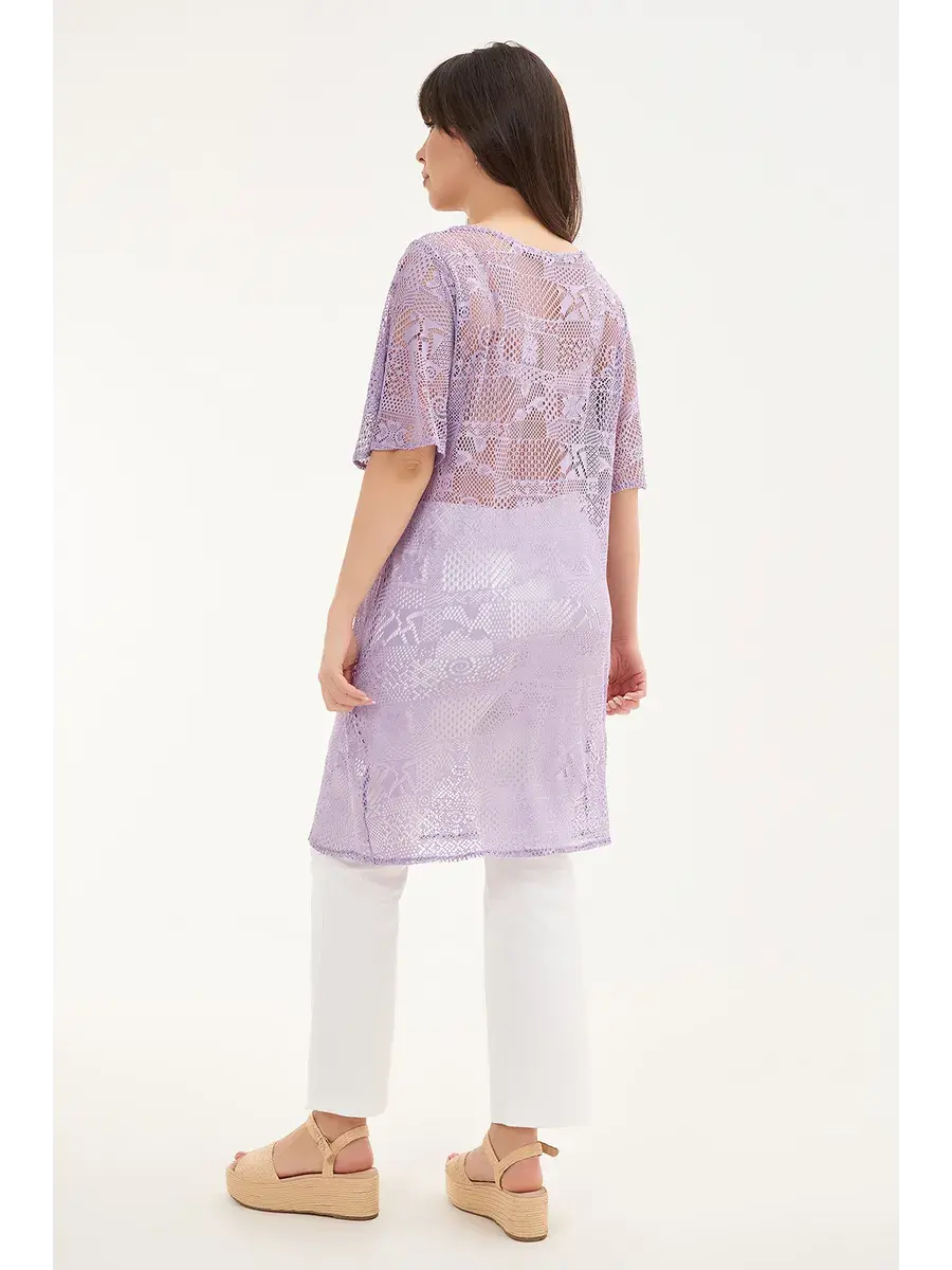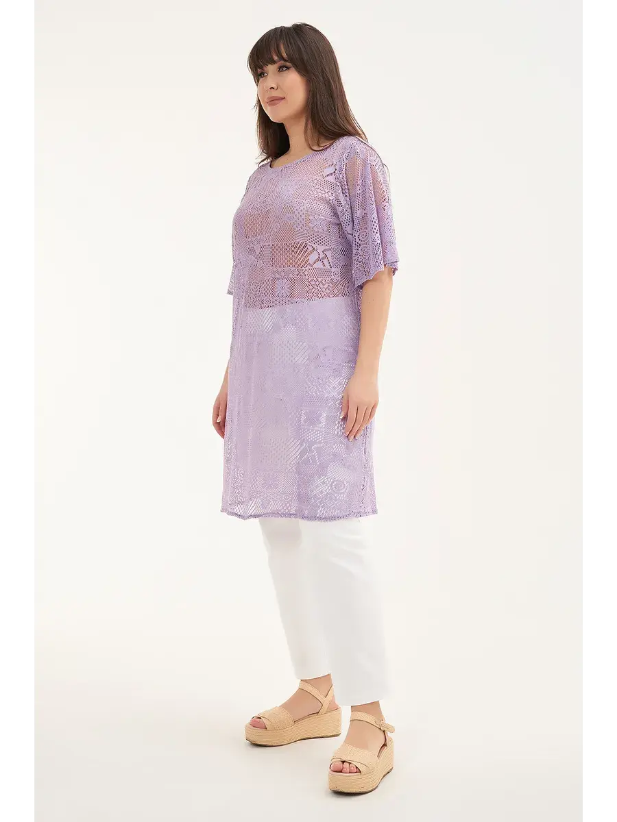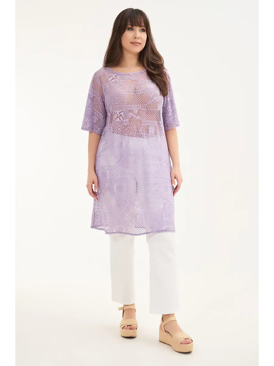 Пляжное платье - туника сетка женская больших размеров от бренда Олси, выполнена из узорного полупрозрачного материала. Идеальный вариант на купальник. Модель для полных женщин, с широким рукавом, скрывает проблемные зоны, пропорции накидля для пляжного отдыха визуально удлиняют силуэт. Также можно стилизовать изделие для повседневного ношения летом на отдыхе, или в городе.