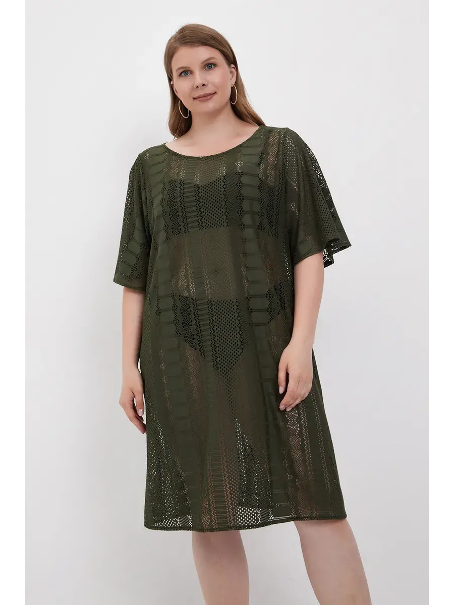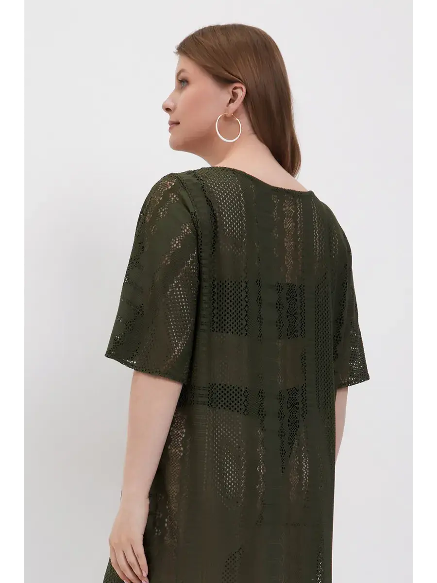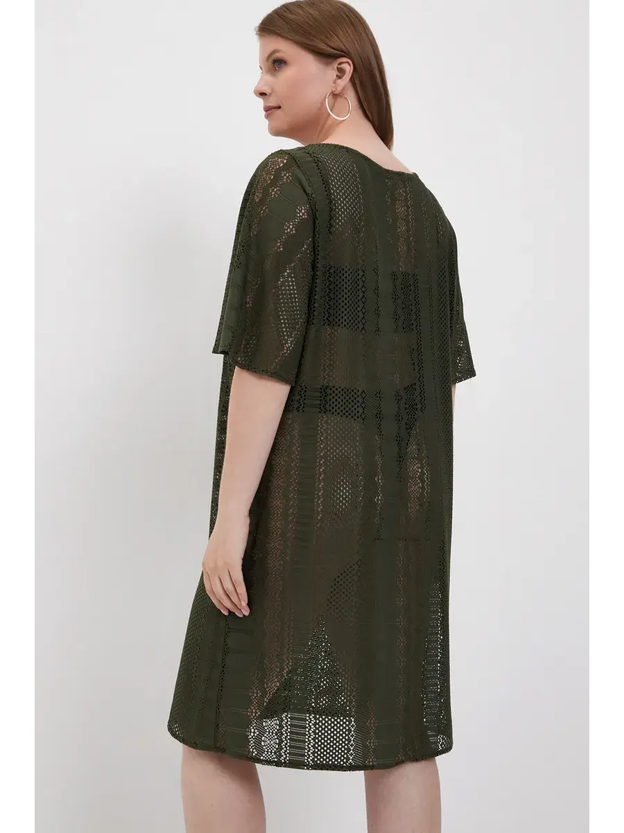 Пляжное платье - туника сетка женская больших размеров от бренда Олси, выполнена из узорного полупрозрачного материала. Идеальный вариант на купальник. Модель для полных женщин, с широким рукавом, скрывает проблемные зоны, пропорции накидля для пляжного отдыха визуально удлиняют силуэт. Также можно стилизовать изделие для повседневного ношения летом на отдыхе, или в городе.