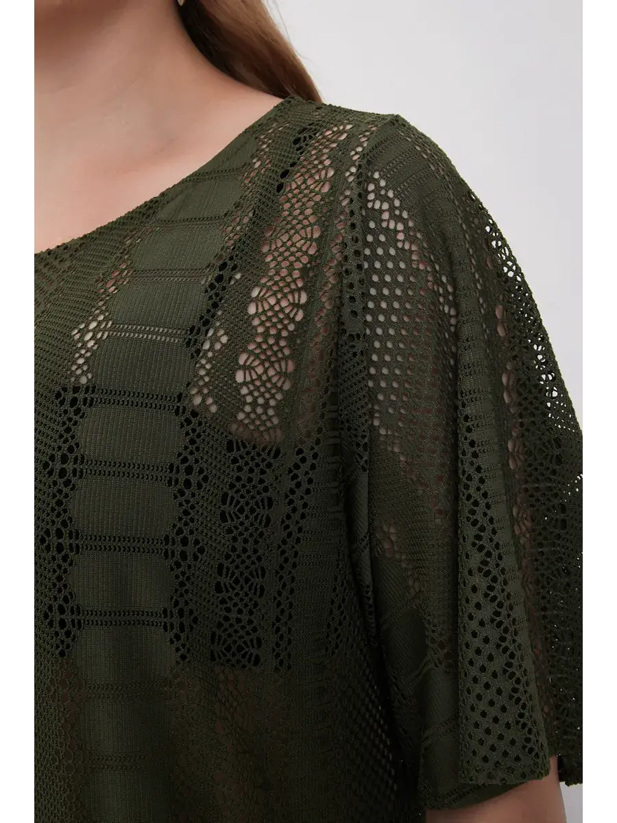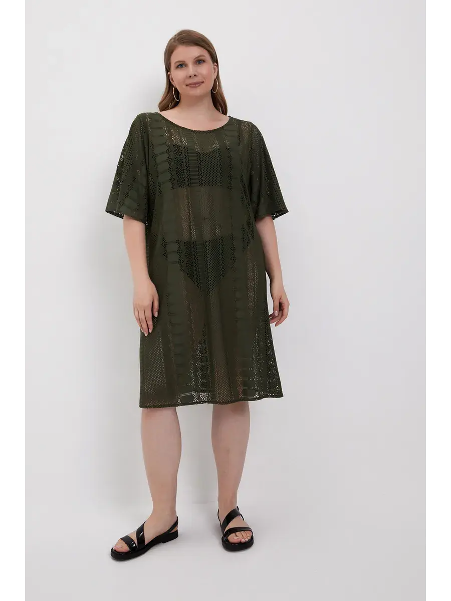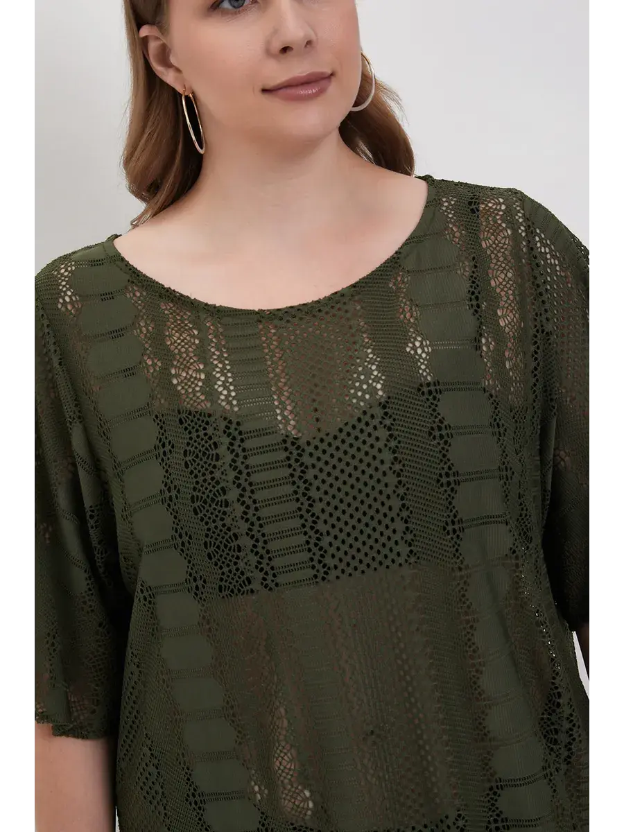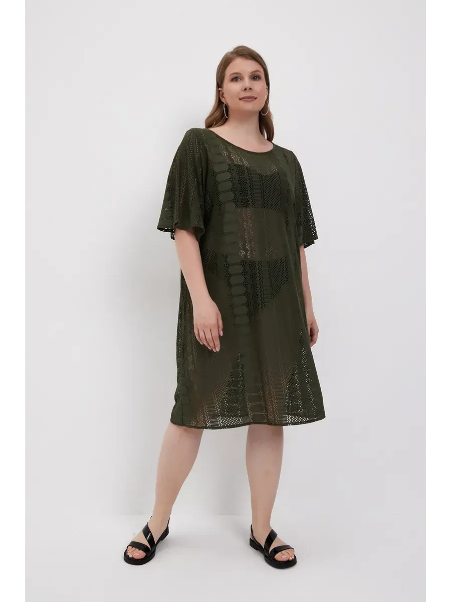 Пляжное платье - туника сетка женская больших размеров от бренда Олси, выполнена из узорного полупрозрачного материала. Идеальный вариант на купальник. Модель для полных женщин, с широким рукавом, скрывает проблемные зоны, пропорции накидля для пляжного отдыха визуально удлиняют силуэт. Также можно стилизовать изделие для повседневного ношения летом на отдыхе, или в городе.
