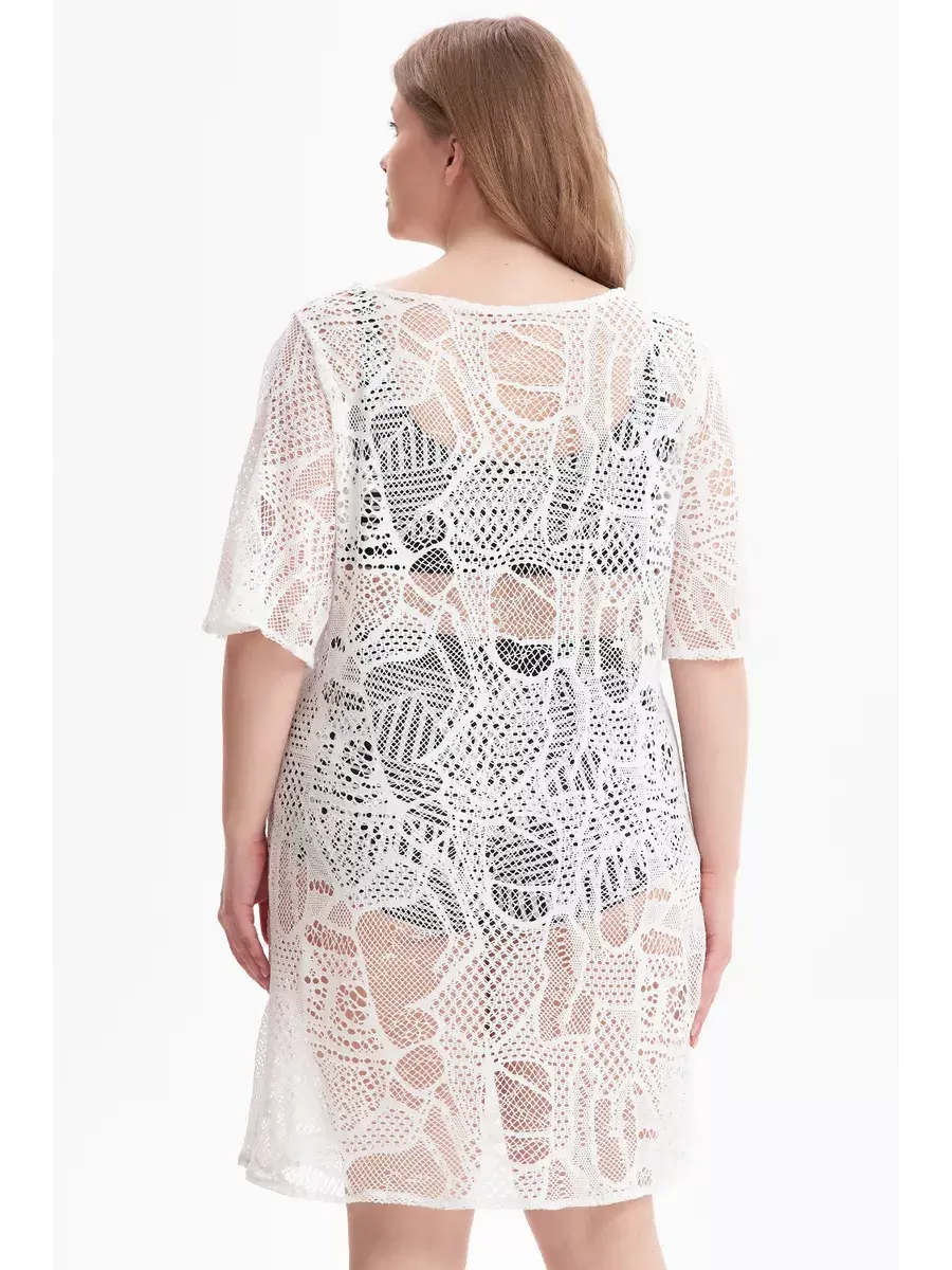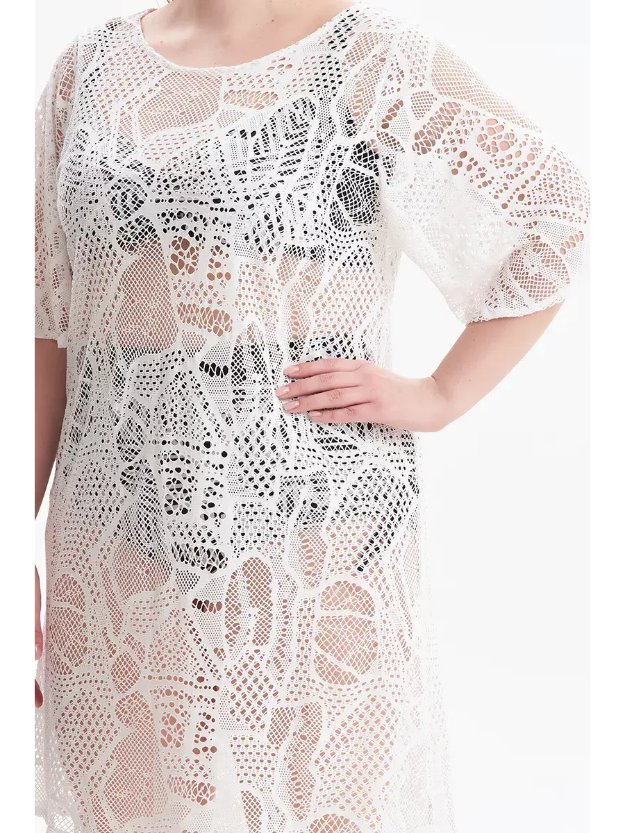 Пляжное платье - туника сетка женская больших размеров от бренда Олси, выполнена из узорного полупрозрачного материала. Идеальный вариант на купальник. Модель для полных женщин, с широким рукавом, скрывает проблемные зоны, пропорции накидля для пляжного отдыха визуально удлиняют силуэт. Также можно стилизовать изделие для повседневного ношения летом на отдыхе, или в городе.