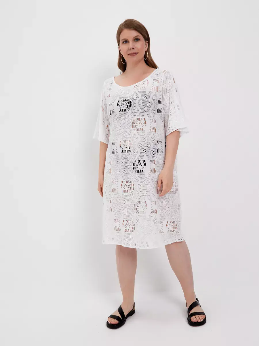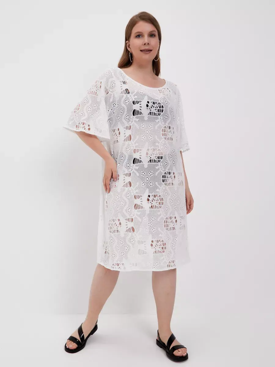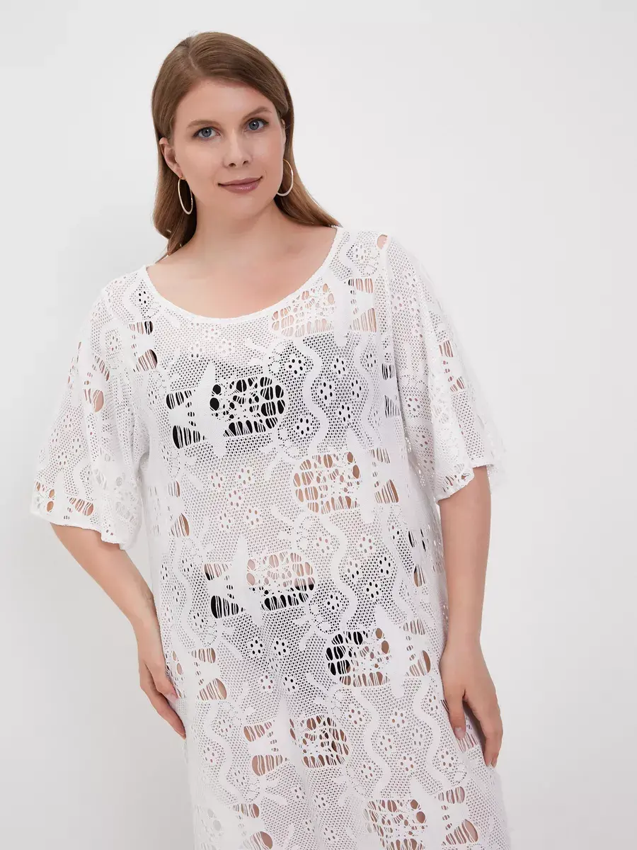 Пляжное платье - туника сетка женская больших размеров от бренда Олси, выполнена из узорного полупрозрачного материала. Идеальный вариант на купальник. Модель для полных женщин, с широким рукавом, скрывает проблемные зоны, пропорции накидля для пляжного отдыха визуально удлиняют силуэт. Также можно стилизовать изделие для повседневного ношения летом на отдыхе, или в городе.