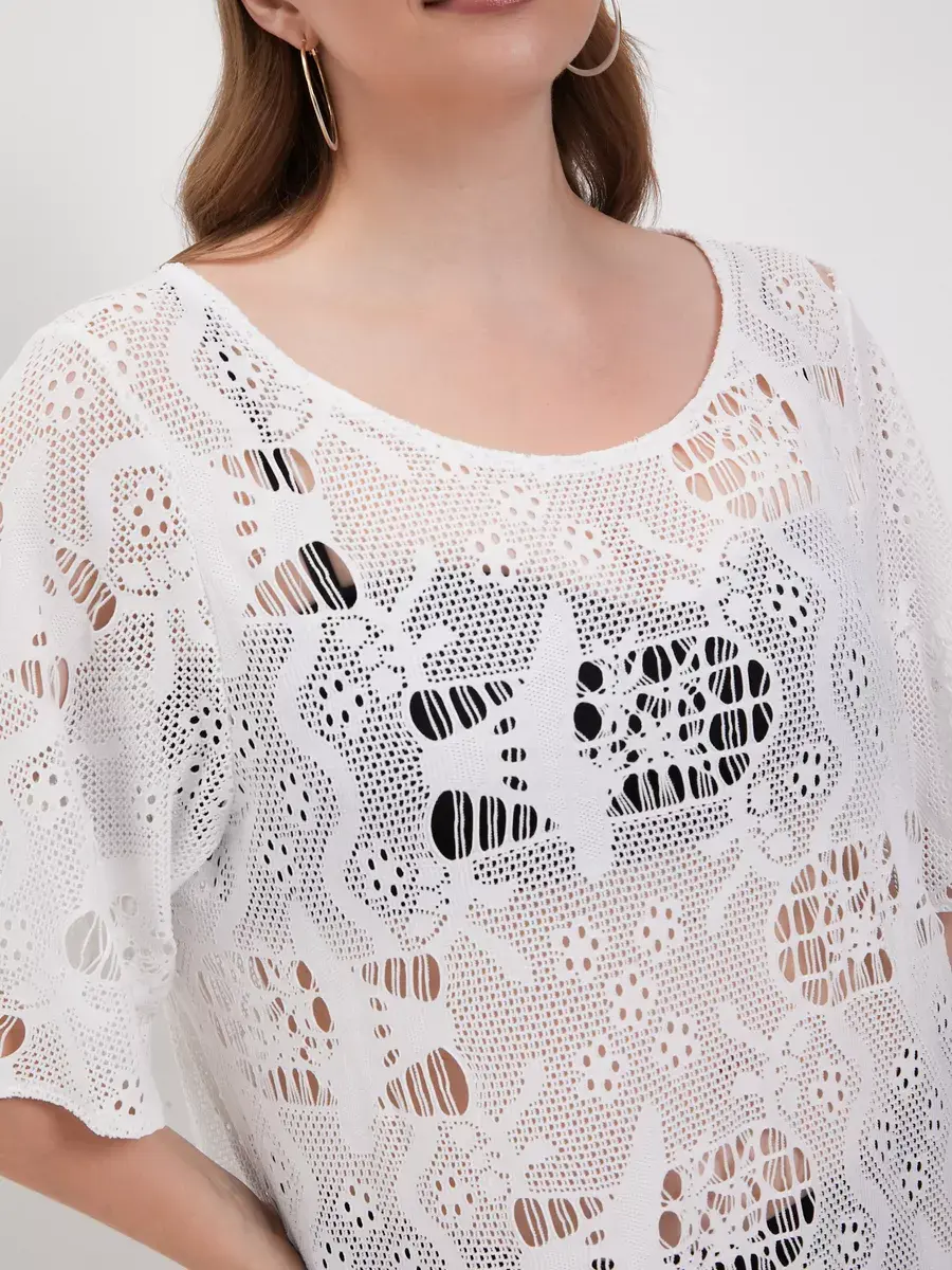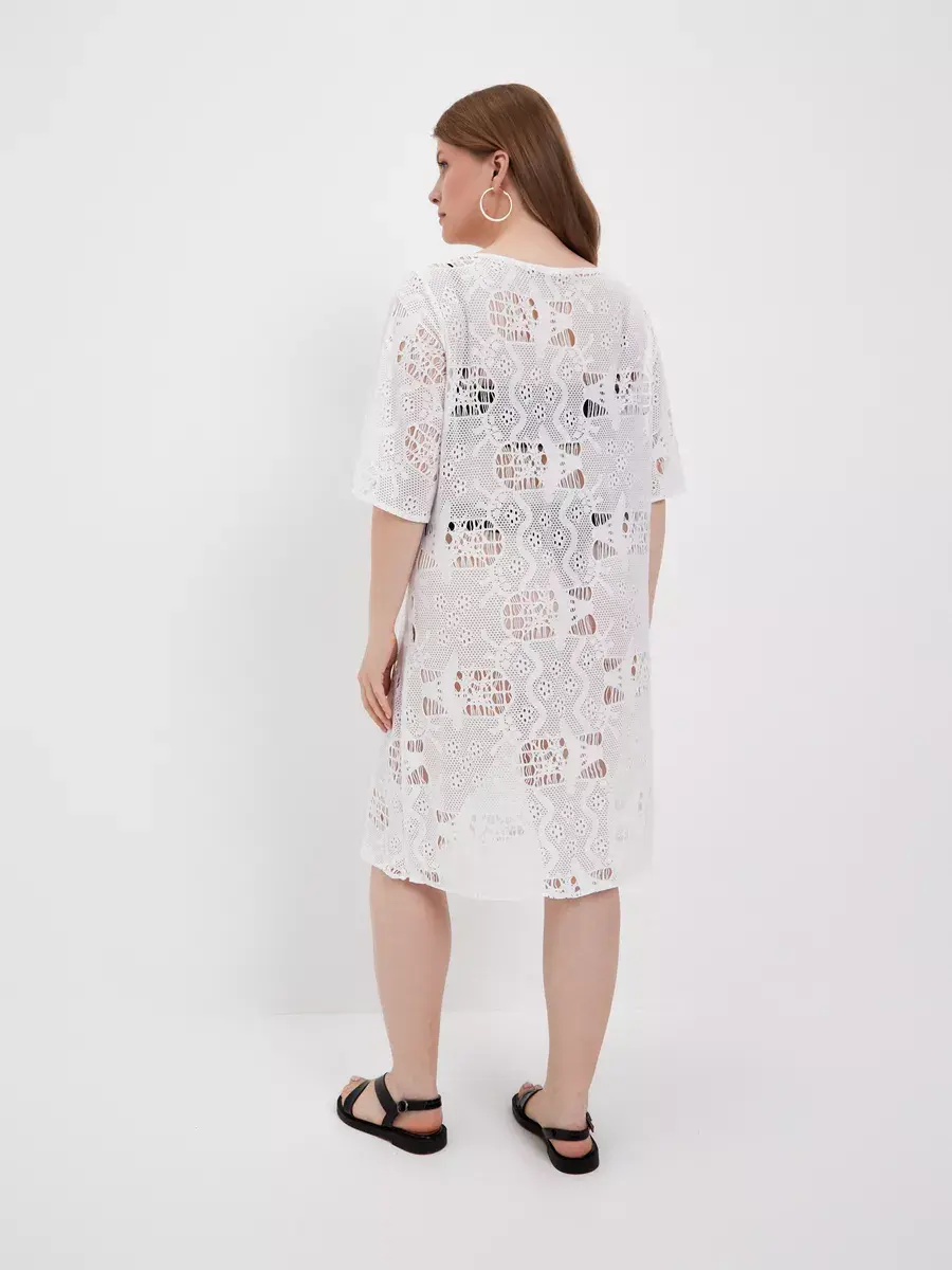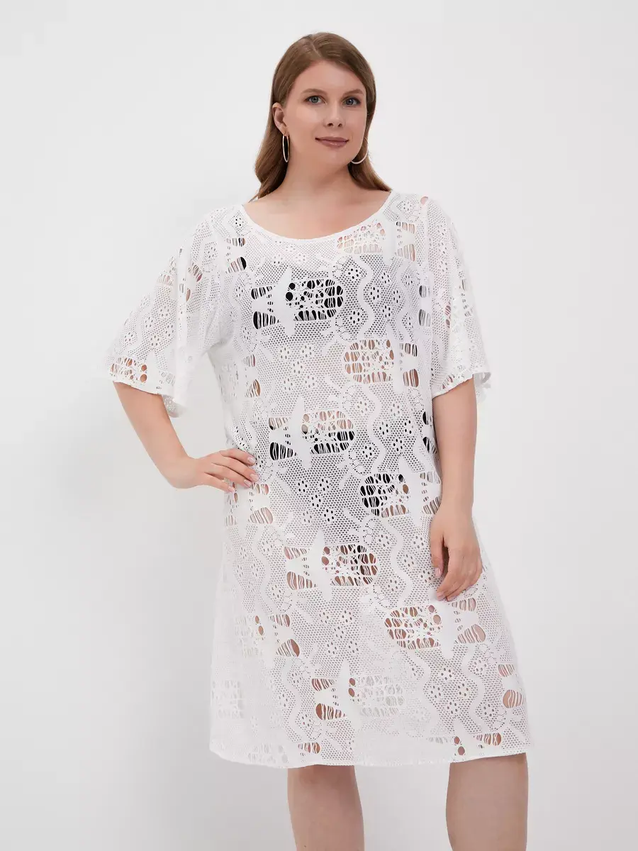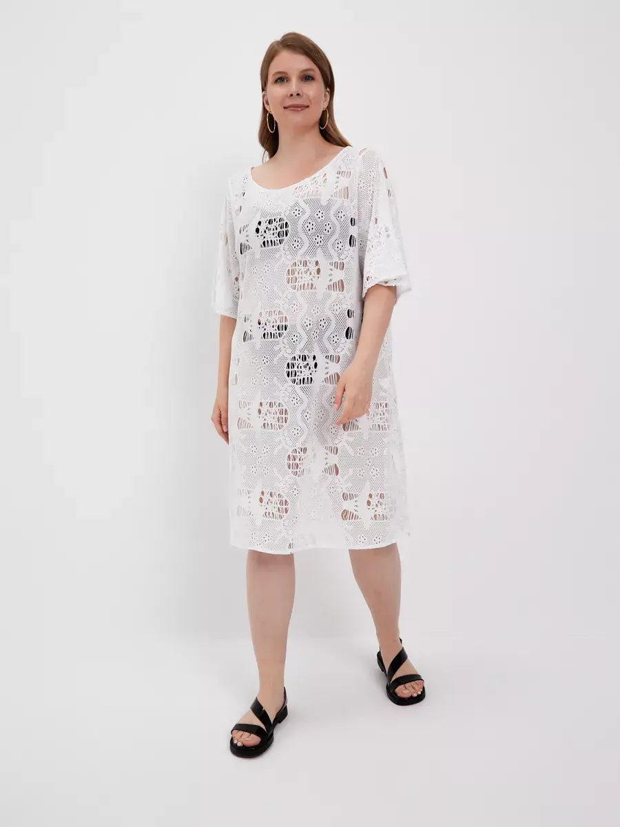 Пляжное платье - туника сетка женская больших размеров от бренда Олси, выполнена из узорного полупрозрачного материала. Идеальный вариант на купальник. Модель для полных женщин, с широким рукавом, скрывает проблемные зоны, пропорции накидля для пляжного отдыха визуально удлиняют силуэт. Также можно стилизовать изделие для повседневного ношения летом на отдыхе, или в городе.