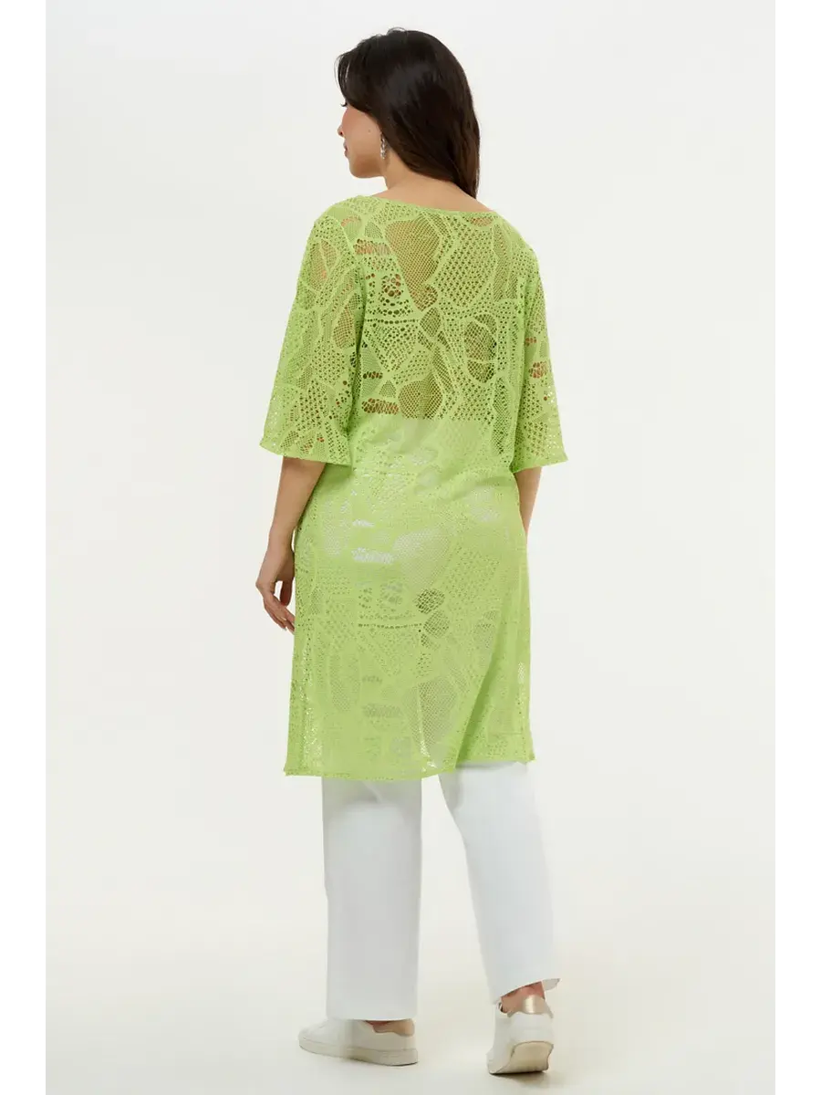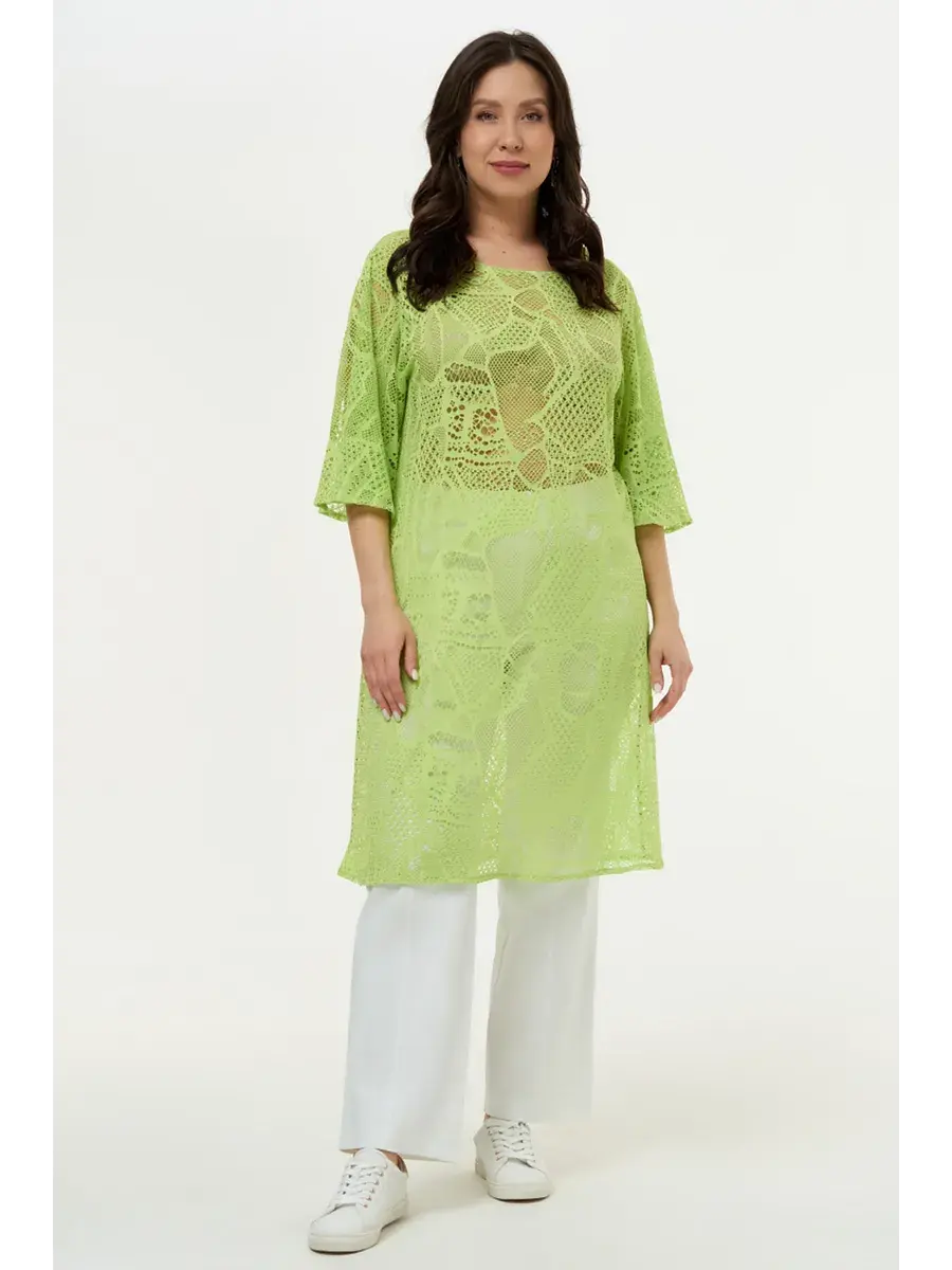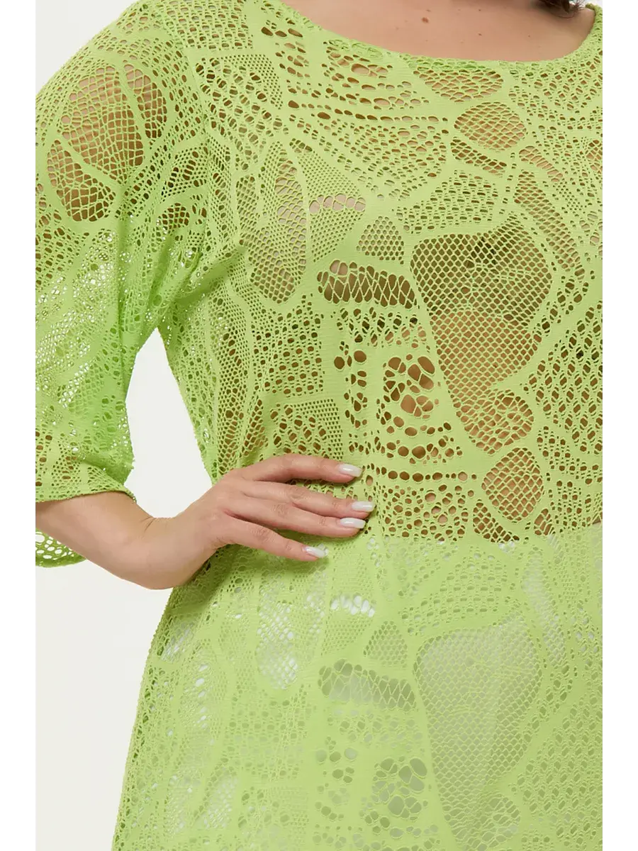 Пляжное платье - туника сетка женская больших размеров от бренда Олси, выполнена из узорного полупрозрачного материала. Идеальный вариант на купальник. Модель для полных женщин, с широким рукавом, скрывает проблемные зоны, пропорции накидля для пляжного отдыха визуально удлиняют силуэт. Также можно стилизовать изделие для повседневного ношения летом на отдыхе, или в городе.