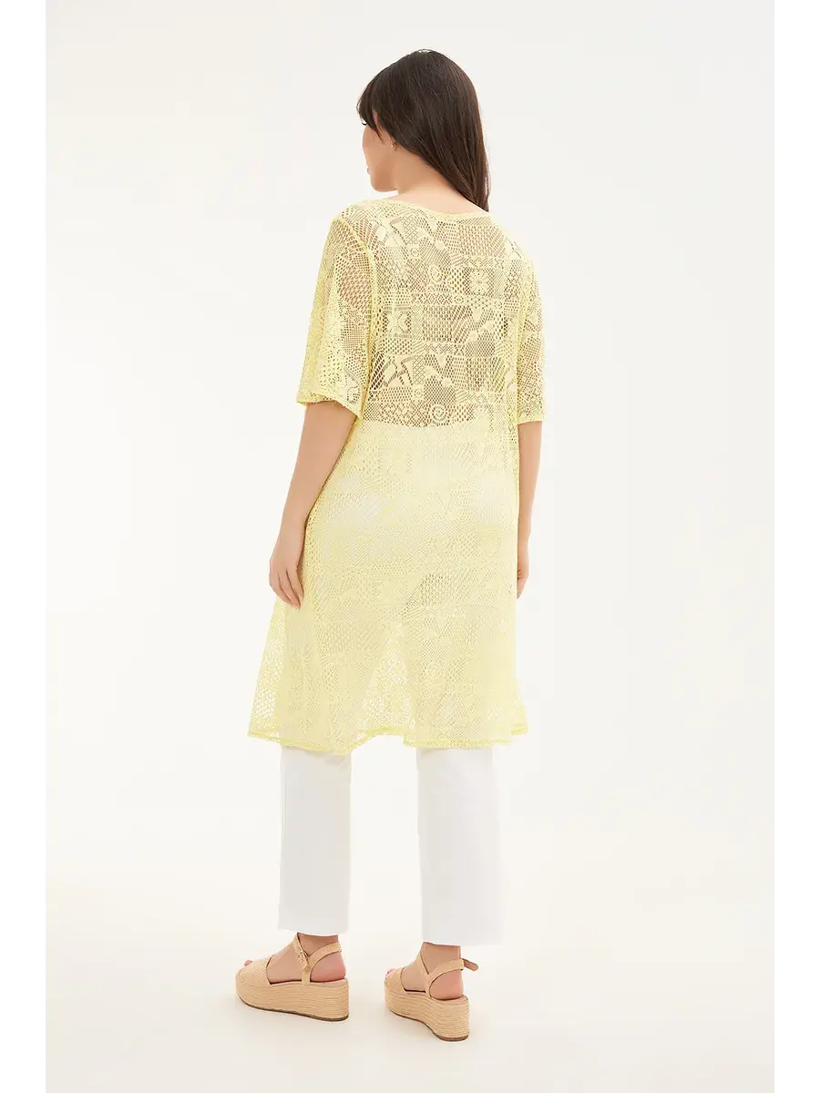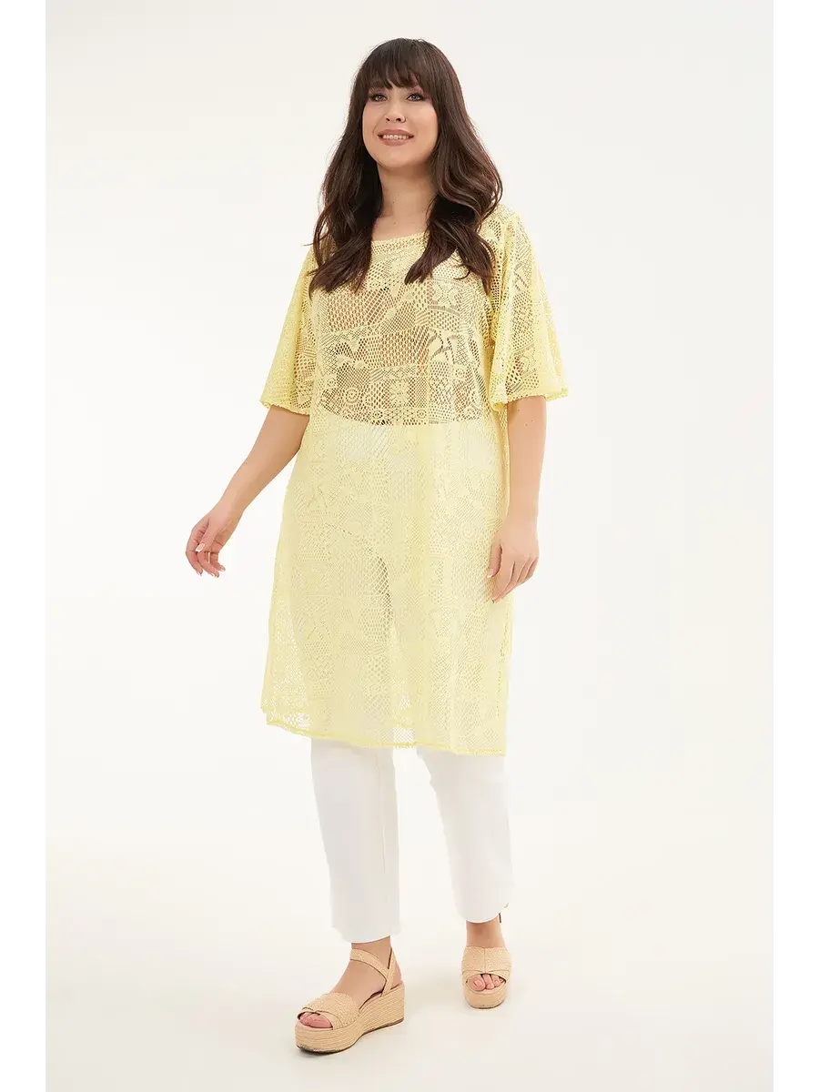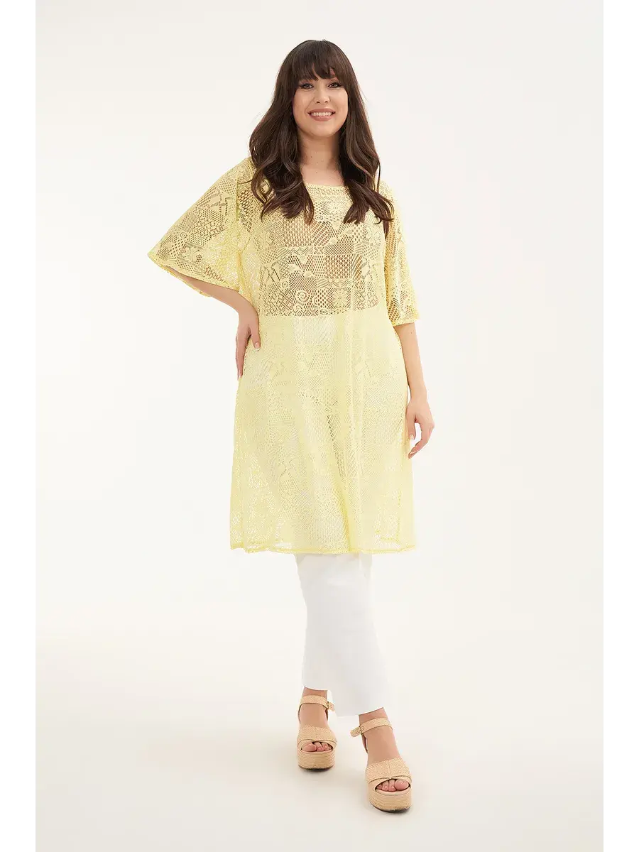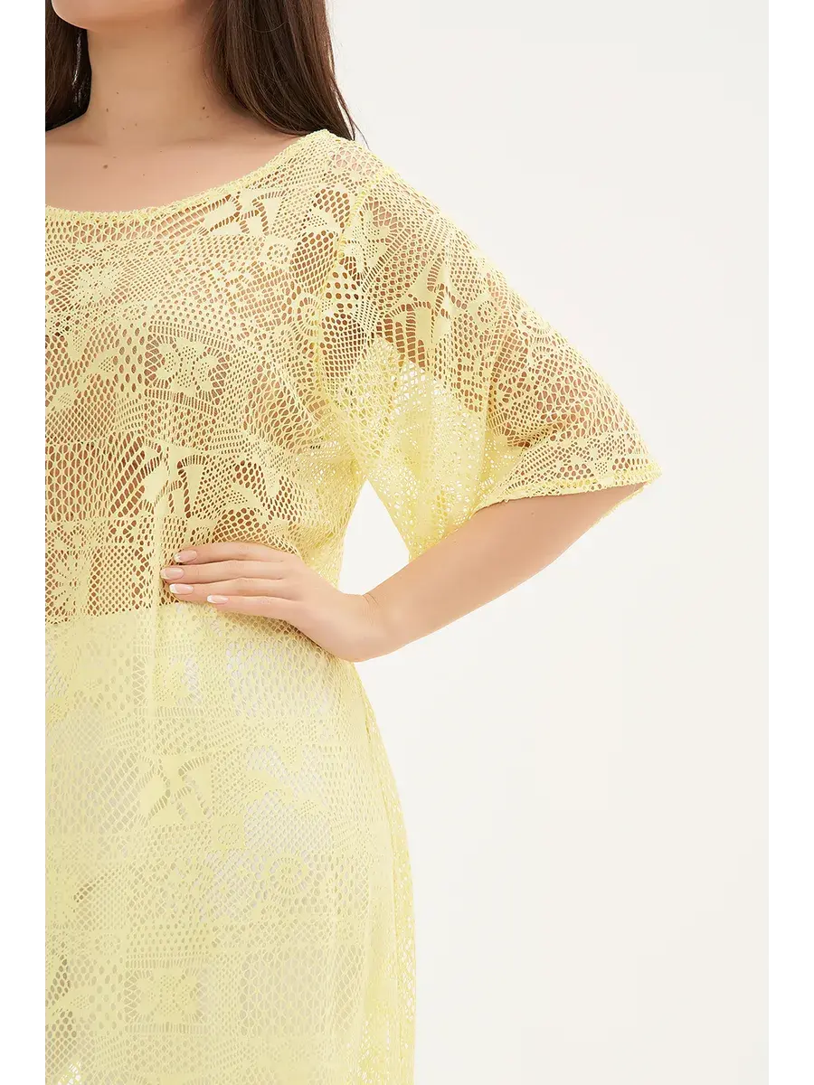 Пляжное платье - туника сетка женская больших размеров от бренда Олси, выполнена из узорного полупрозрачного материала. Идеальный вариант на купальник. Модель для полных женщин, с широким рукавом, скрывает проблемные зоны, пропорции накидля для пляжного отдыха визуально удлиняют силуэт. Также можно стилизовать изделие для повседневного ношения летом на отдыхе, или в городе.